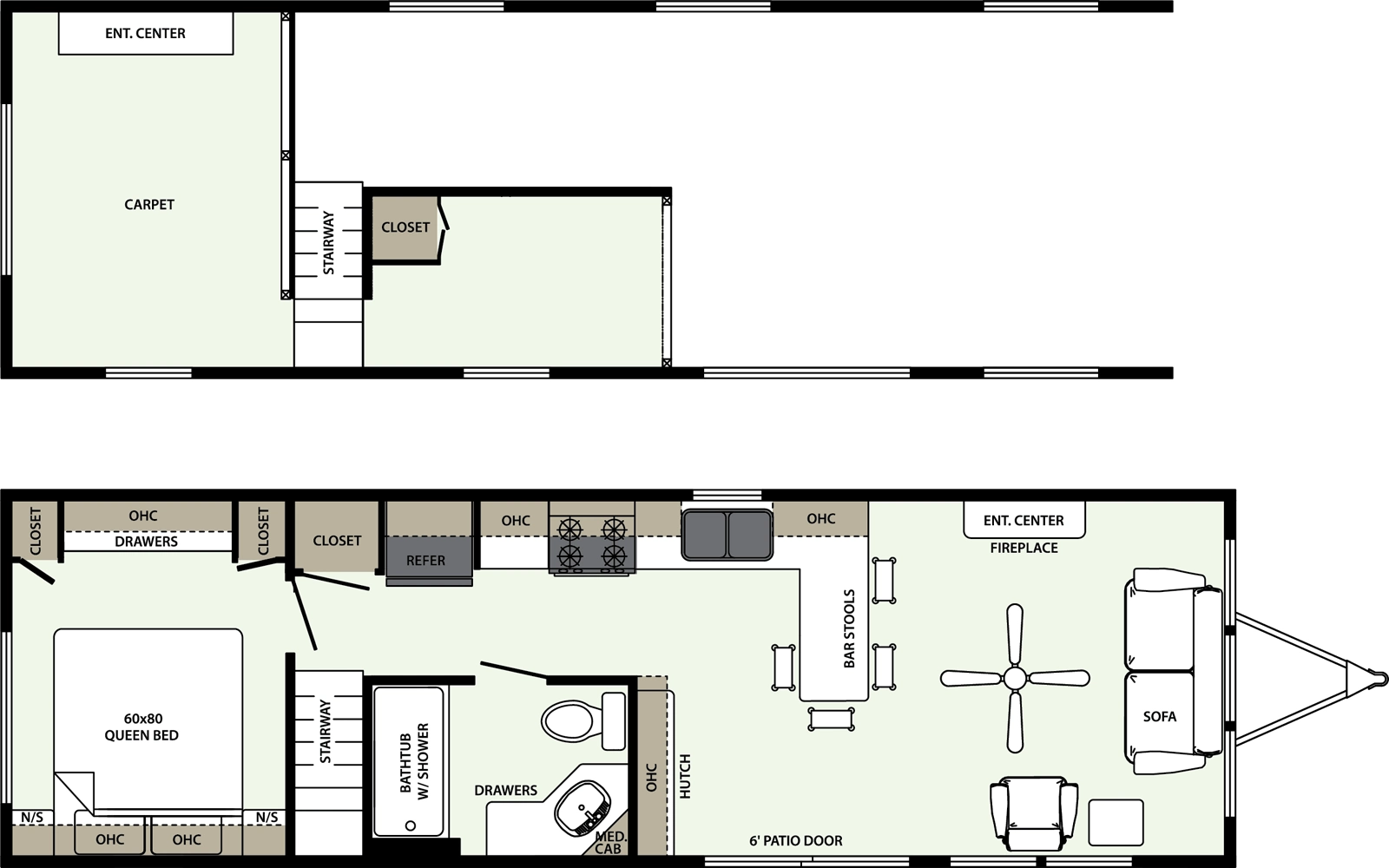 With 396 sq ft, the 39 FLSKL offers a loft that maximizes vertical space and adds cozy sleeping quarters. Carpeted stairs lead up to a raised area, freeing the main floor for open living, relaxing, and entertaining. Rugged insulation and a welded steel chassis make it built for seasonal and extended campground stays.