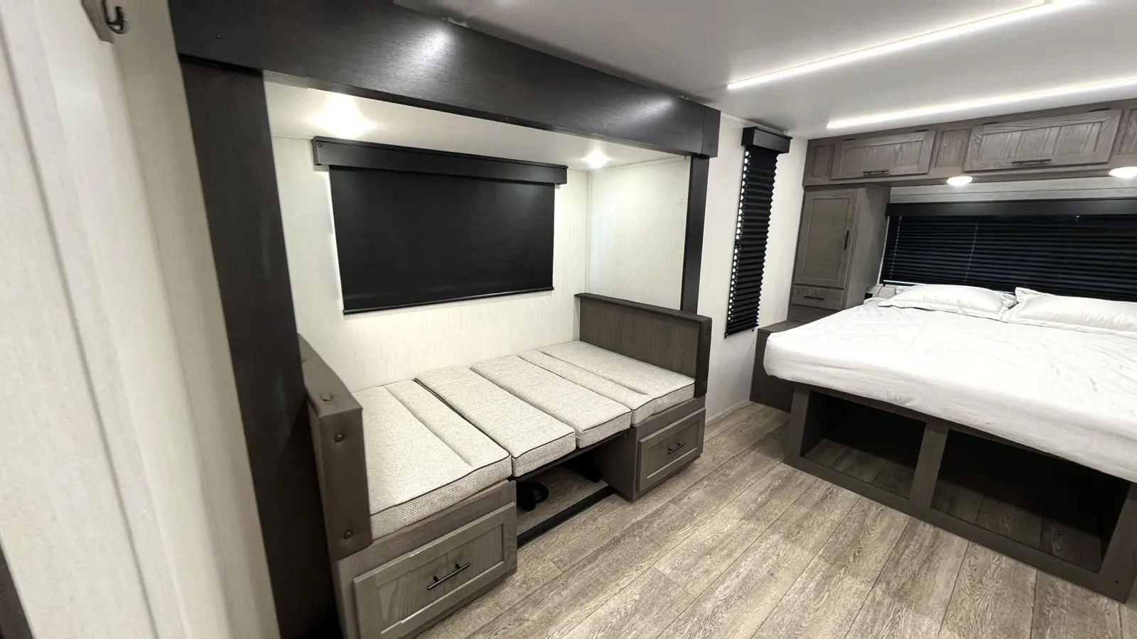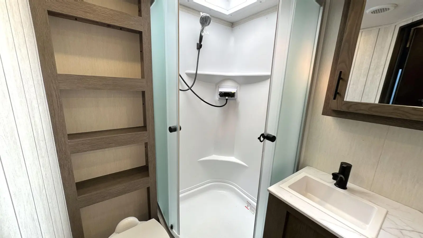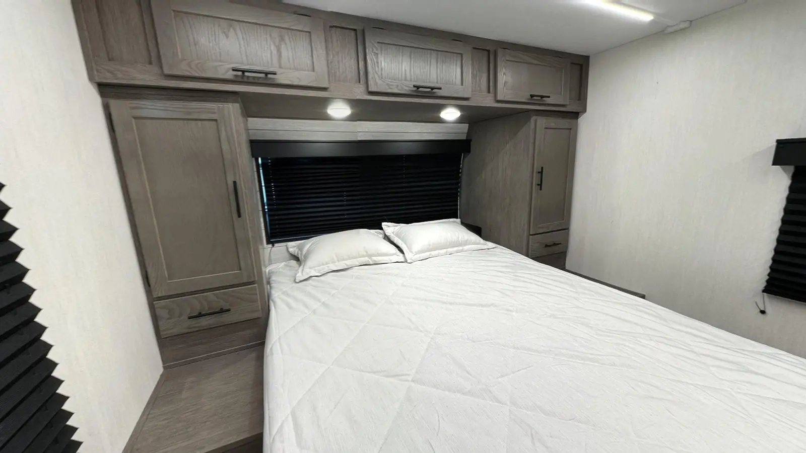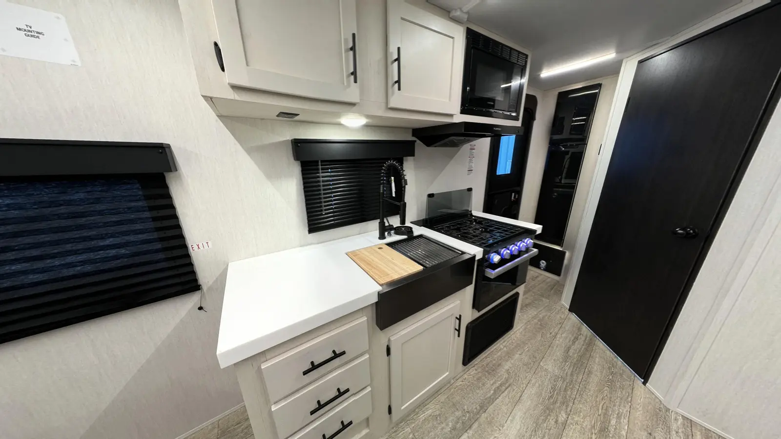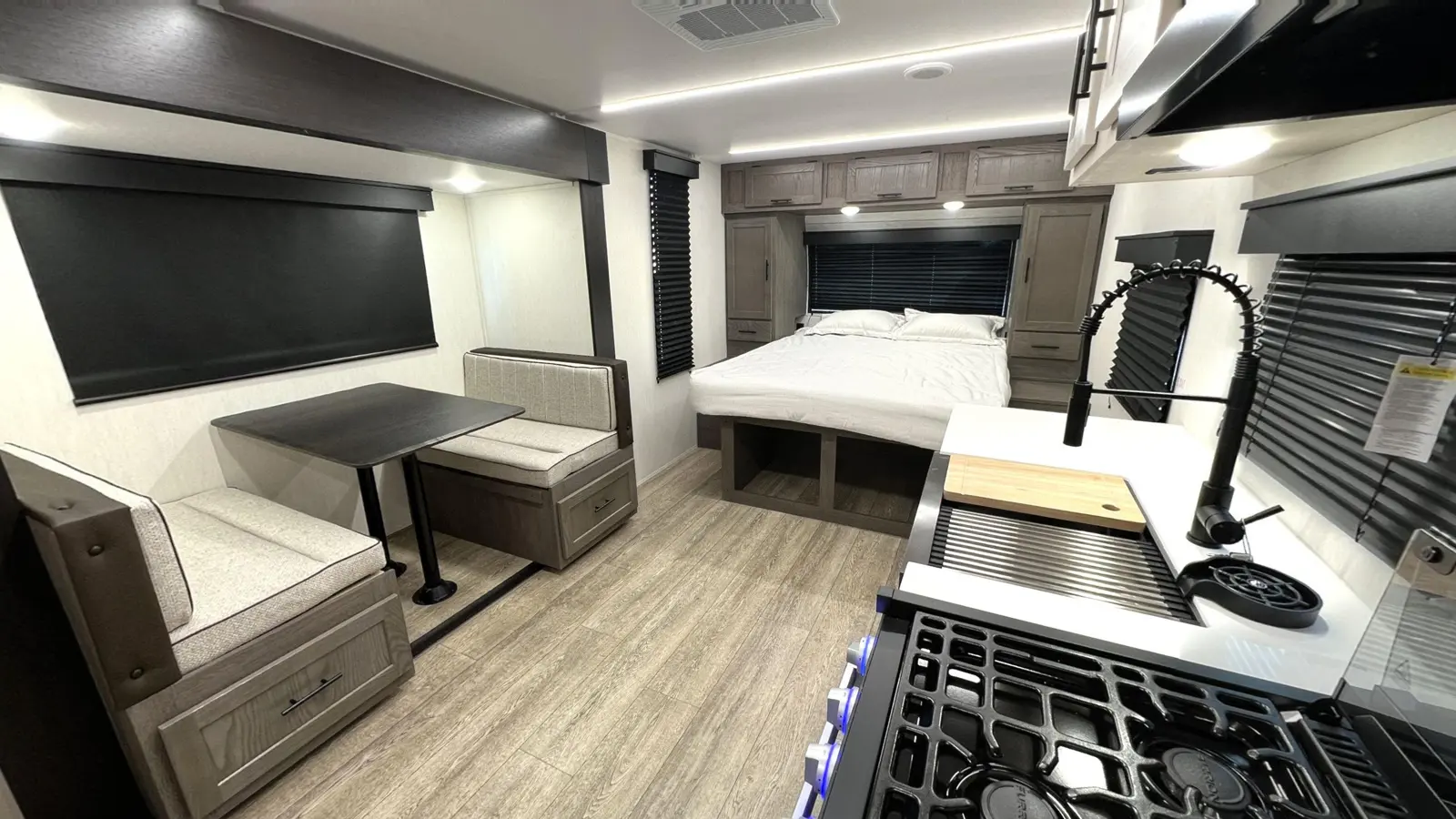 Coming in at 23 ft 1 in, the Alpha Wolf 17CB by Forest River is the shortest and lightest model in our lineup. This makes for an easy towing experience and wide range of campsites available to you on your journeys. In the rear you'll find a full bathroom that features a spacious corner shower, medicine cabinet and plenty of linen storage. Chef's will appreciate the well-equipped kitchen that includes a 12-volt refrigerator, oven, microwave, farm style sink and dinette that converts into a bed.