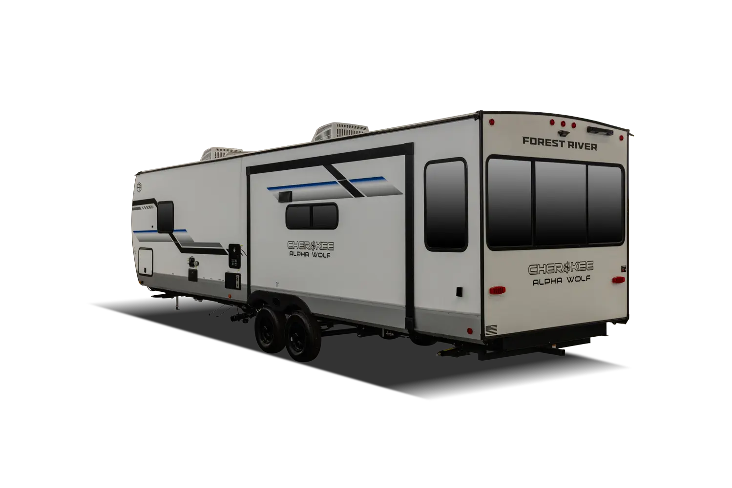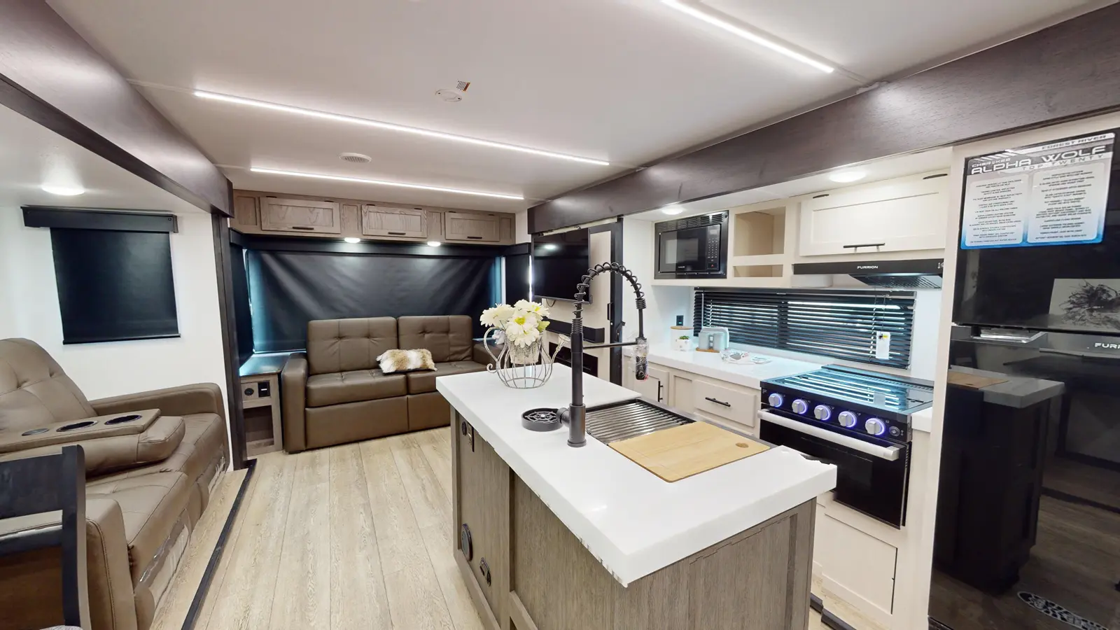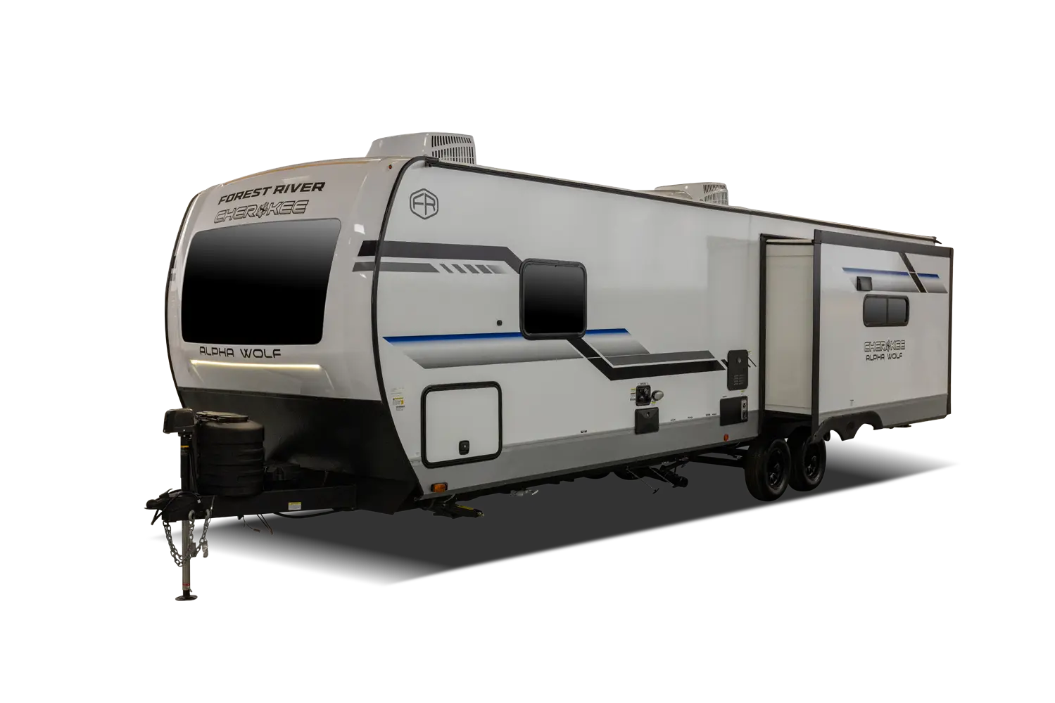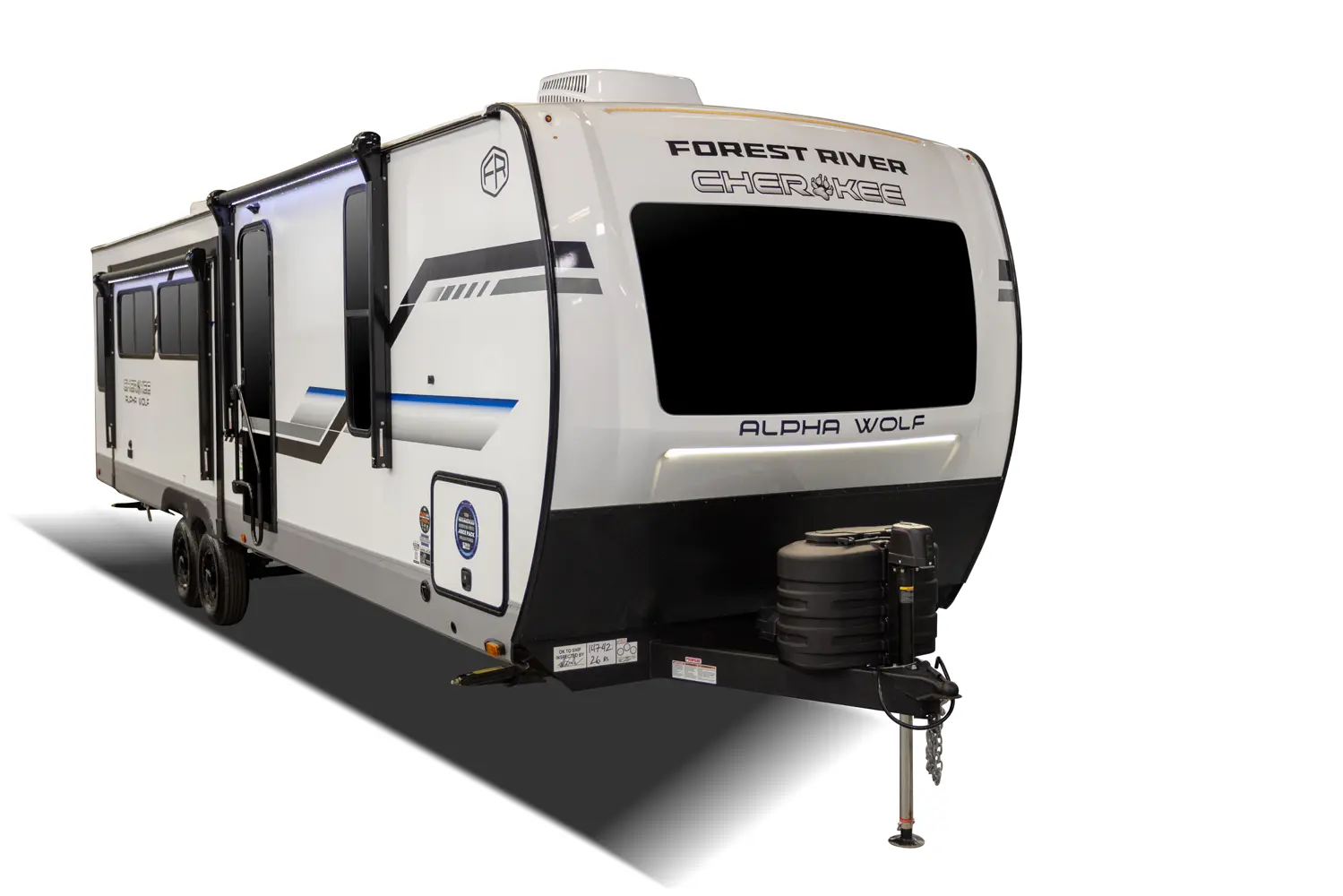 The Alpha Wolf 26RL by Forest River takes a popular 5th wheel design and brings it into a smaller form factor! Stretch out and relax with a queen size bed and ample wardrobe space in the bedroom. The spacious living area features oversized windows, perfect for enjoying the scenery. A beautiful island highlights the kitchen along with a 12-volt refrigerator, oven, microwave and built-in trash can. Easy to tow and perfect for your next adventure!