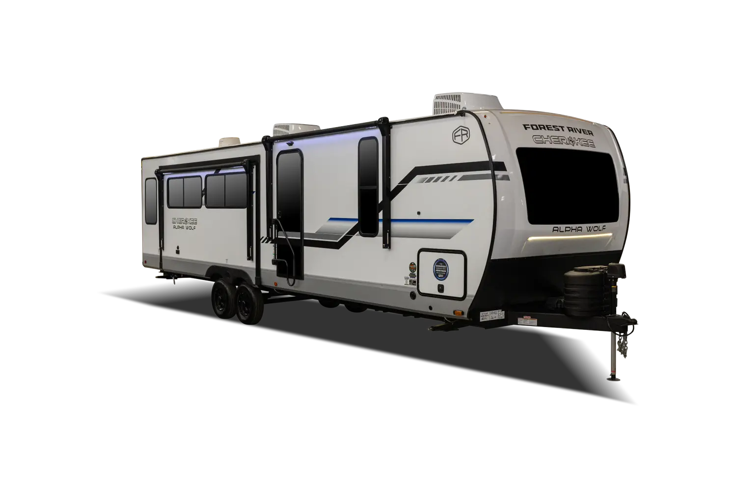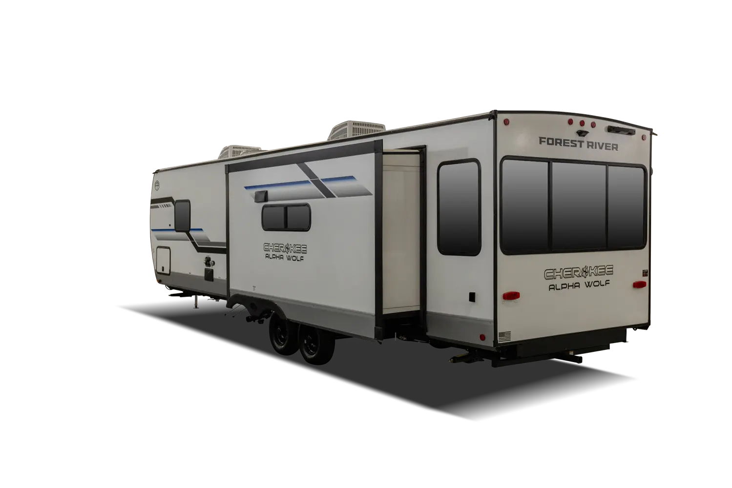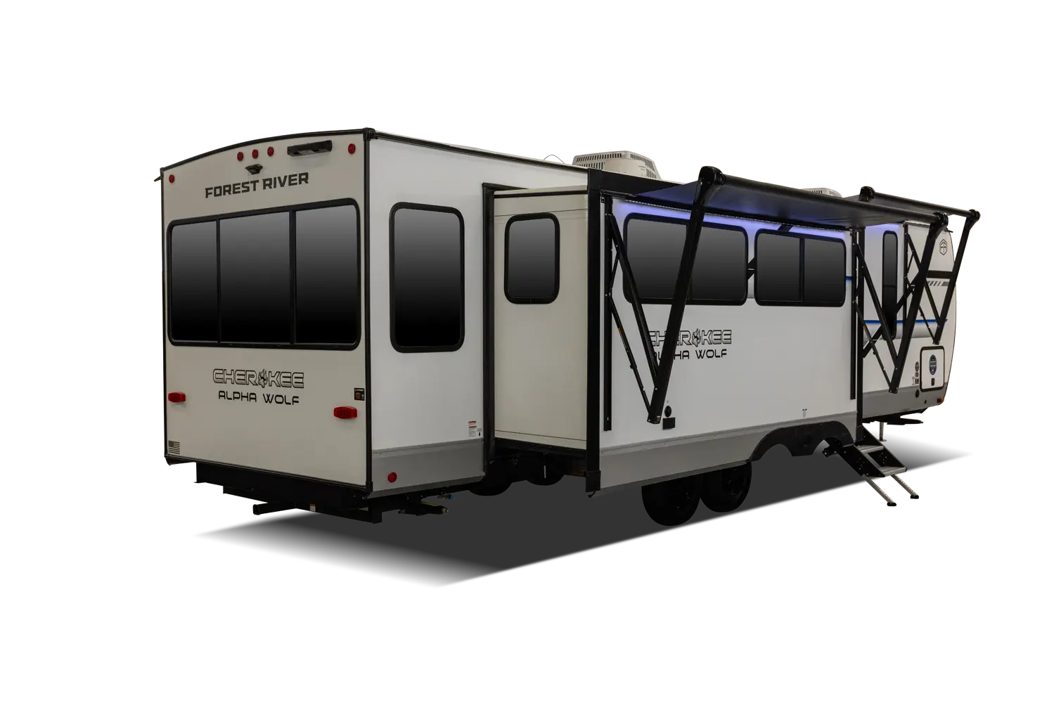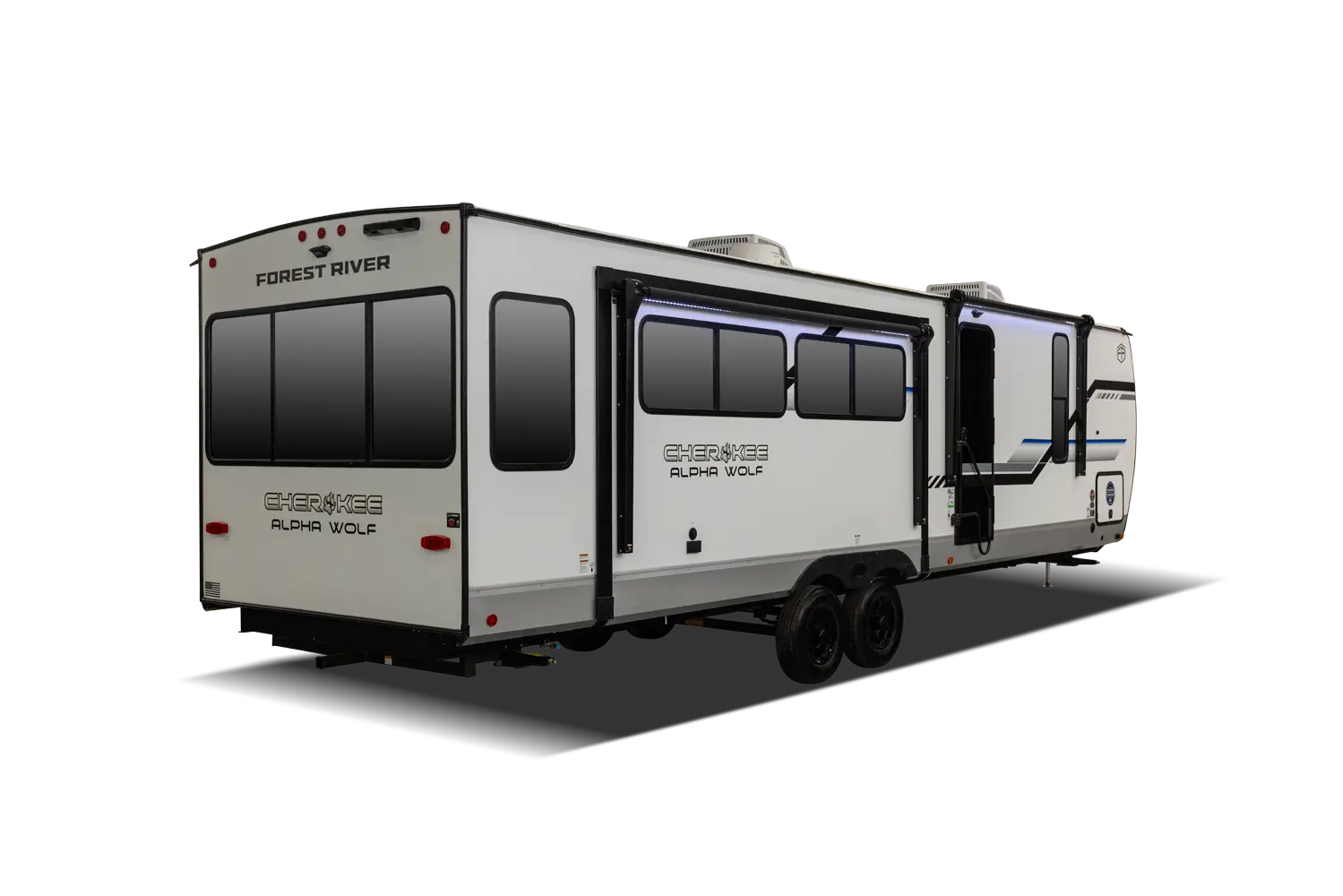 The Alpha Wolf 26RL by Forest River takes a popular 5th wheel design and brings it into a smaller form factor! Stretch out and relax with a queen size bed and ample wardrobe space in the bedroom. The spacious living area features oversized windows, perfect for enjoying the scenery. A beautiful island highlights the kitchen along with a 12-volt refrigerator, oven, microwave and built-in trash can. Easy to tow and perfect for your next adventure!