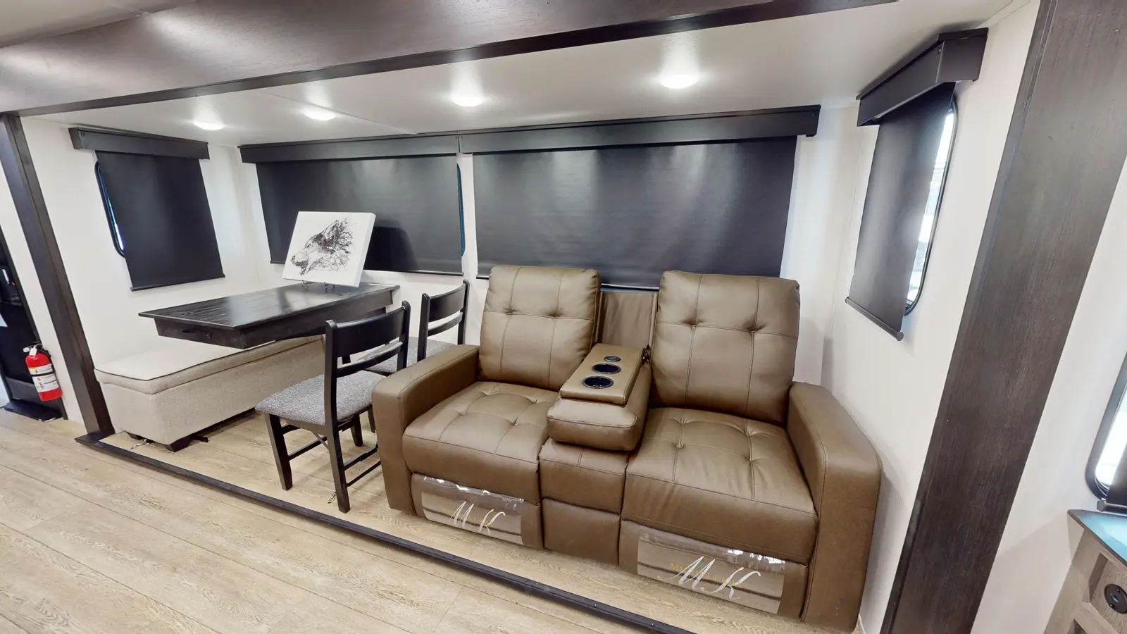 The 26RL has two slideouts and one entry. Exterior features an 11 foot and 9 foot awning, solid step entry, outside storage, and rear accessory hitch. Interior layout front to back: foot-facing queen bed with overhead cabinet and wardrobes on each side; off-door side full bathroom with linen closet, medicine cabinet, and porcelain stool; entry door; hutch with overhead cabinet and pantry along inner wall; kitchen island with sink, trash can, and central vacuum; off-door side slideout with 12 volt refrigerator, kitchen counter with cooktop, overhead cabinet with microwave, and an entertainment center with fireplace below and hidden pantry behind; door side slideout with free-standing table with storage drawer and chairs with storage ottoman, and theater seating; rear tri-fold sofa with overhead cabinet and panovision window.