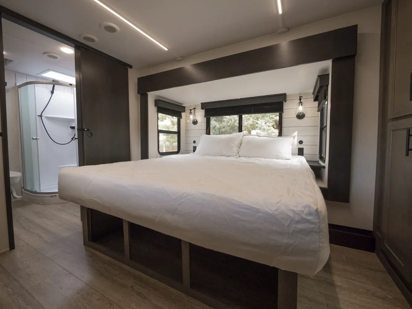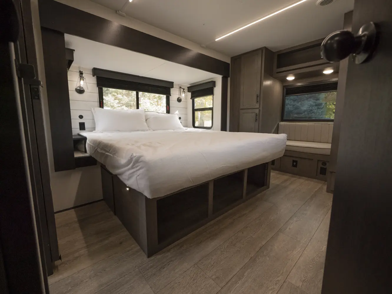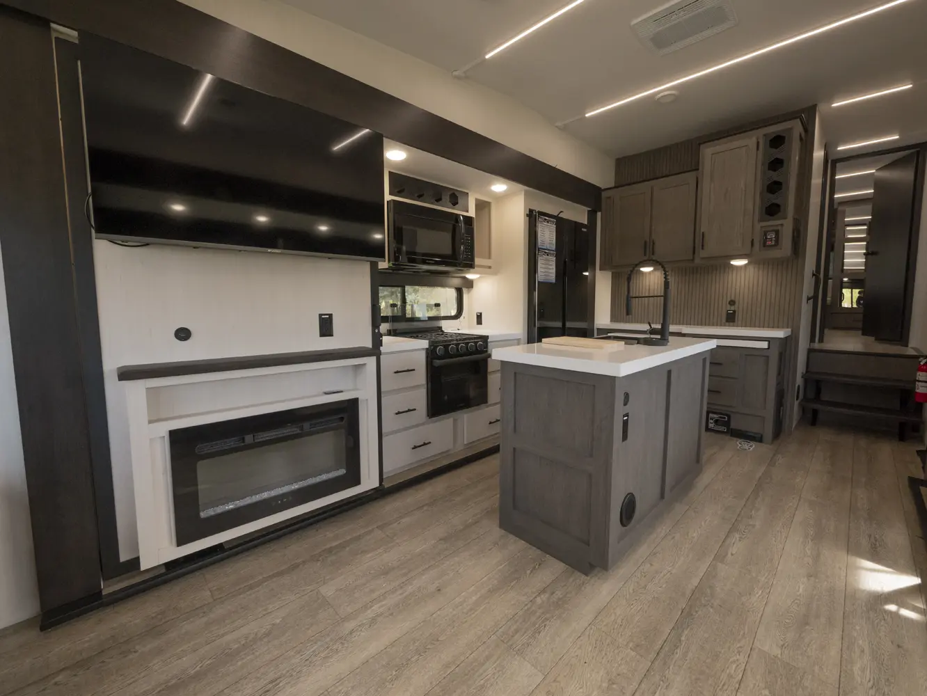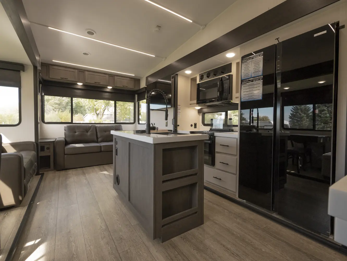The Arctic Wolf 3250SUITE is perfect for couples and solo travelers alike with a spacious open concept design. The rear living room is flanked by big windows for natural light and the entertainment center doubles as a hidden pantry. In the modern island kitchen, you'll find a 16 cu. ft. refrigerator, 30" microwave, oven and a spacious dinette. Up front is a king size bed, full bathroom, sun bench and lots of great wardrobe space.