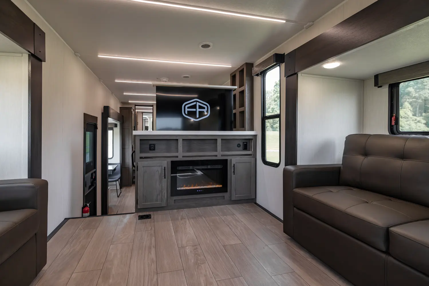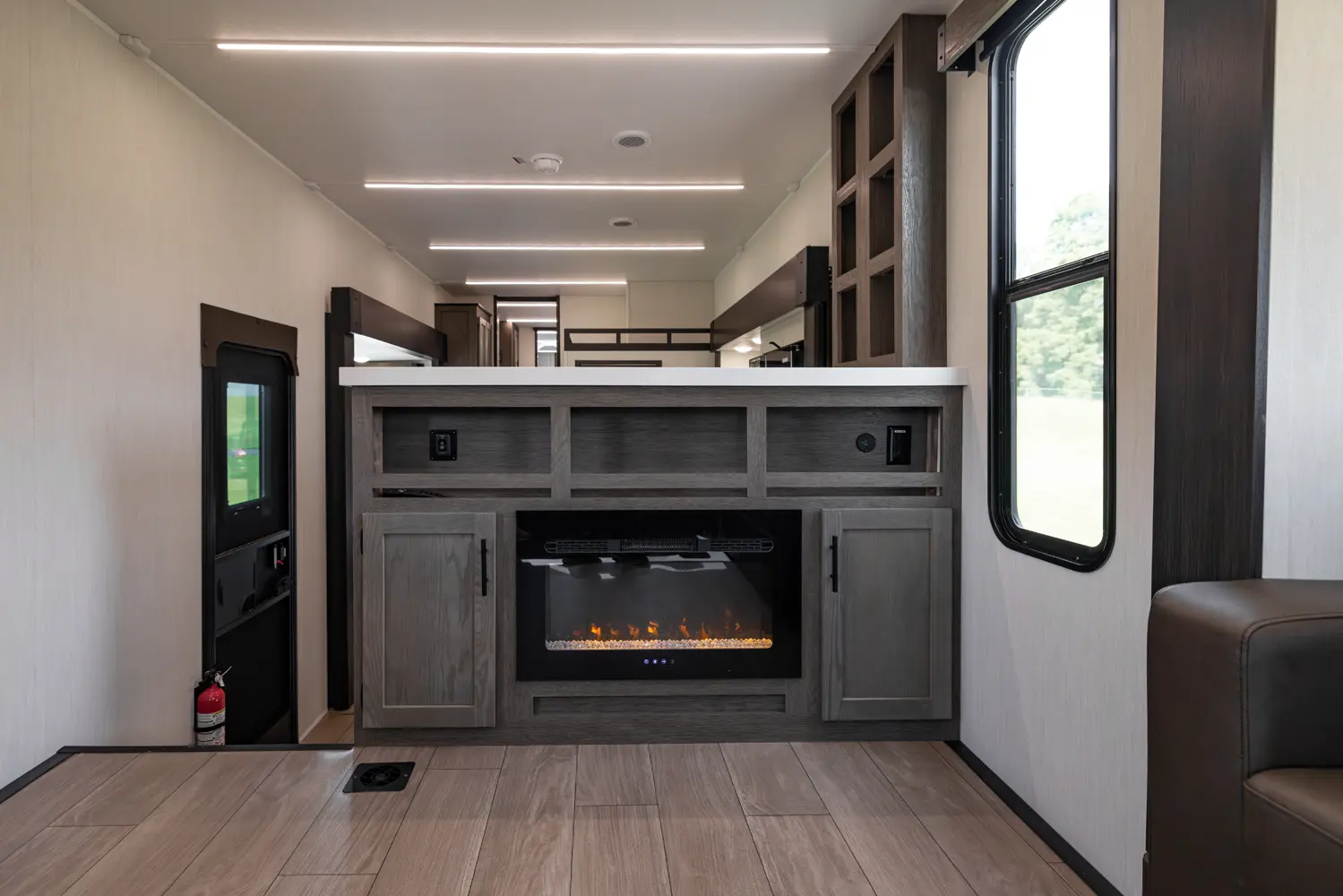 If you enjoy entertaining guests, you're going to love the Arctic Wolf 3950SUITE by Forest River! Our front living room features two tri-fold sleeper sofas and relaxing theatre seating directly across from the cozy fireplace. The island kitchen is highlighted by two 10 cu. ft. refrigerators, 30" microwave, oven, dinette seating and a half bathroom. In the primary suite you'll find a king size bed, fireplace, ample wardrobe space and an incredible bathroom with washer and dryer prep.