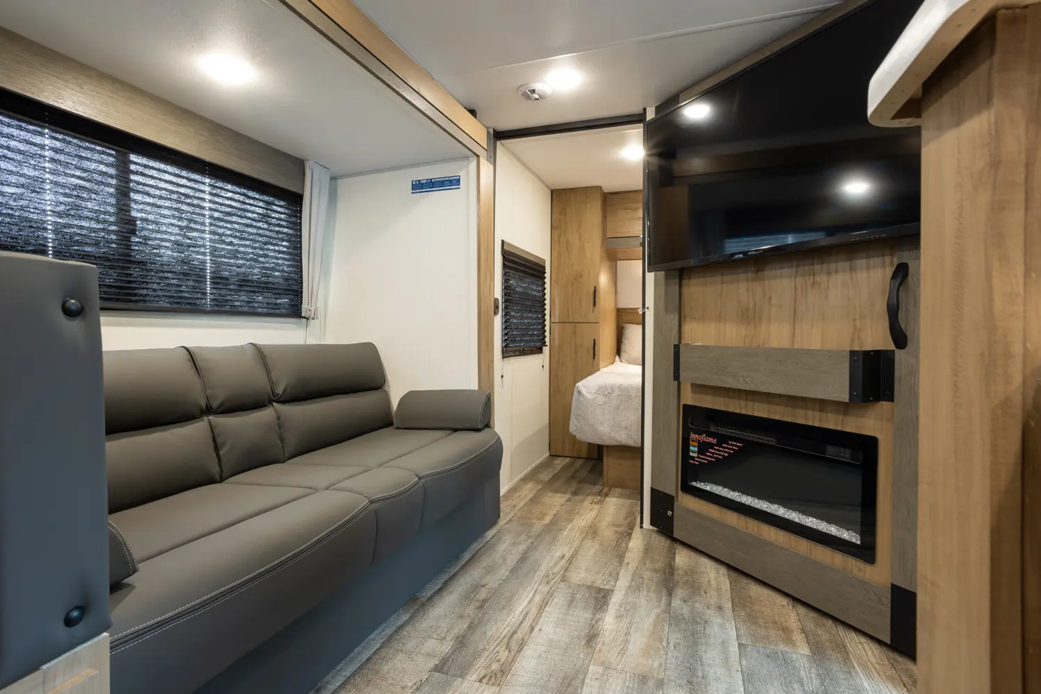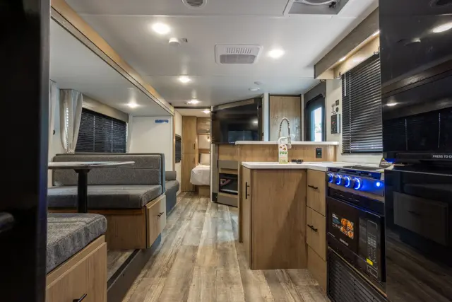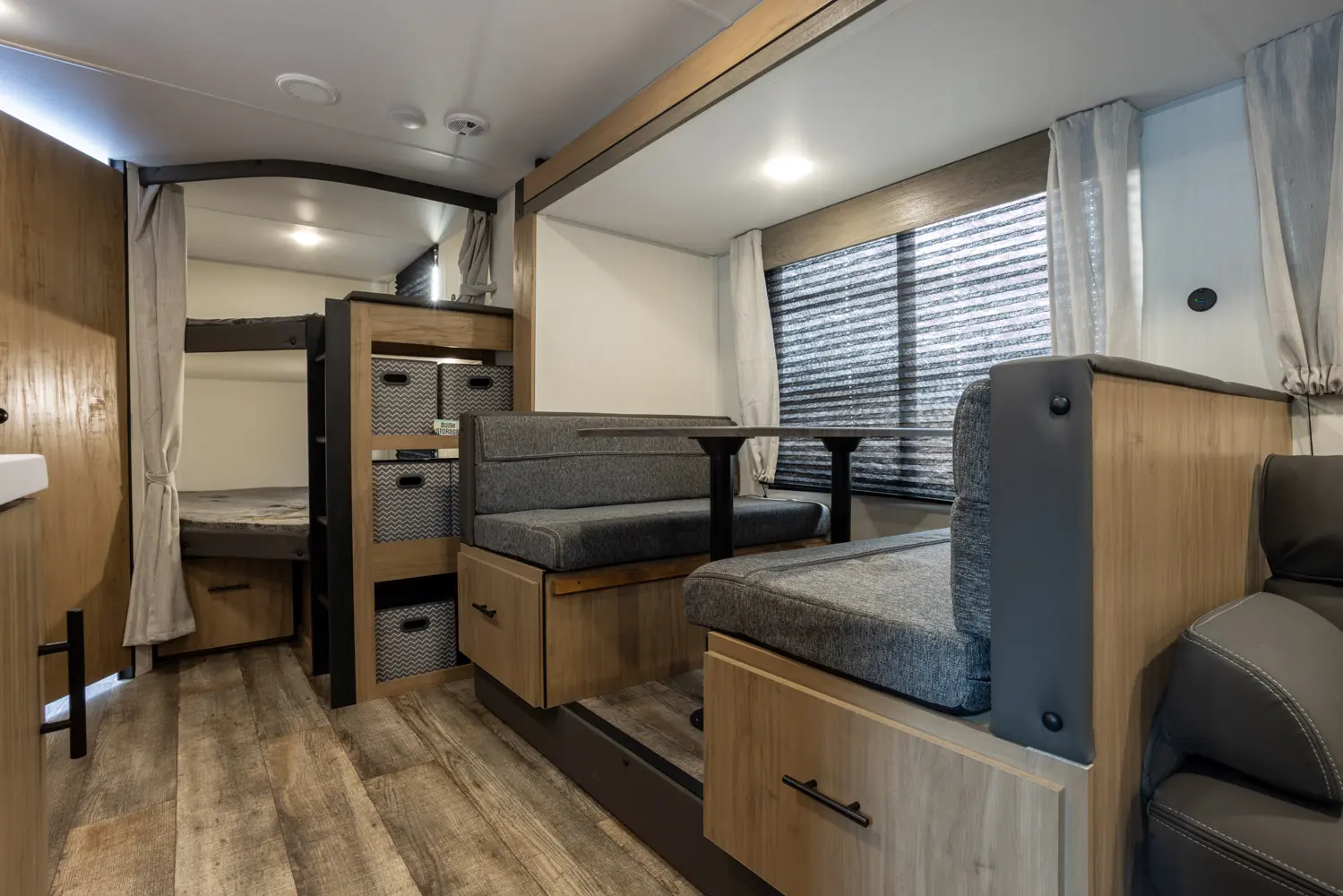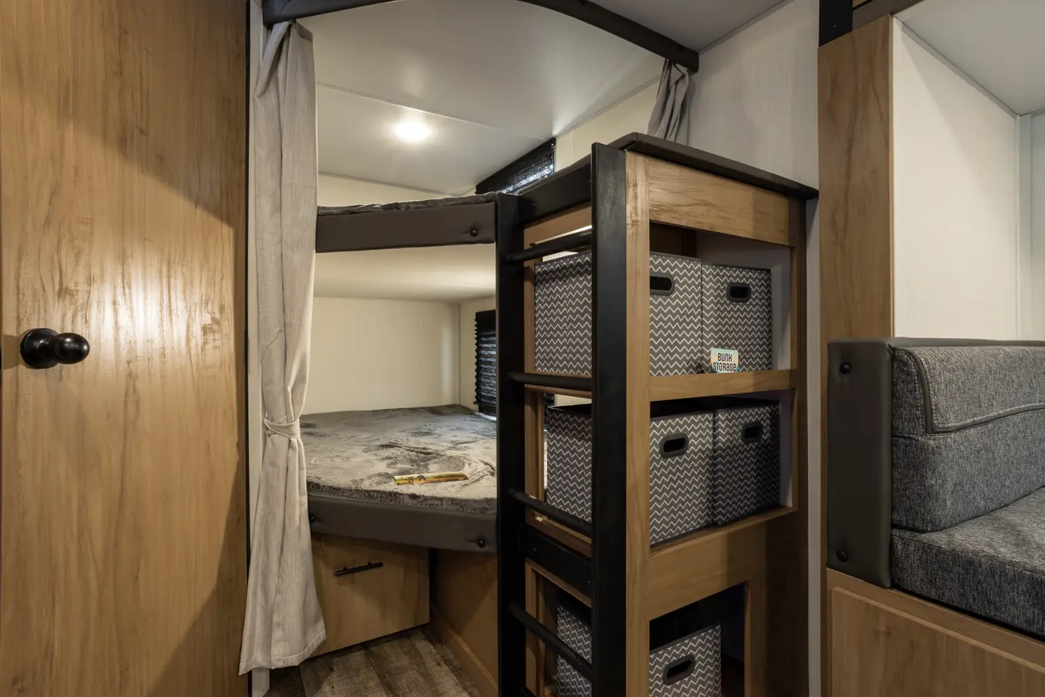 The Campsite Reserve 26CJ floorplan has two entries and one slide out. Exterior features include: metal exterior and outside kitchen. Interiors features include: bunk beds and front bedroom.