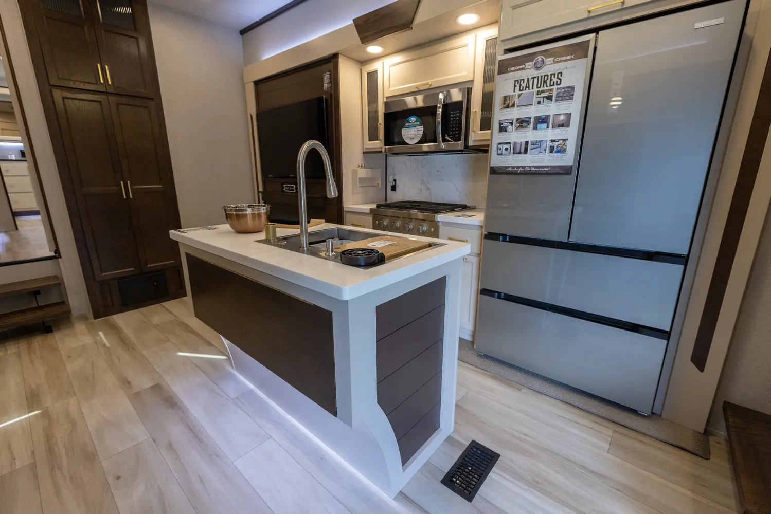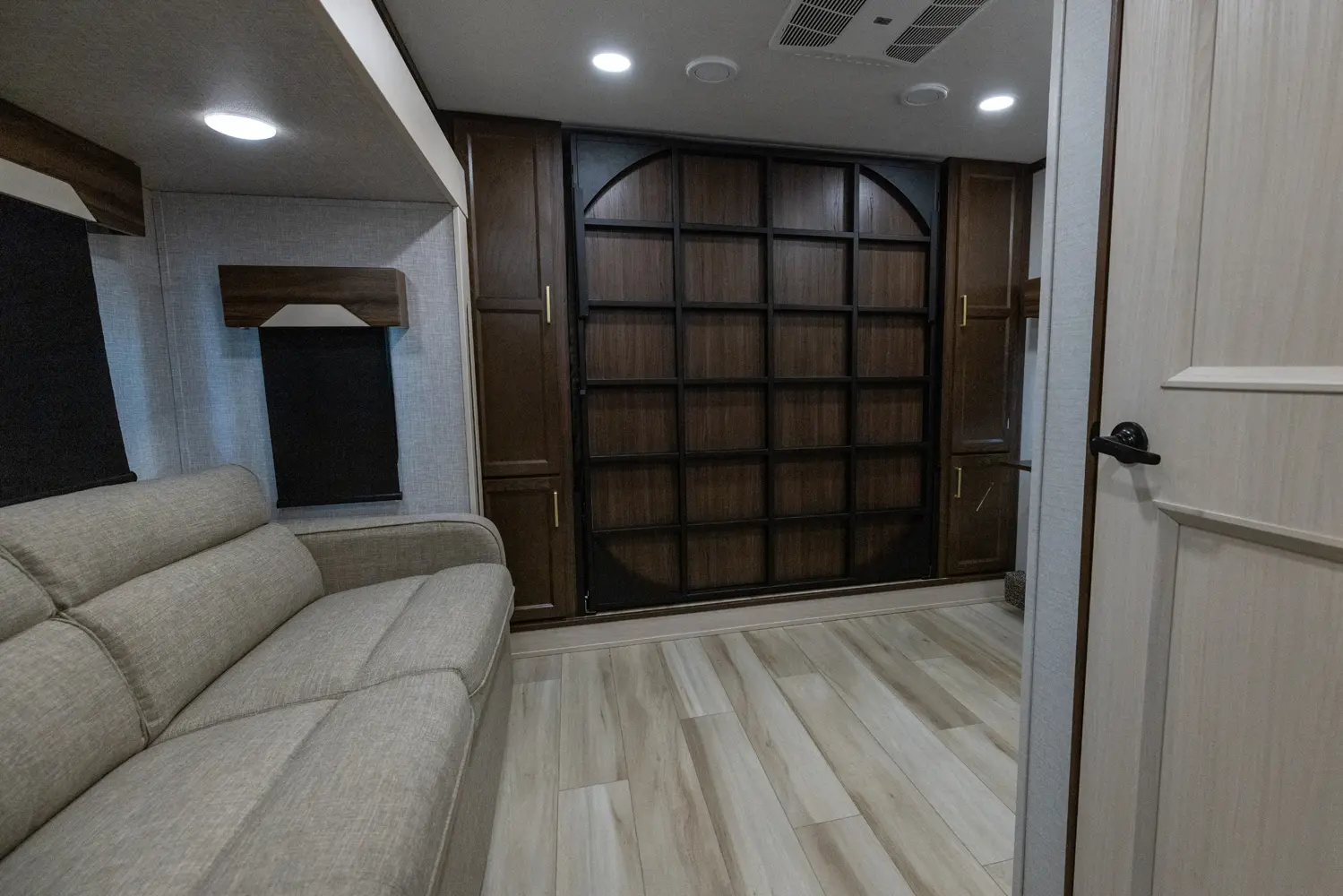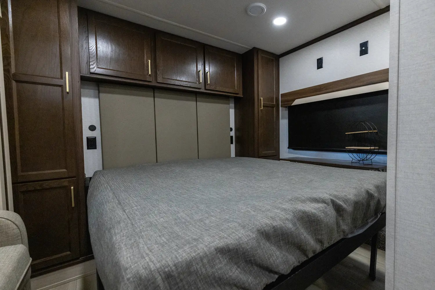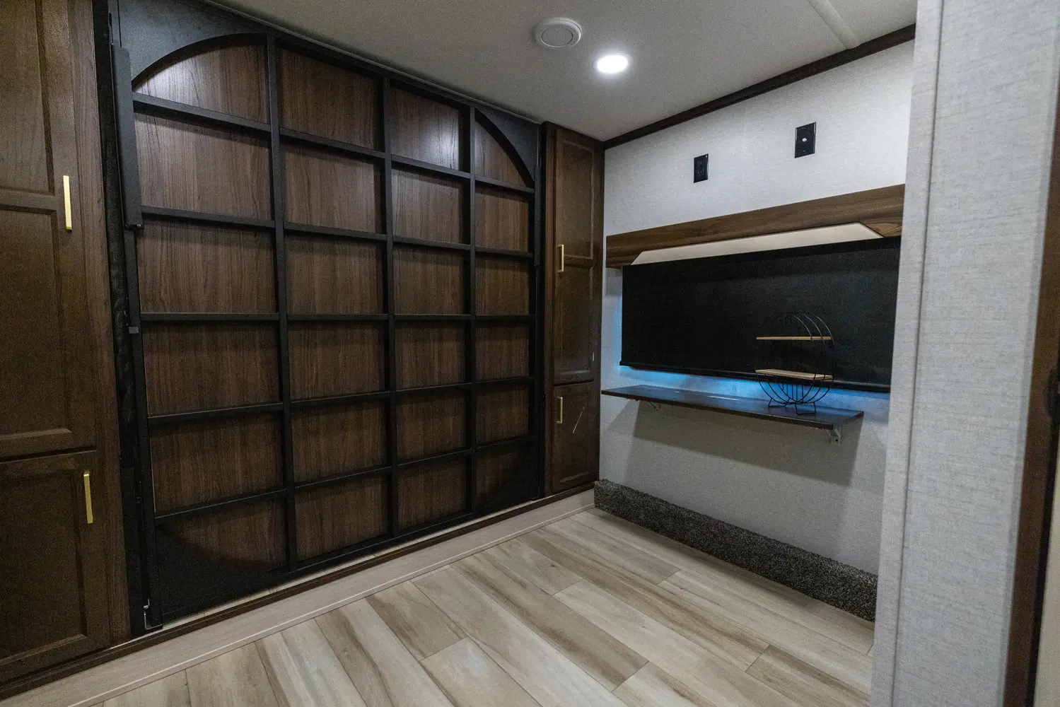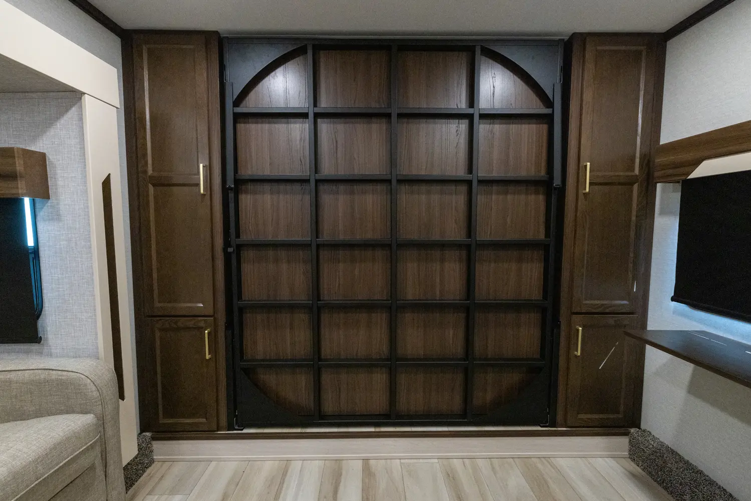 The Cedar Creek 381MUD has one entry and four slide outs. Exterior features include: fiberglass exterior and 15' & 18' awning. Interiors features include: loft, kitchen island, murphy bed and rear bathroom.