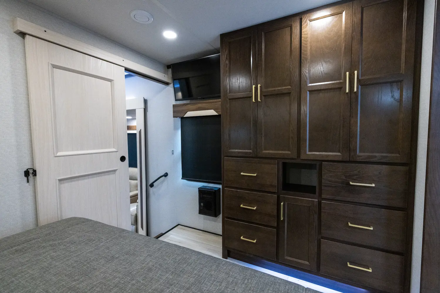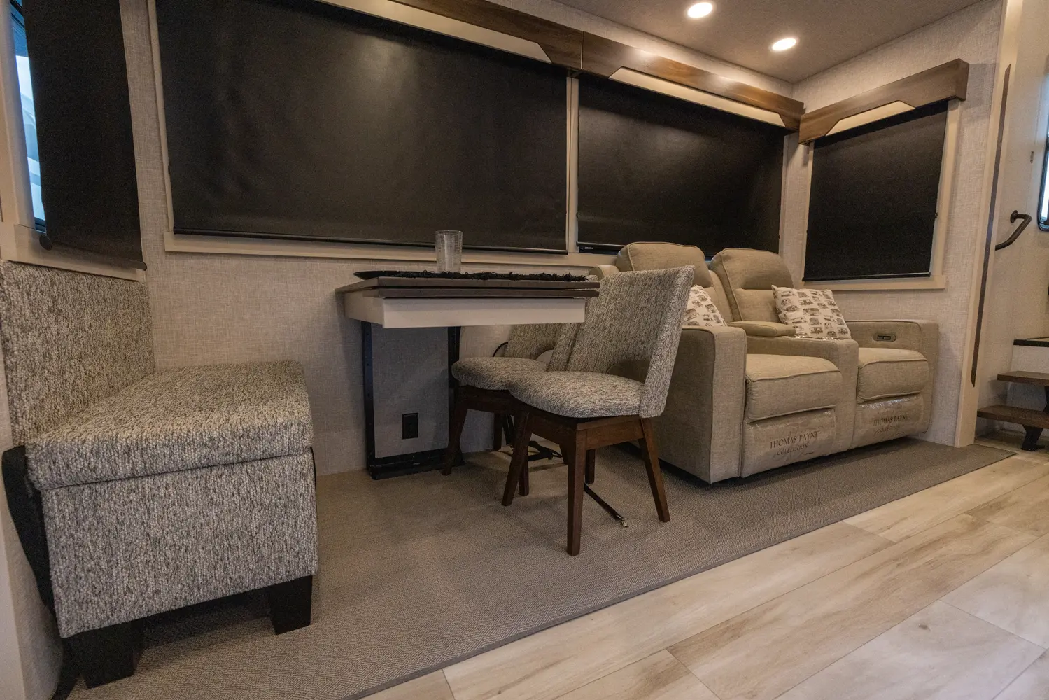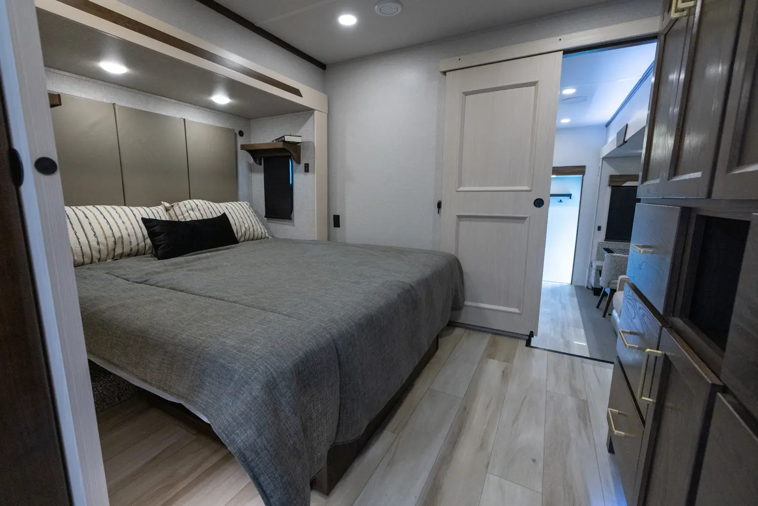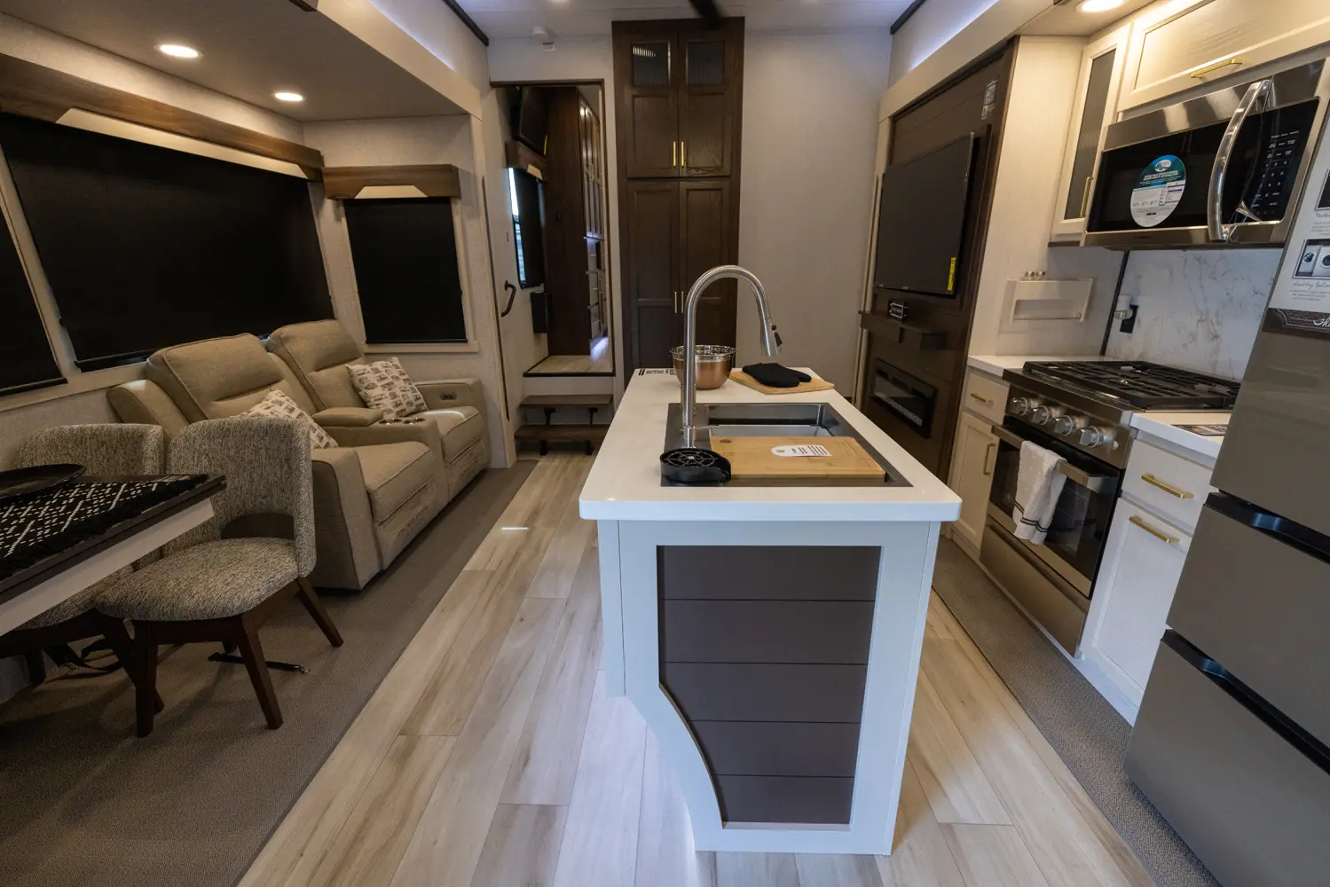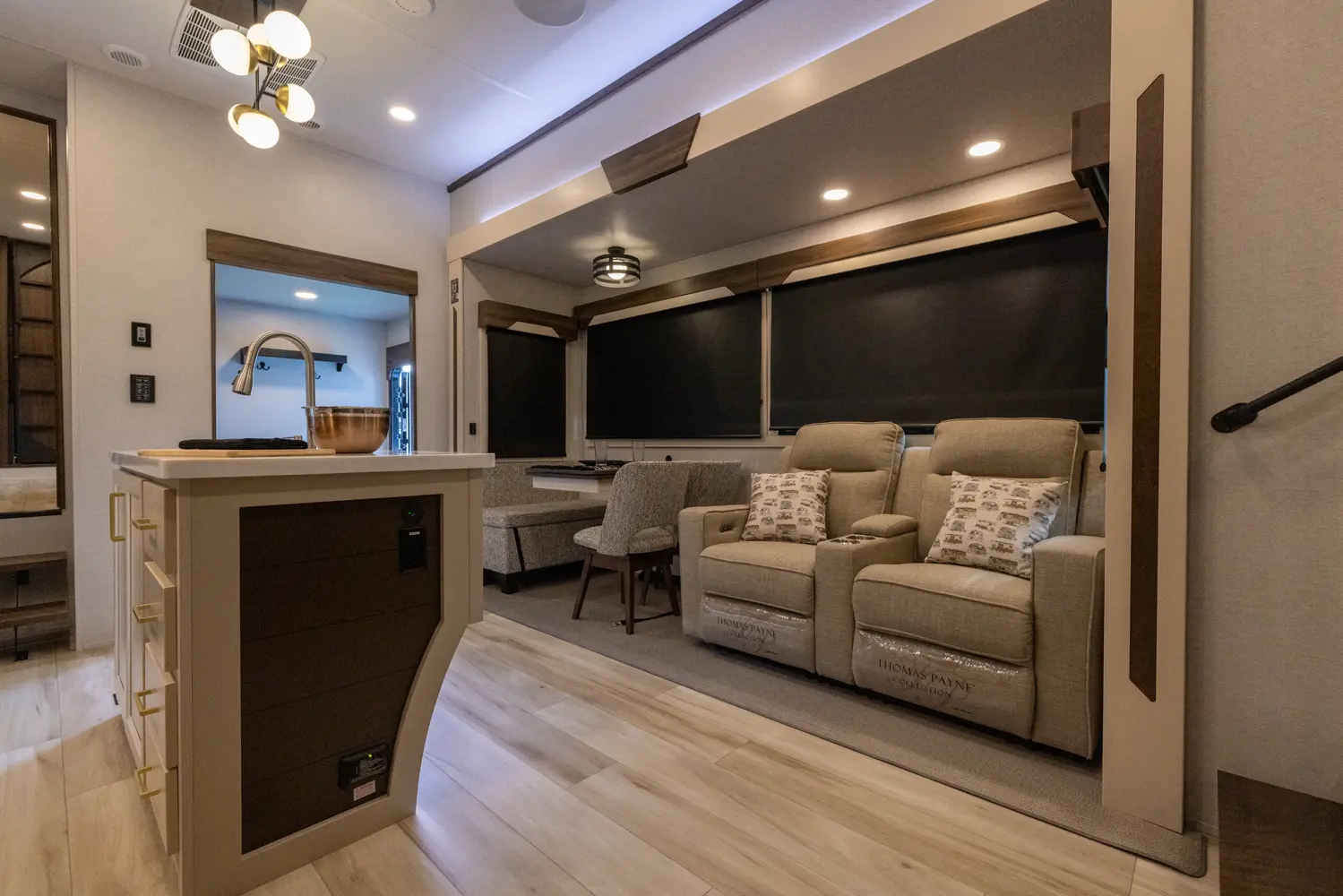 The Cedar Creek 381MUD has one entry and four slide outs. Exterior features include: fiberglass exterior and 15' & 18' awning. Interiors features include: loft, kitchen island, murphy bed and rear bathroom.