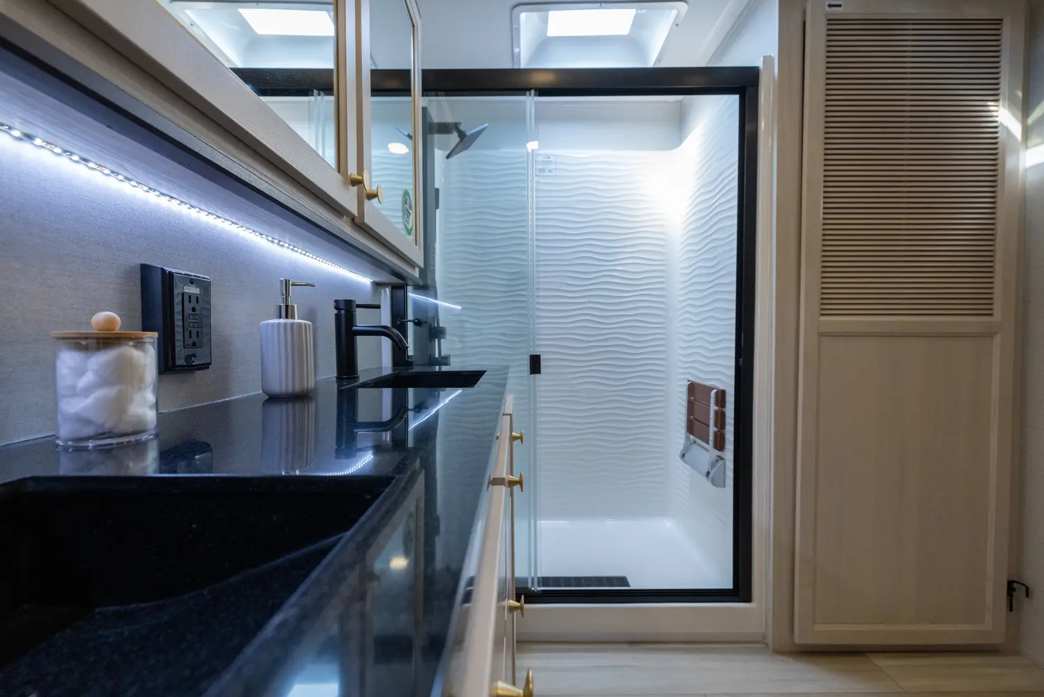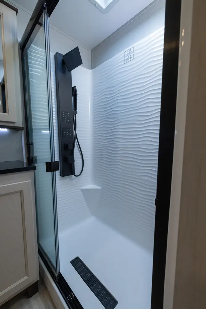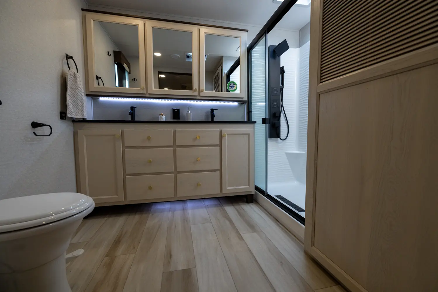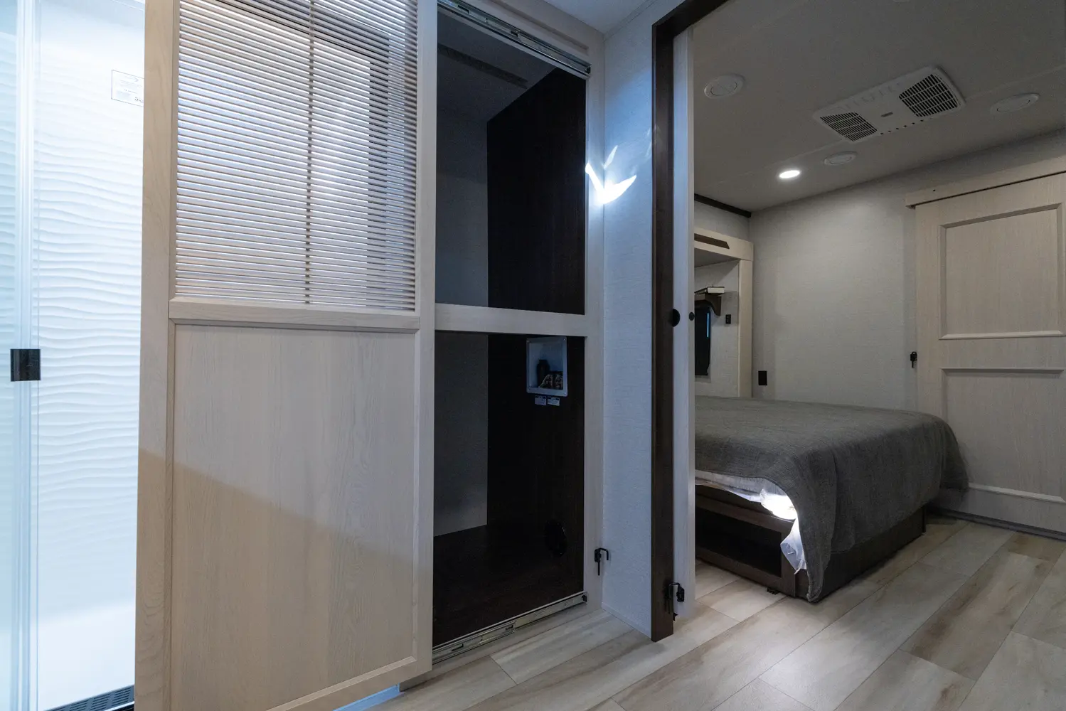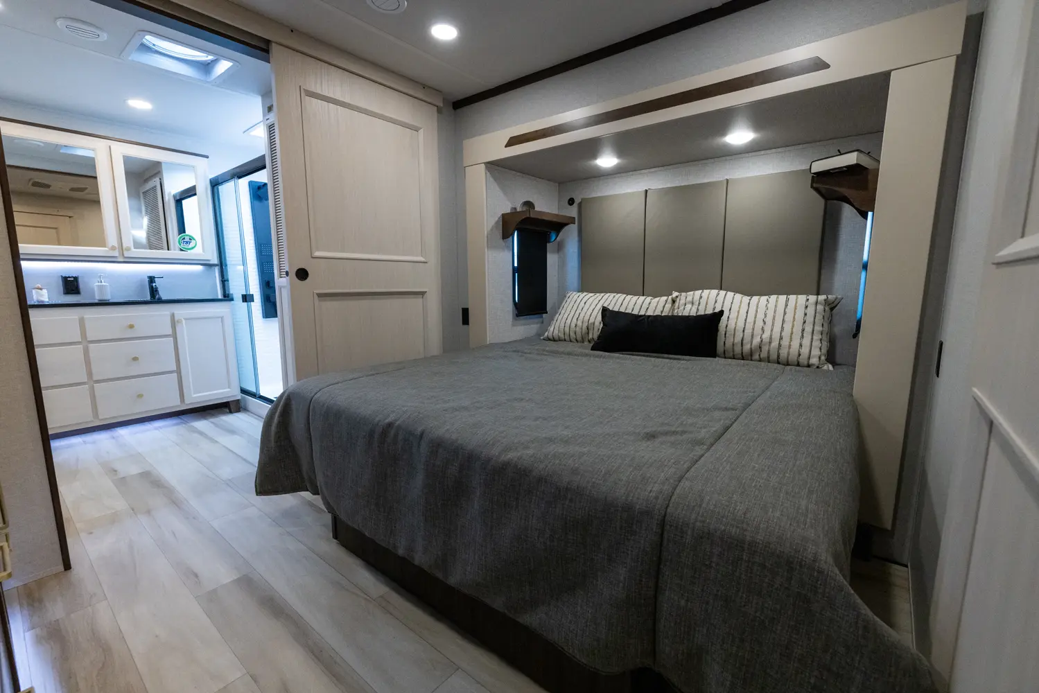The Cedar Creek 381MUD has one entry and four slide outs. Exterior features include: fiberglass exterior and 15' & 18' awning. Interiors features include: loft, kitchen island, murphy bed and rear bathroom.