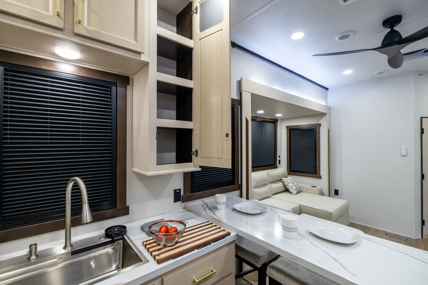 • Residential-Style Kitchen Island with Solid Surface Countertop with Flush mounted workstation sink