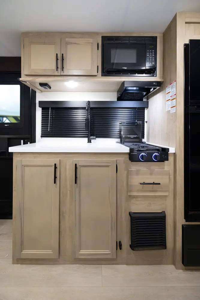• Cherokee Black Label Wolf Pup (Deep Tinted Frameless Automotive Glass Windows, High Gloss Gel Coat Exterior Sidewalls, Multicolor Reading Lights, Pillowtop Mattress Upgrade, Power Tongue Jack, Pull Out Sprayer Faucet, Solid Surface Countertops, Thermo Foil Arctic Insulation)