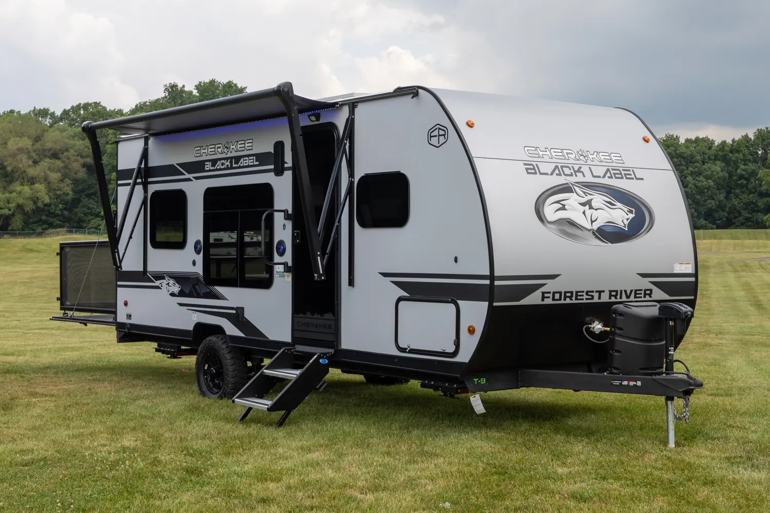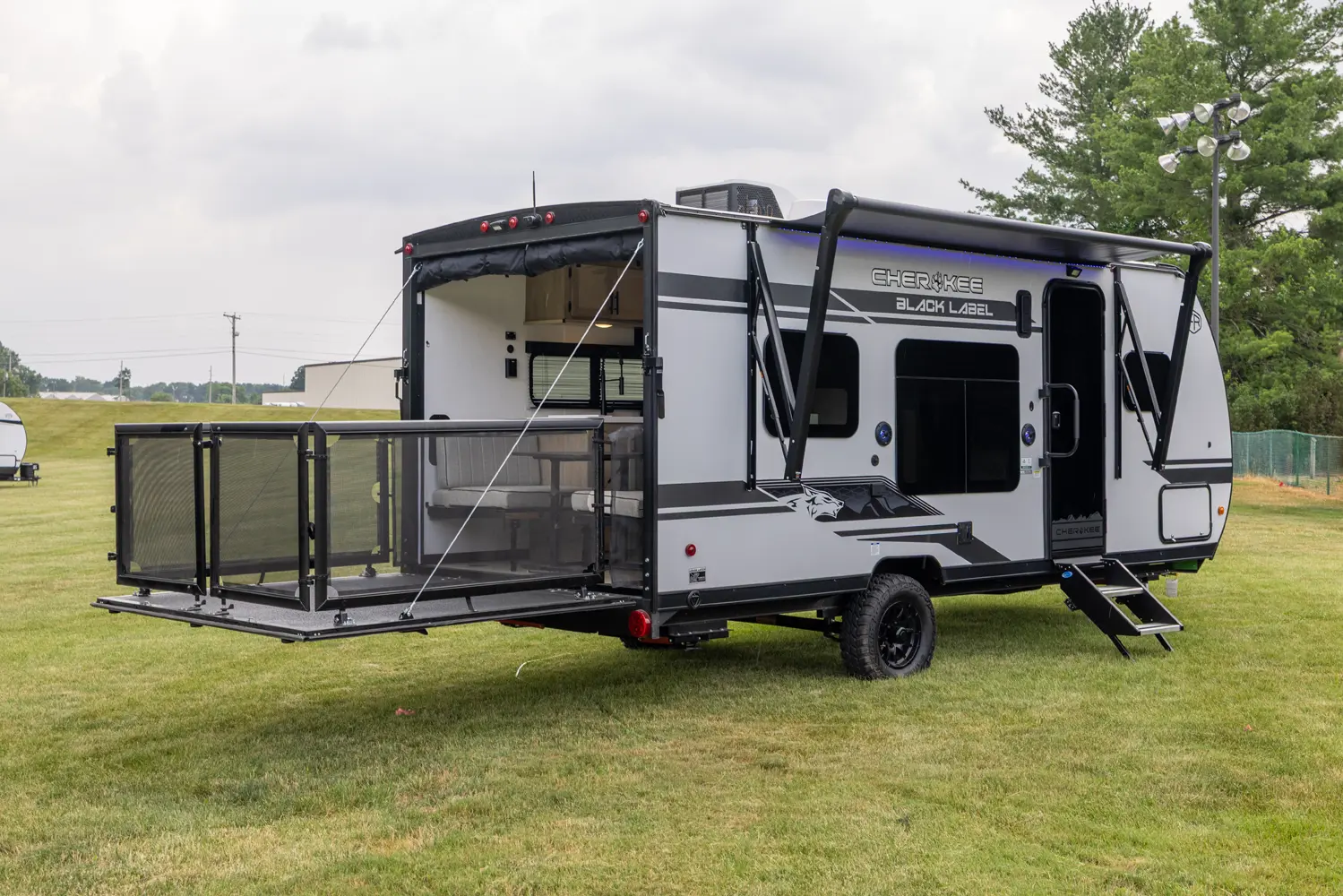 • Cherokee Black Label Wolf Pup (Deep Tinted Frameless Automotive Glass Windows, High Gloss Gel Coat Exterior Sidewalls, Multicolor Reading Lights, Pillowtop Mattress Upgrade, Power Tongue Jack, Pull Out Sprayer Faucet, Solid Surface Countertops, Thermo Foil Arctic Insulation)