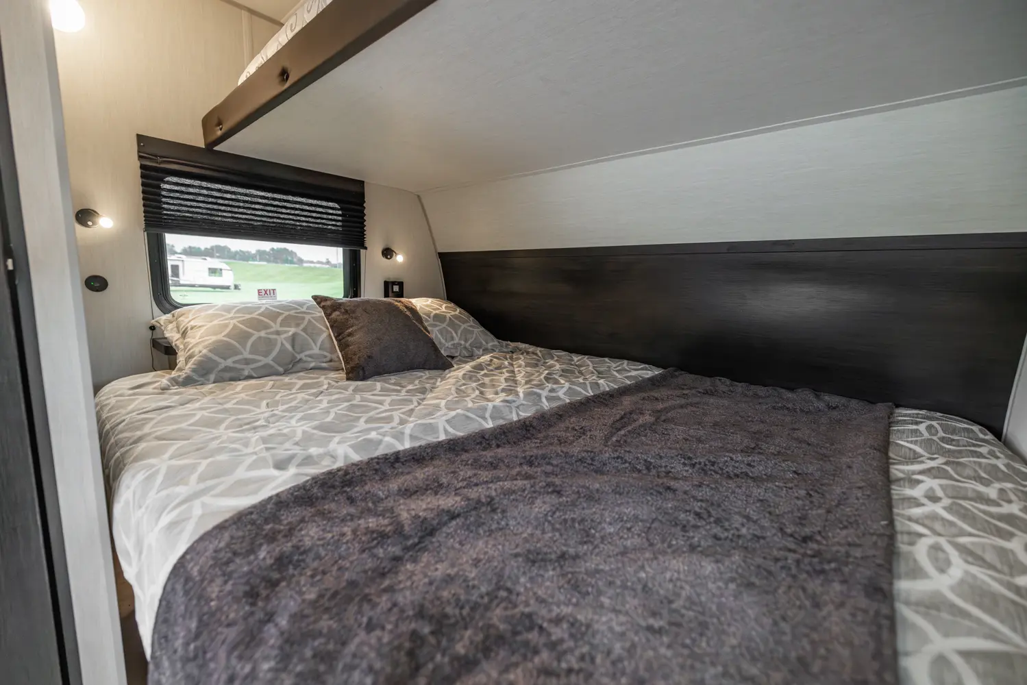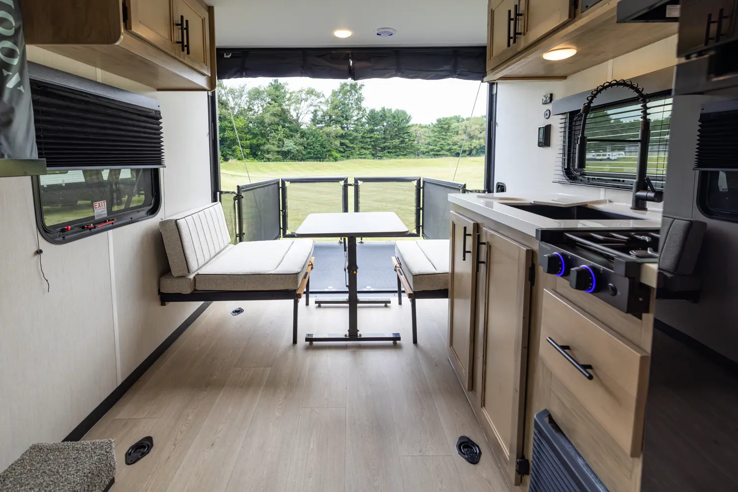The 18RJBWBL is what a small toy hauler should be with the right combination of size, weight, and storage capacity for your toys. A modern chef’s kitchen, dinette area, queen size bed with overhead bunk and functional bath highlight the interior of this unit. On the exterior the exclusive Pup patio system will give you a great elevated seating area. As with all Pups, our outside awning area is second to none. Entertain guests with our outside entertainment area with speakers, and TV bracket.