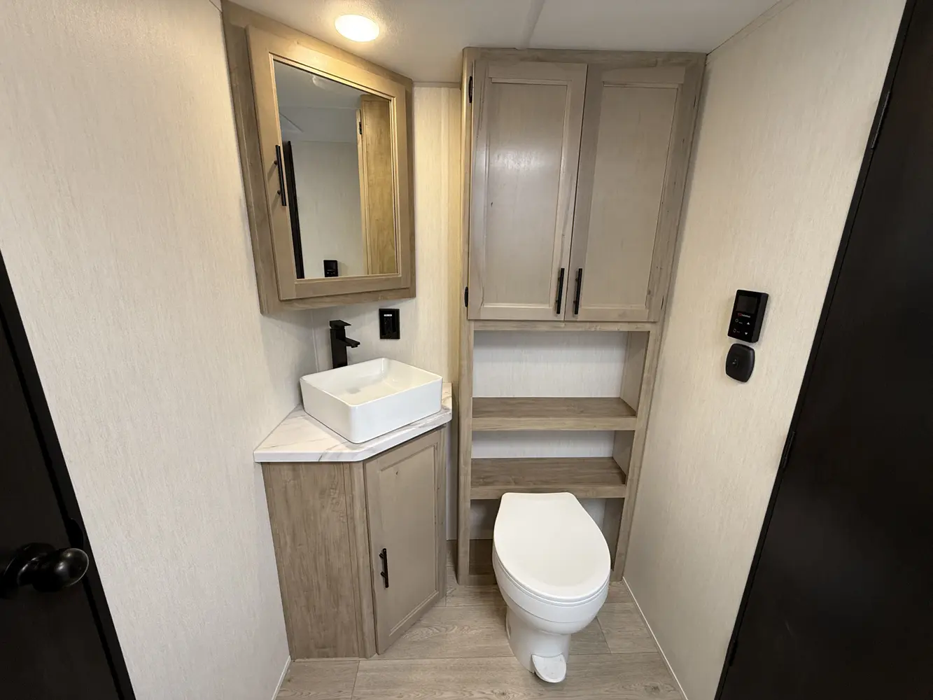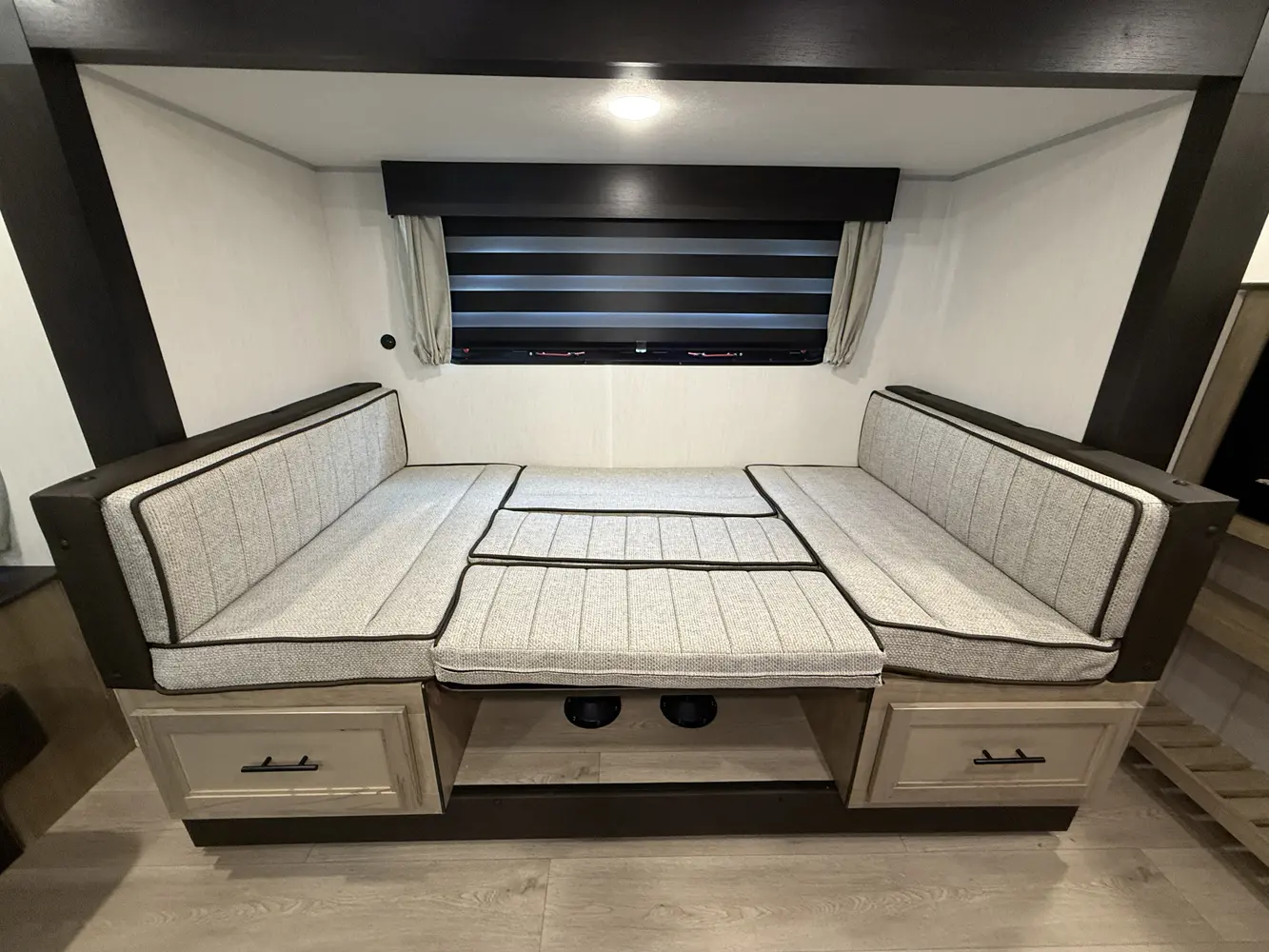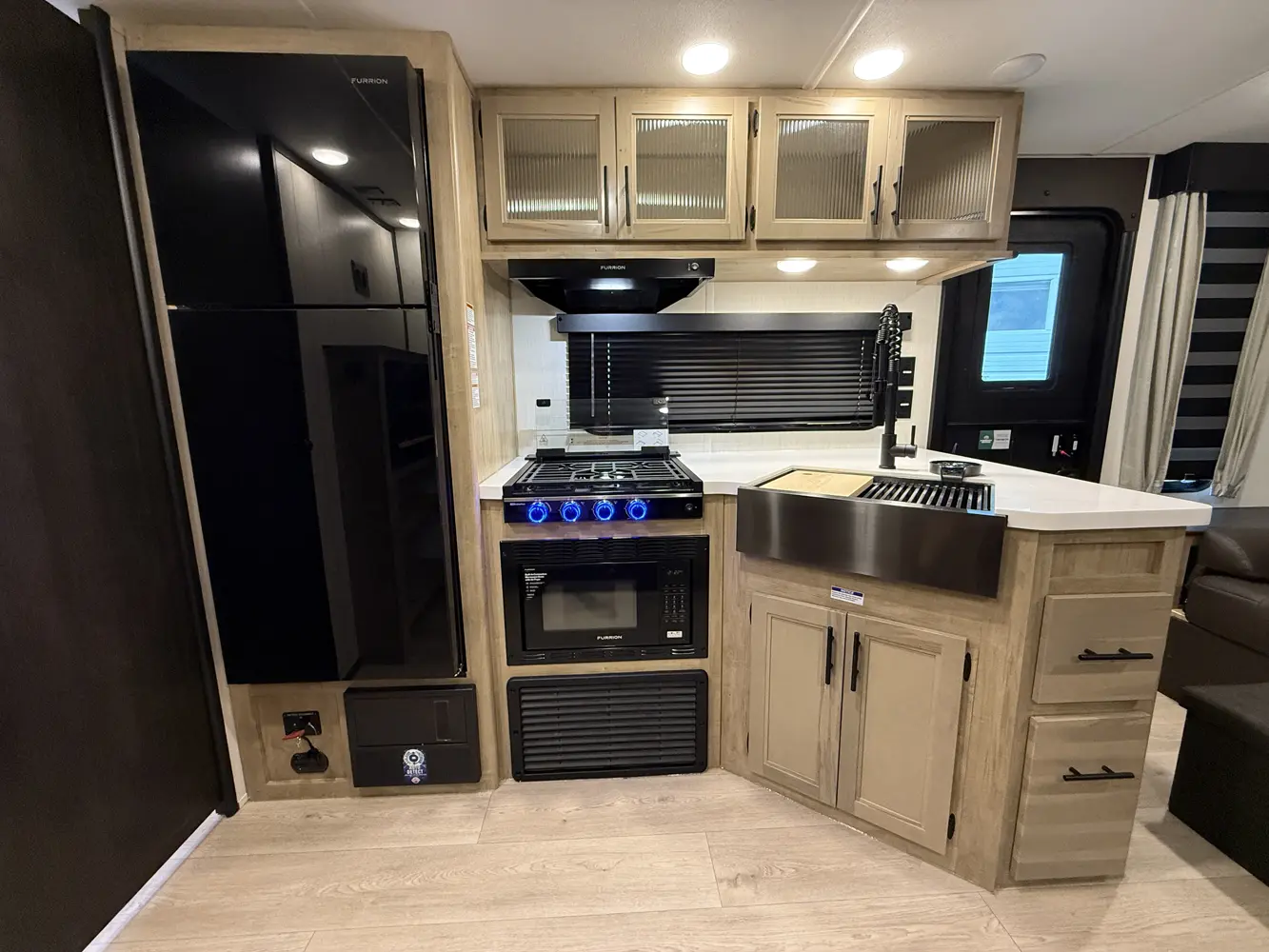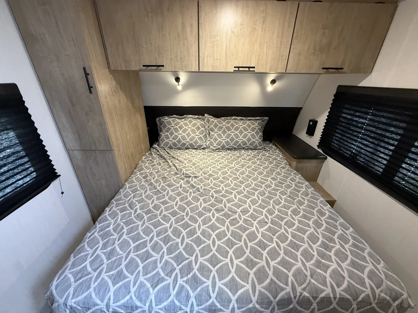 The 23MKBL is a touring unit perfect for your family. Enjoy the huge U-shape dinette situated in the slide out for dining, and additional sleeping for 2 adults. A rear sofa is positioned for comfort and TV viewing. The modern chef’s kitchen has the right combination of functionality and storage with a full-size pantry. A huge bathroom leads into a private master suite with queen bed. Outside, enjoy the Cherokee camp kitchen, exterior TV bracket with speakers, and power awning.