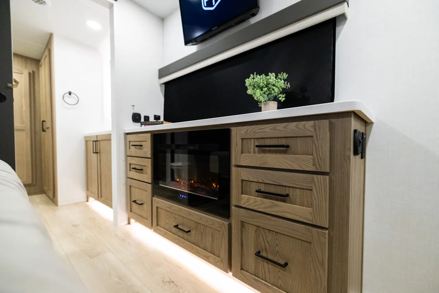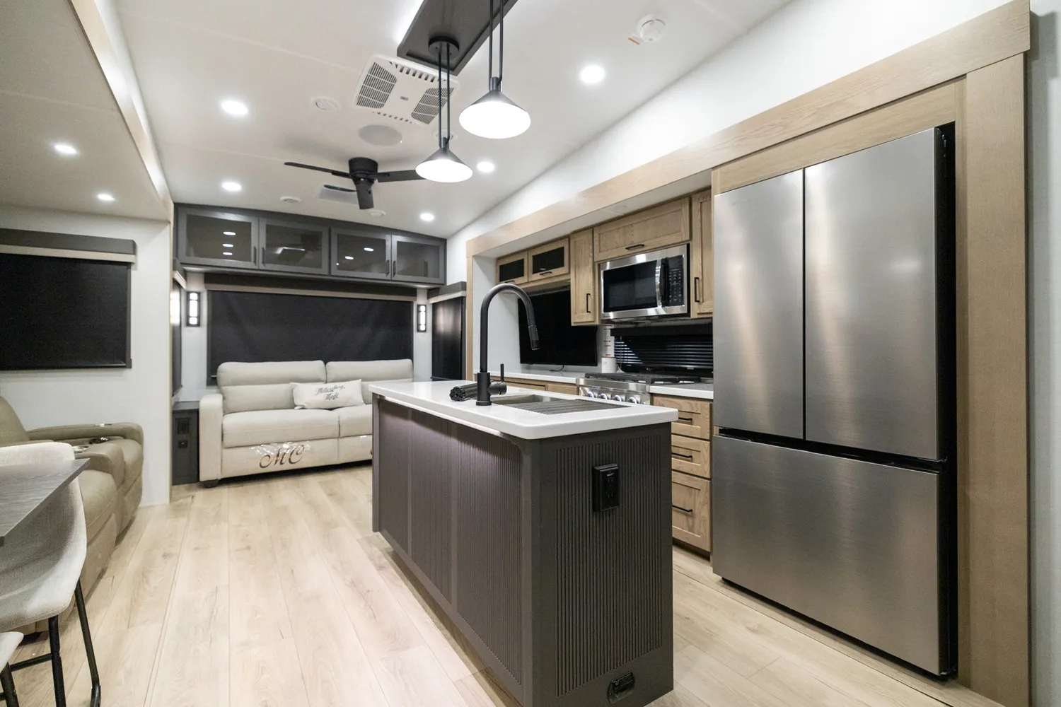 This 40' rear living fifth wheel combines comfort and versatility! The spacious living area features a 76" hide-a-bed, 67" theater seating, a fireplace, and a pull-out desk for remote work or hobbies. The kitchen offers an island, pantry, and rotating dinette seating, while the private bedroom includes a king bed, dresser with fireplace, and washer/dryer prep. With dual toilets, dual awnings and pass-thru storage, it’s built for extended stays in style.