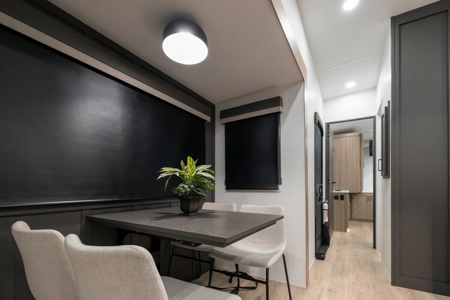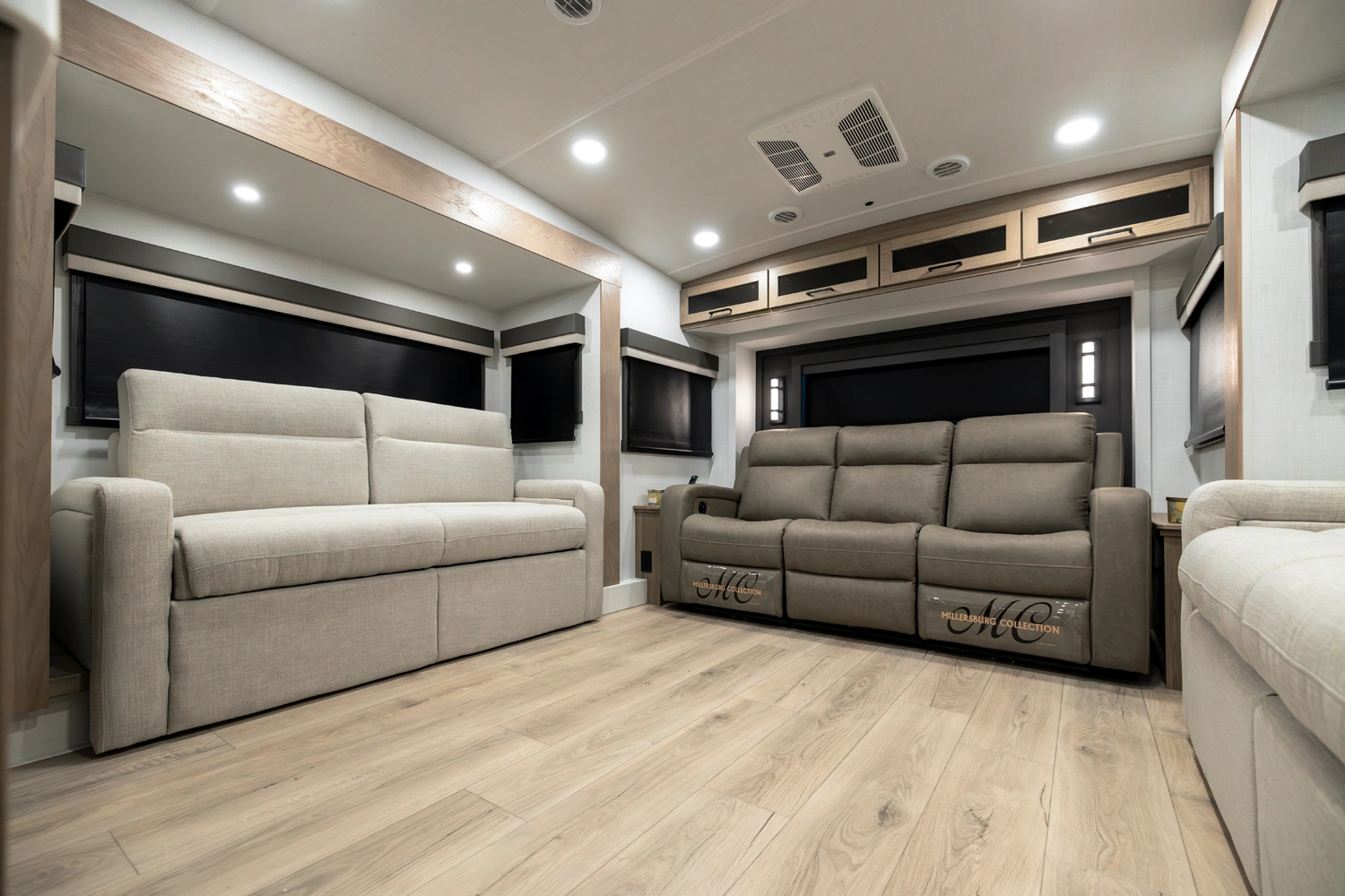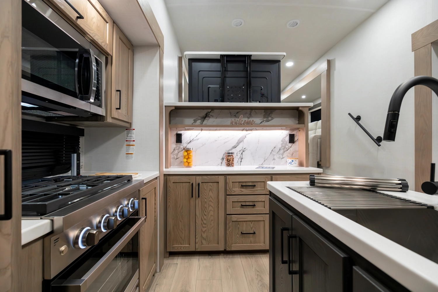 Our first 40' front living fifth wheel delivers luxury and space in every detail! The front lounge features dual 68" hide-a-beds, a 78" theater seat, fireplace, and televator TV. The central kitchen includes an island, double pantries, and rotating dinette seating. The private rear bedroom offers a king bed, washer/dryer prep, and ample storage. With dual awnings and pass-thru storage, it’s made for elevated travel living.