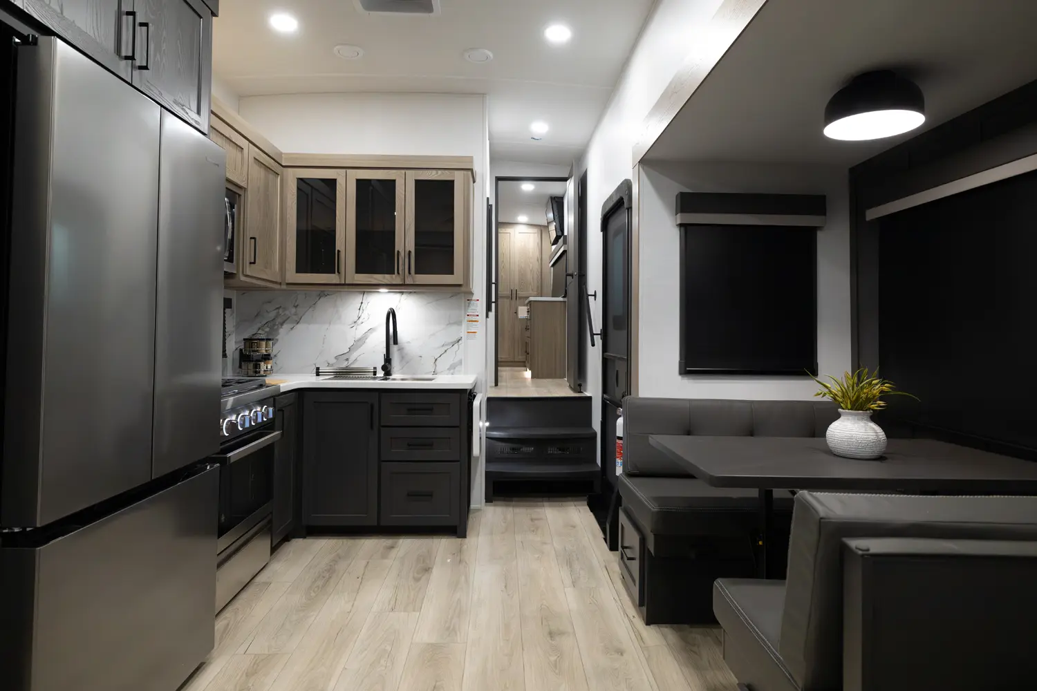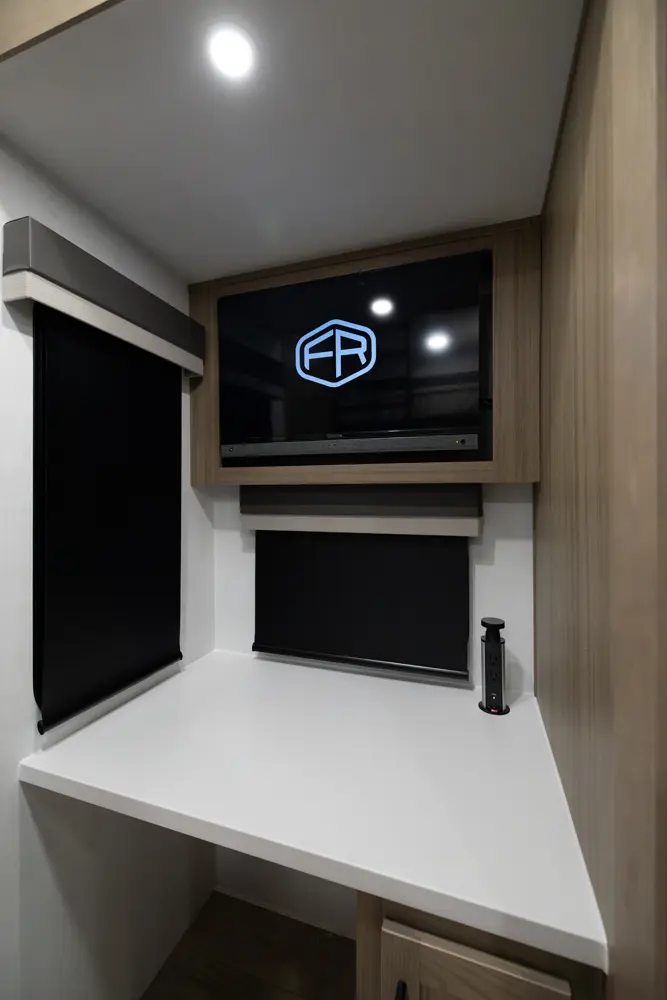 Our first 40' bunkhouse fifth wheel combines family comfort and luxury! The rear bunkroom offers double 48" x 72" bunks, wardrobe, desk, and fridge. The spacious living area features a 60" theater seat, 44" dinette, and fireplace, while the front bedroom includes a king bed and washer/dryer prep. With dual awnings, pass-thru storage, and off-grid Power Package options, it’s perfect for big adventures.