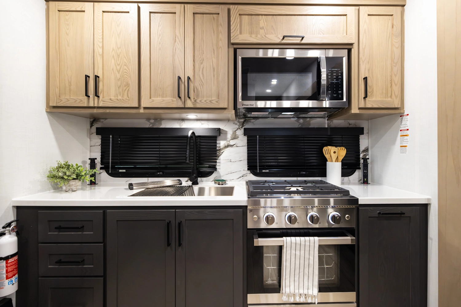 This under-30’ fifth wheel packs luxury into a compact design! Enjoy a spacious living area with a 67" theater seat, 44" dinette, and entertainment center with TV. The kitchen offers a pantry, fridge, and plenty of counter space, while the private front bedroom includes a queen bed (king optional) and wardrobe storage. With a roomy bathroom, pass-thru storage, and a 20' awning, it’s the perfect blend of comfort and easy towing.