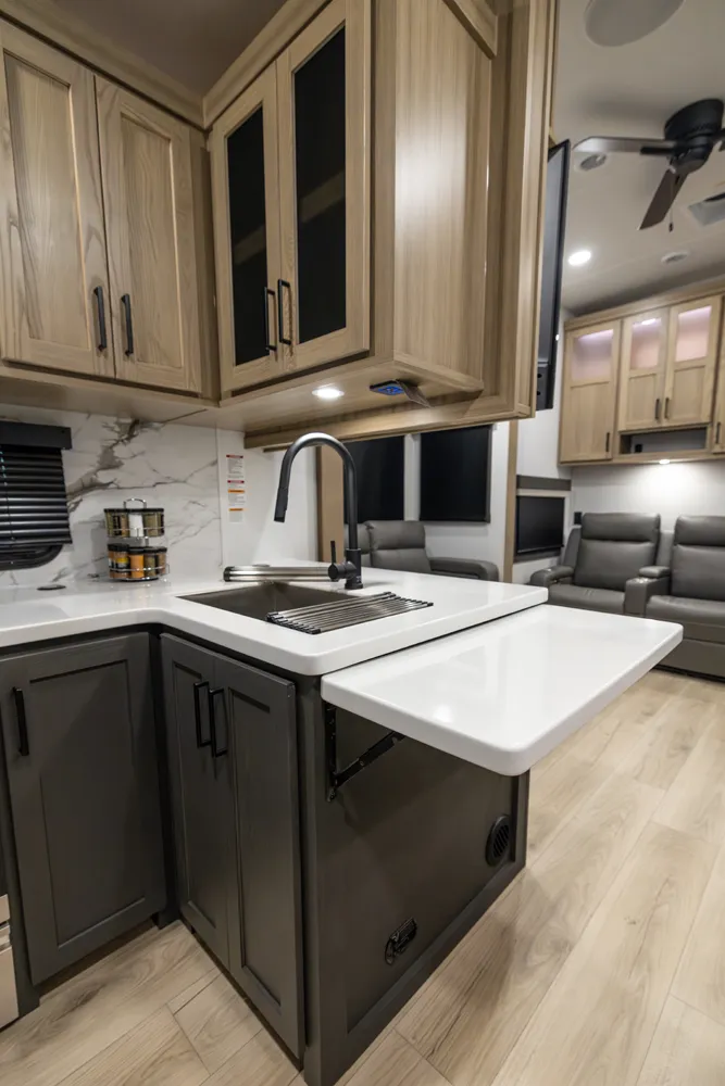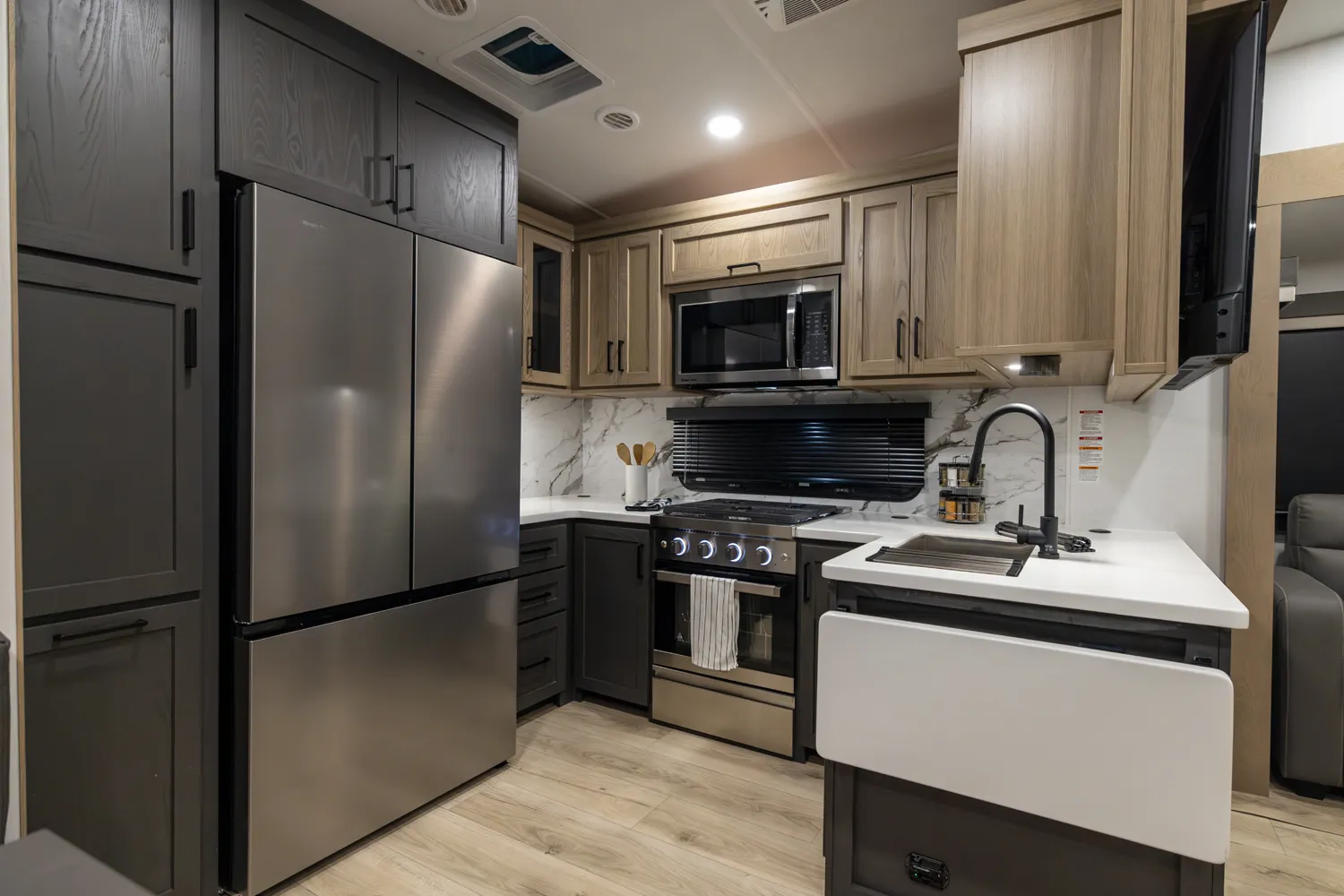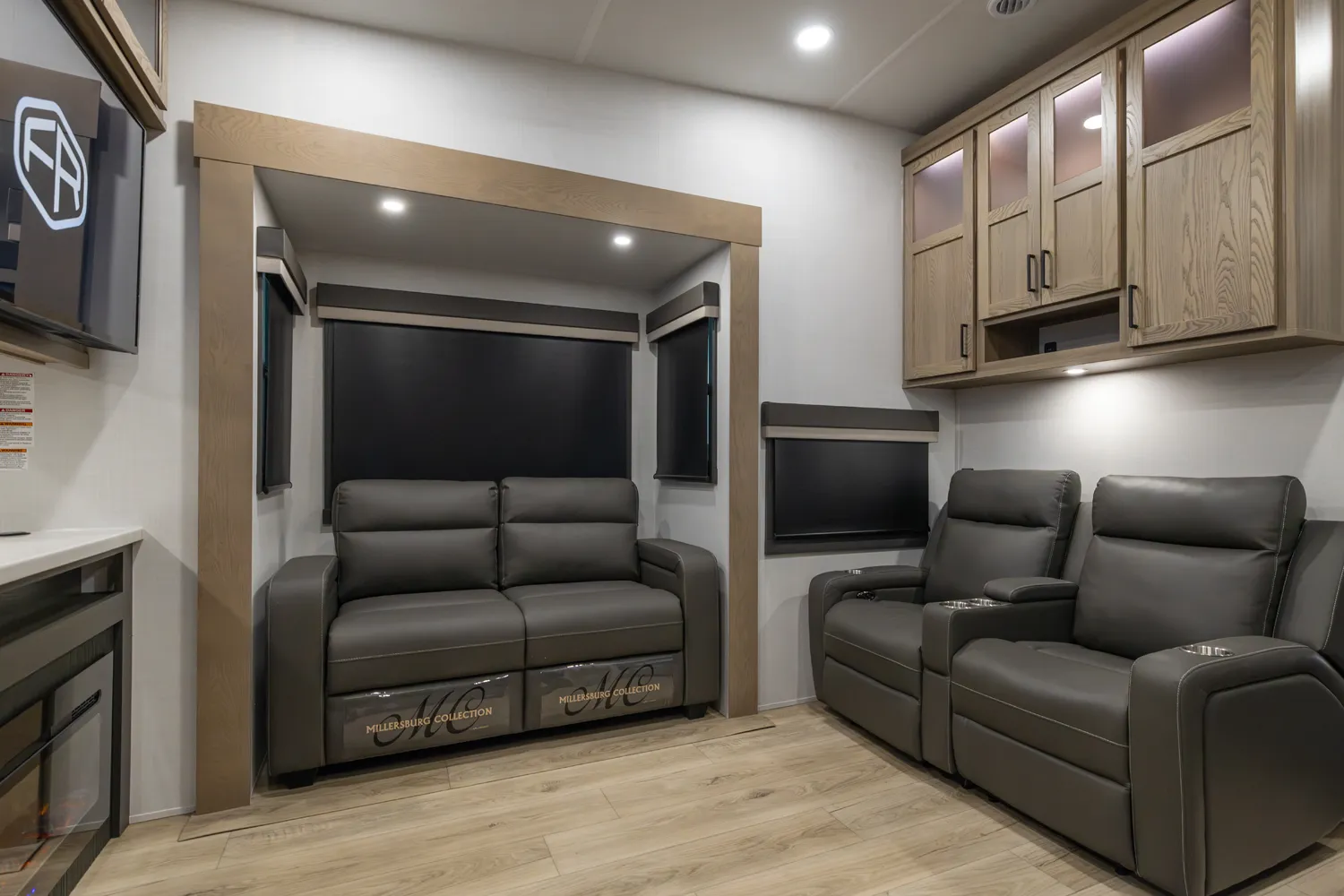 One of the best entertainment centers in the industry! This 371RK 5th wheel will entertain your family and friends for a night of relaxation after a long day of camping. It features a 68" Hide-a-Bed, a 60" Hide-a-Bed & 60" theater seating. Its front bedroom features a queen bed, (optional King) massive wardrobe storage & Washer/Dryer prep. The rear kitchen offers tons of counterspace paired with ample cabinet space, drawers, pantry storage & a trash can drawer.