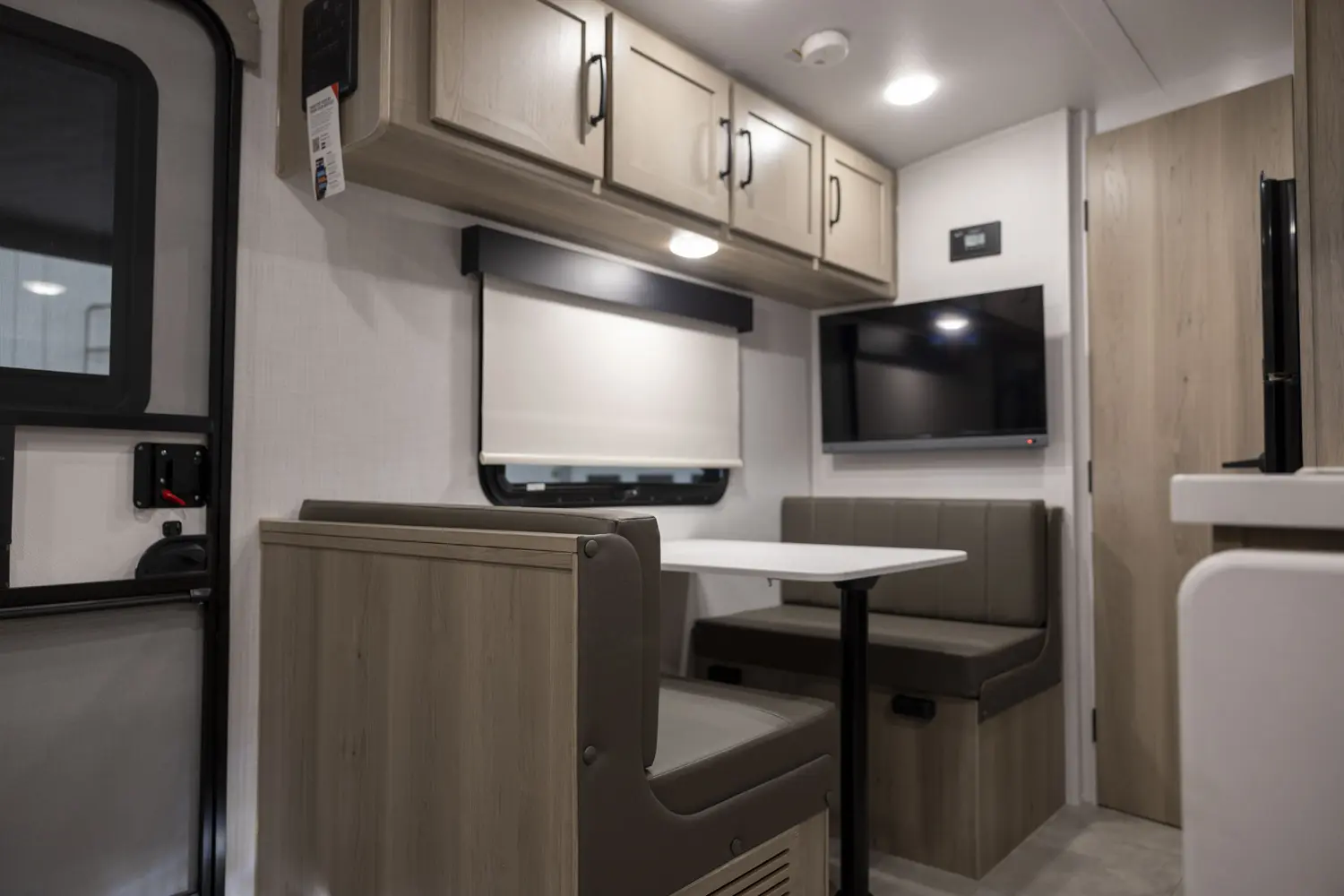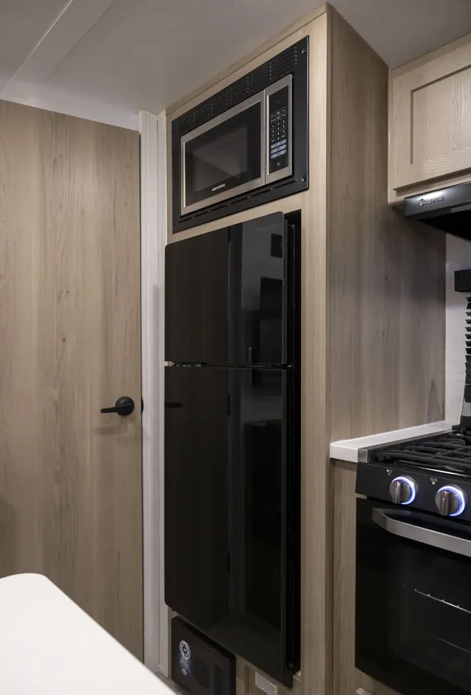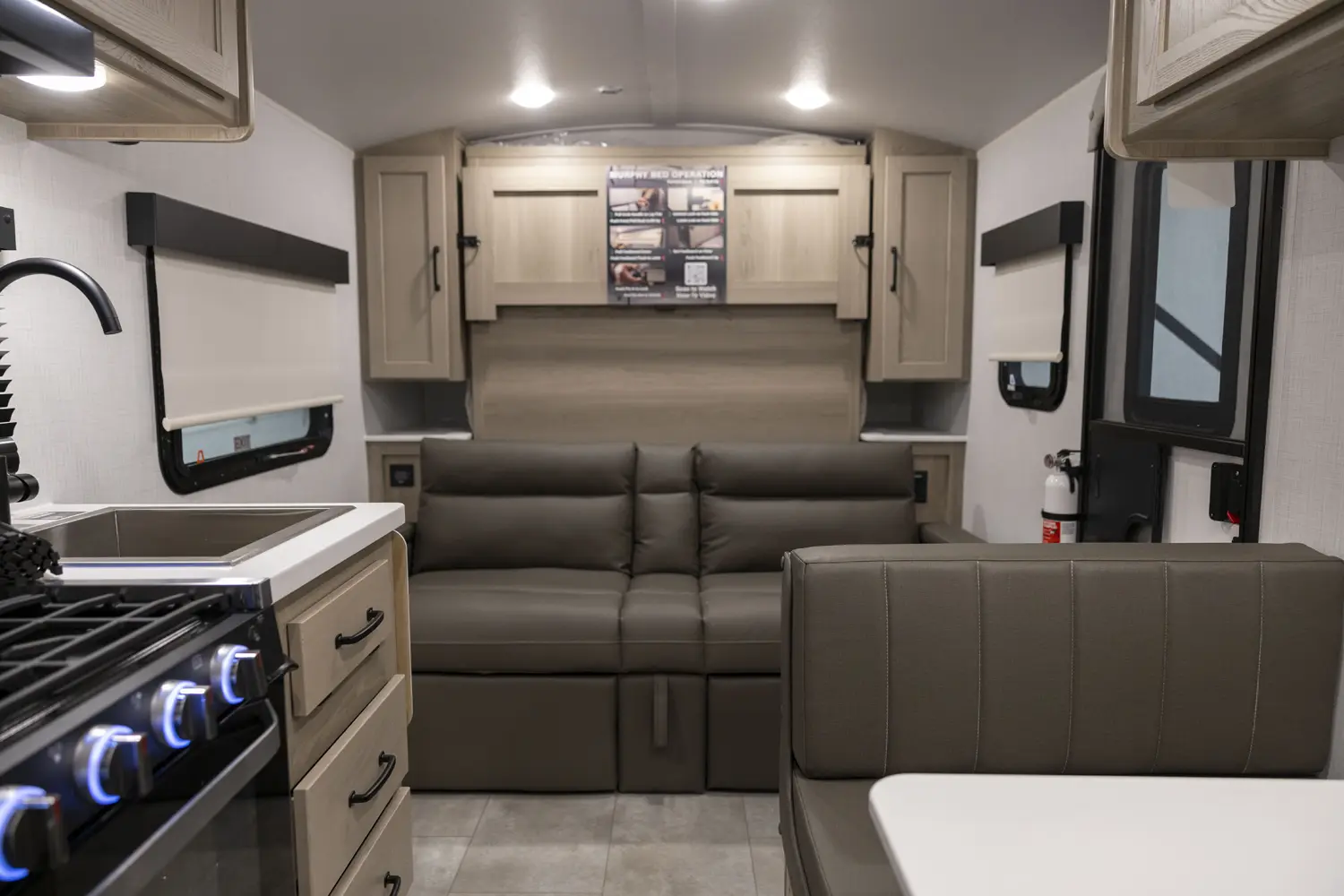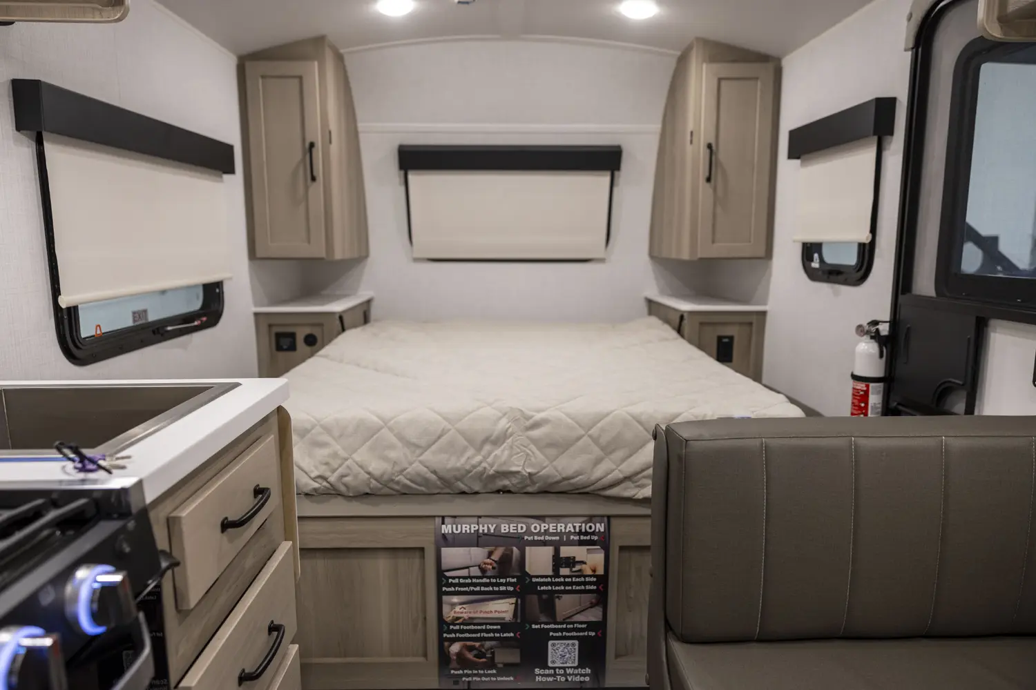 The Flagstaff E-Pro E19FD has one entry and zero slide outs. Exterior features include: fiberglass exterior and 14' awning. Interiors features include: murphy bed and rear bathroom.