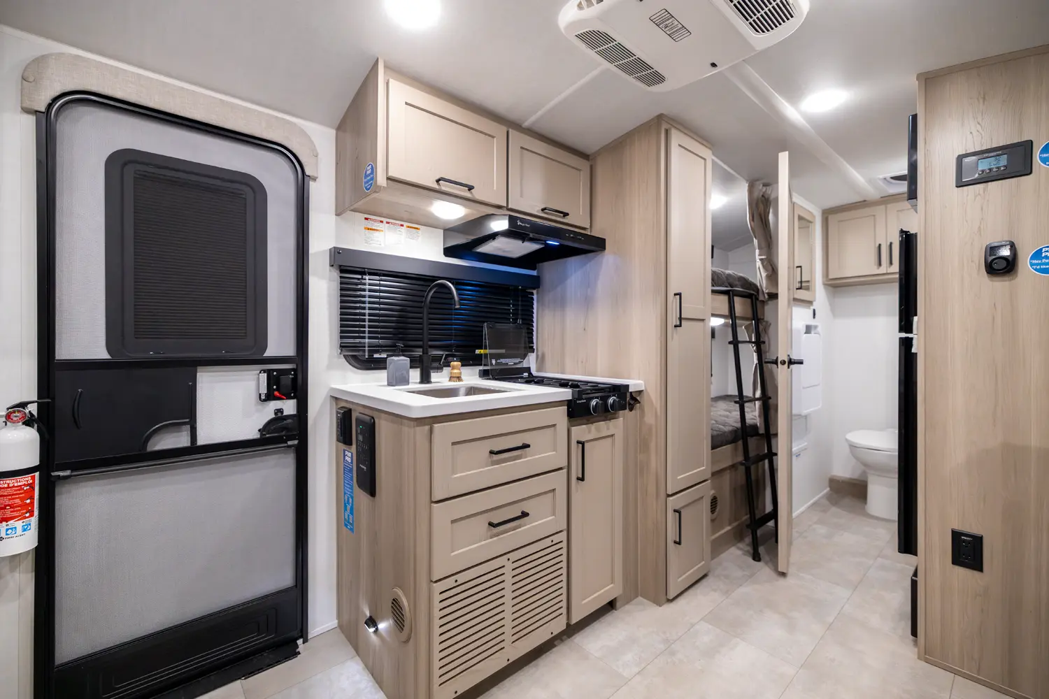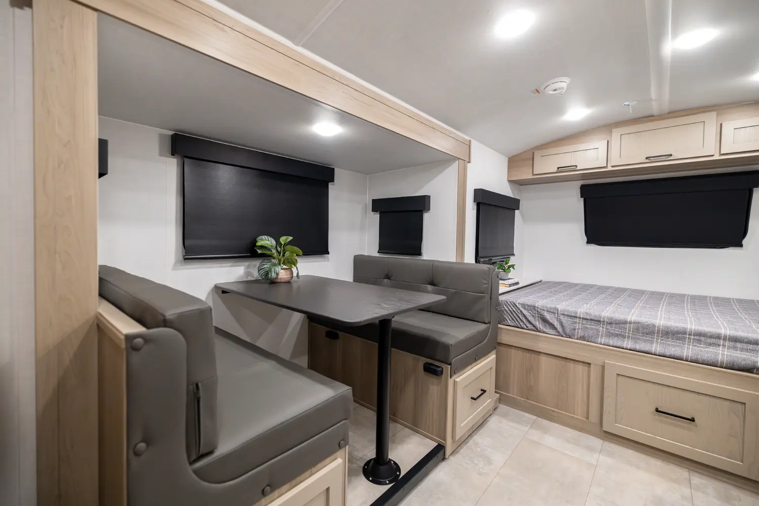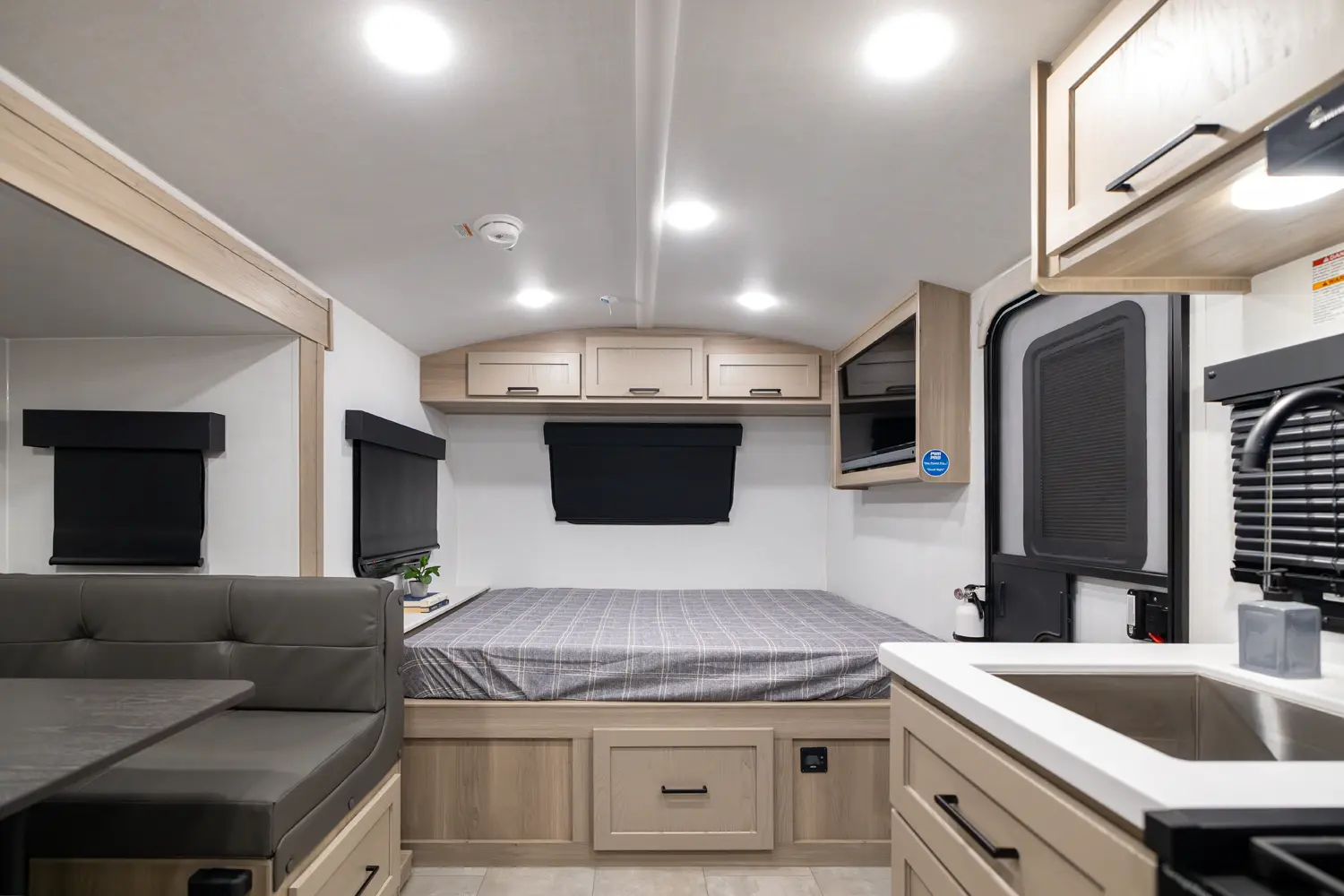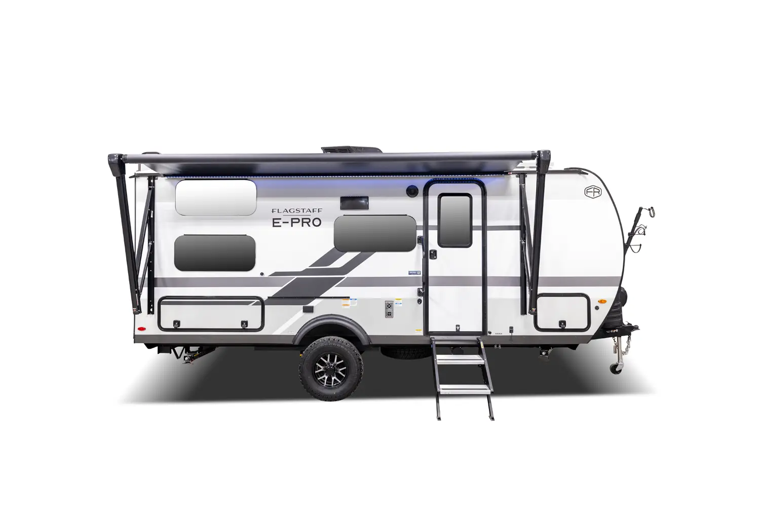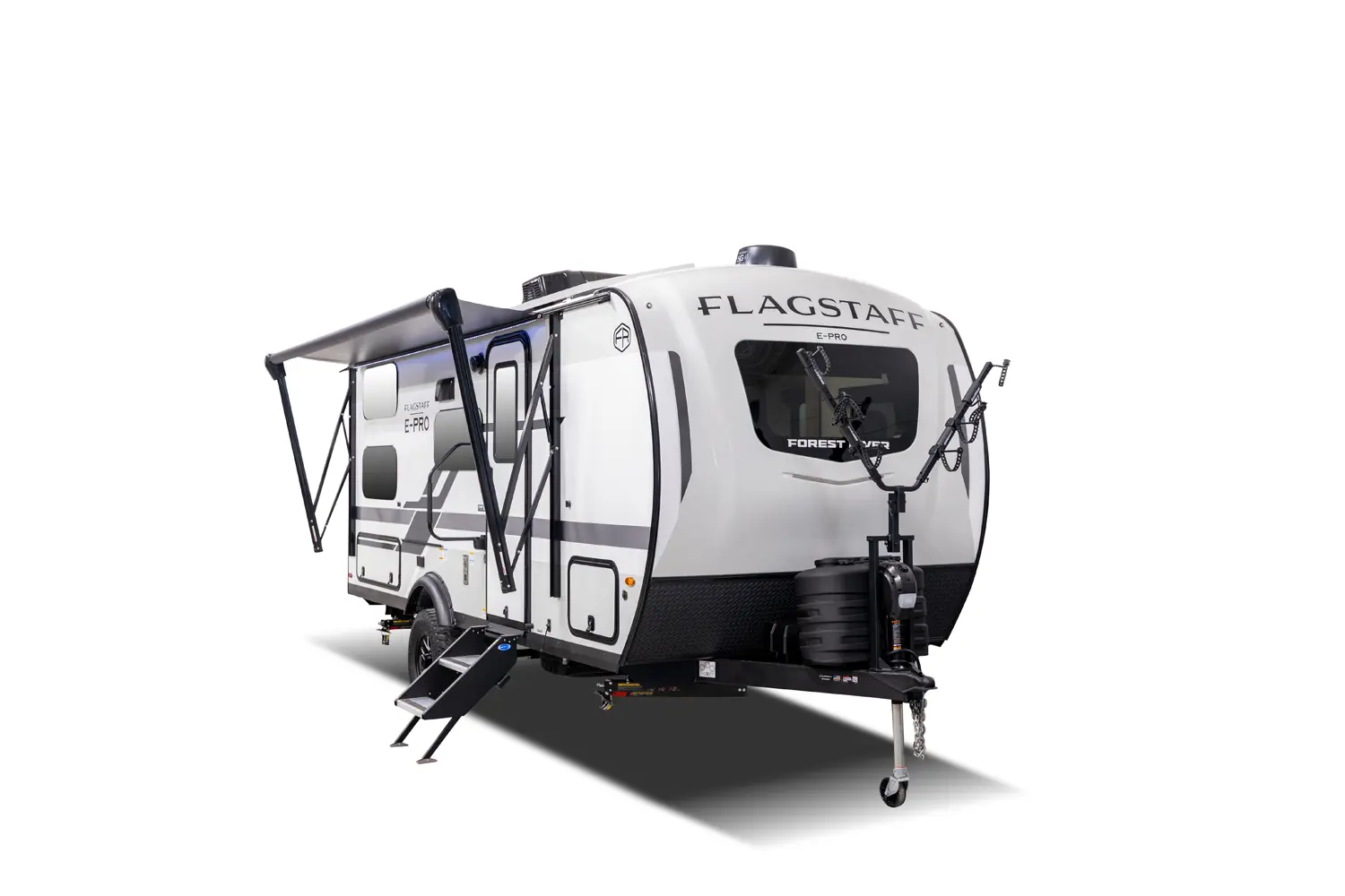 The E-Pro 20BH is a lightweight bunkhouse designed for adventure. At just over 21 feet long, it’s easy to tow while still offering sleeping space for the whole family. It features rear bunks and a versatile dinette. The functional kitchen, modern interior, and standard off grid features like 200-Watt solar paired with an 1800-Watt inverter makes the 20BH a perfect option for campers you want comfort capability and freedom to explore.