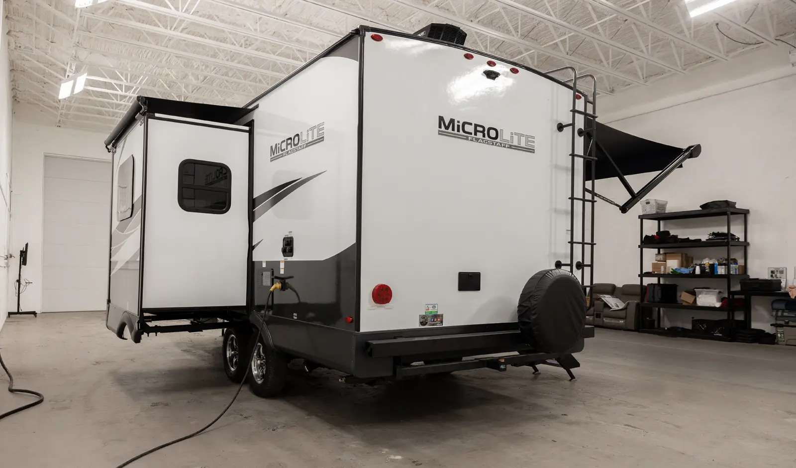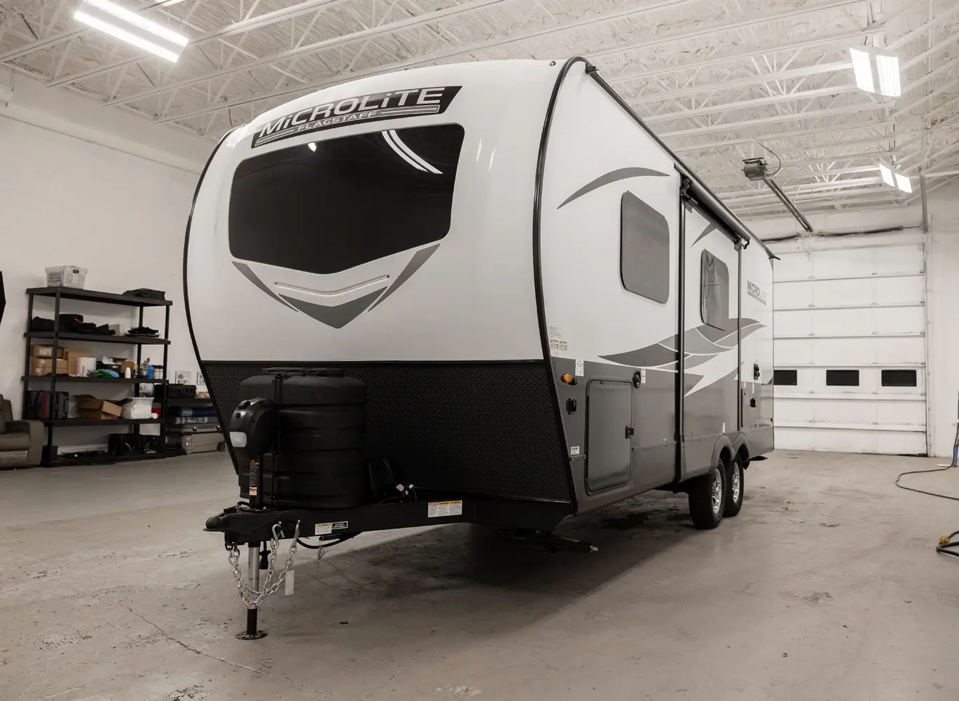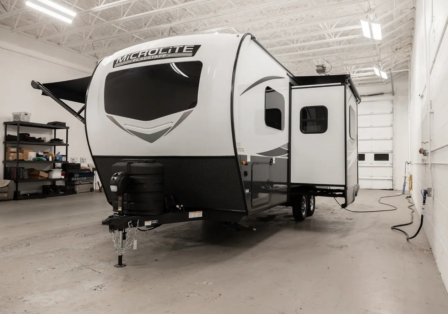 The Flagstaff Micro Lite 22FBS floorplan has one entry and one slide out. Exterior features include: fiberglass exterior and 18' awning. Interiors features include: front bedroom.