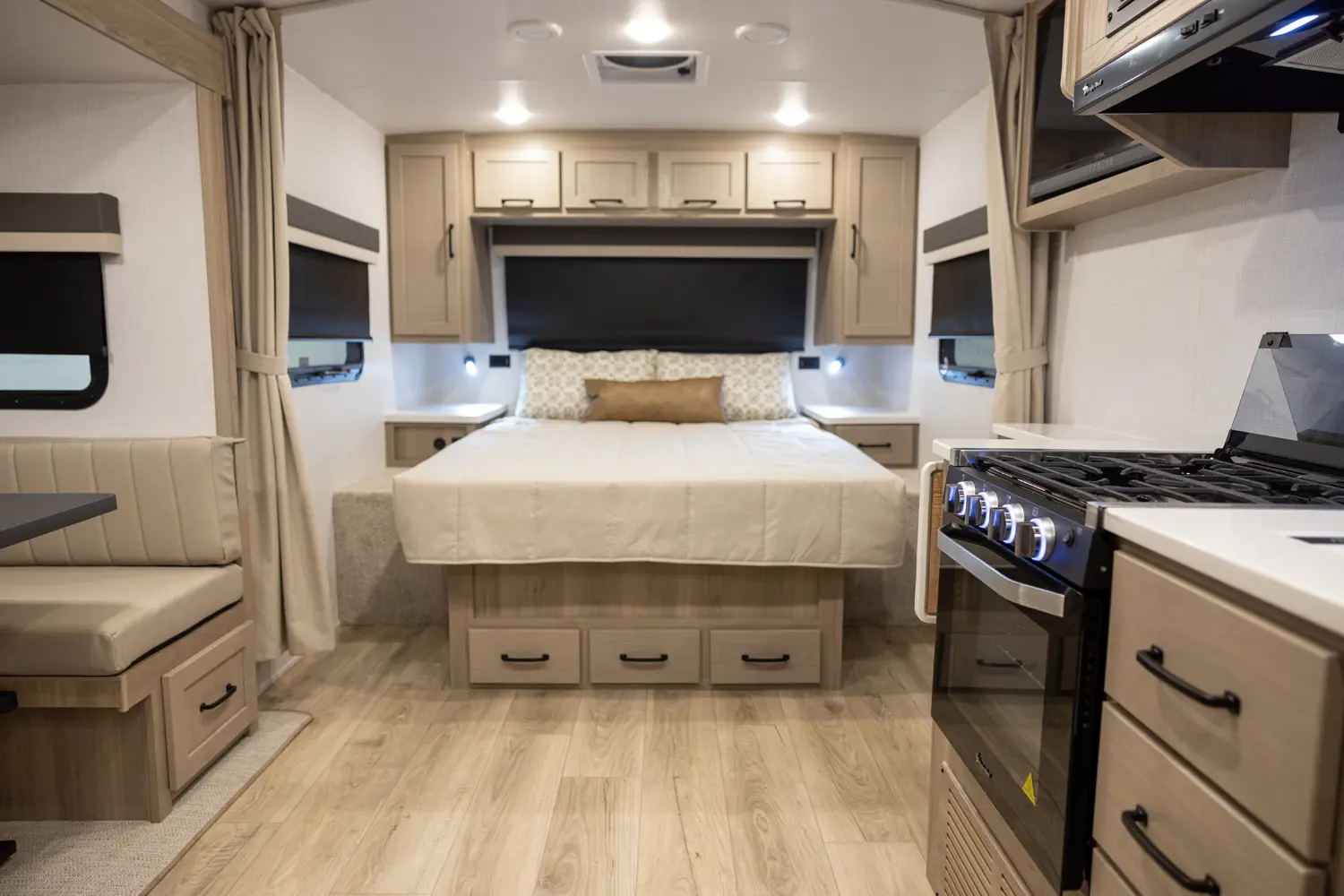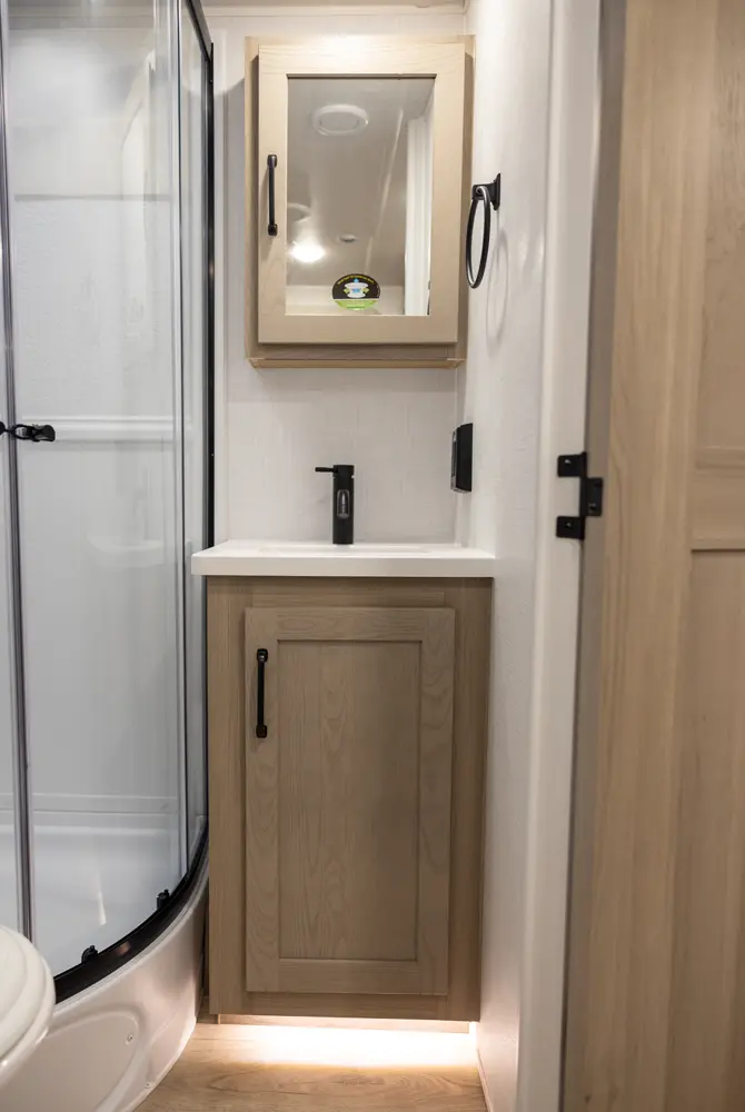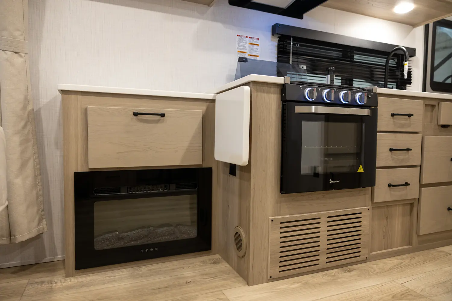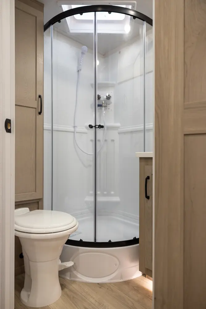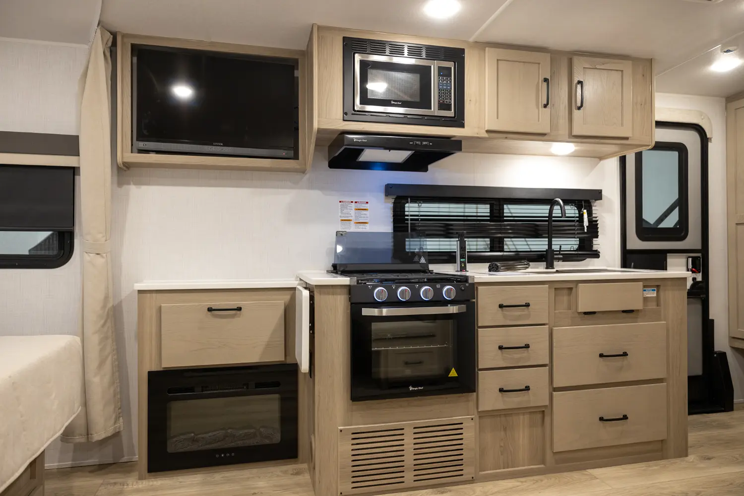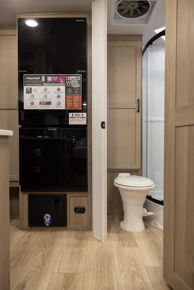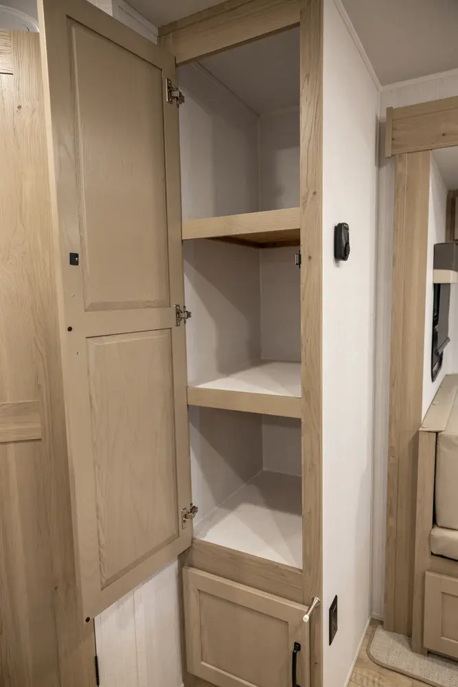 This revised floorplan features wide open living space and a drop frame for large front pass through storage. The baggage door on the front pass through is 30” by 24” which will accommodate all your camping accessories. The floor space in this unit caters to pet-friendly campers with room for kennels and large animal sleeping areas. If you and your pet want to cuddle up next to a nice warm fireplace with some family members on the theater seating, this is the unit for you.