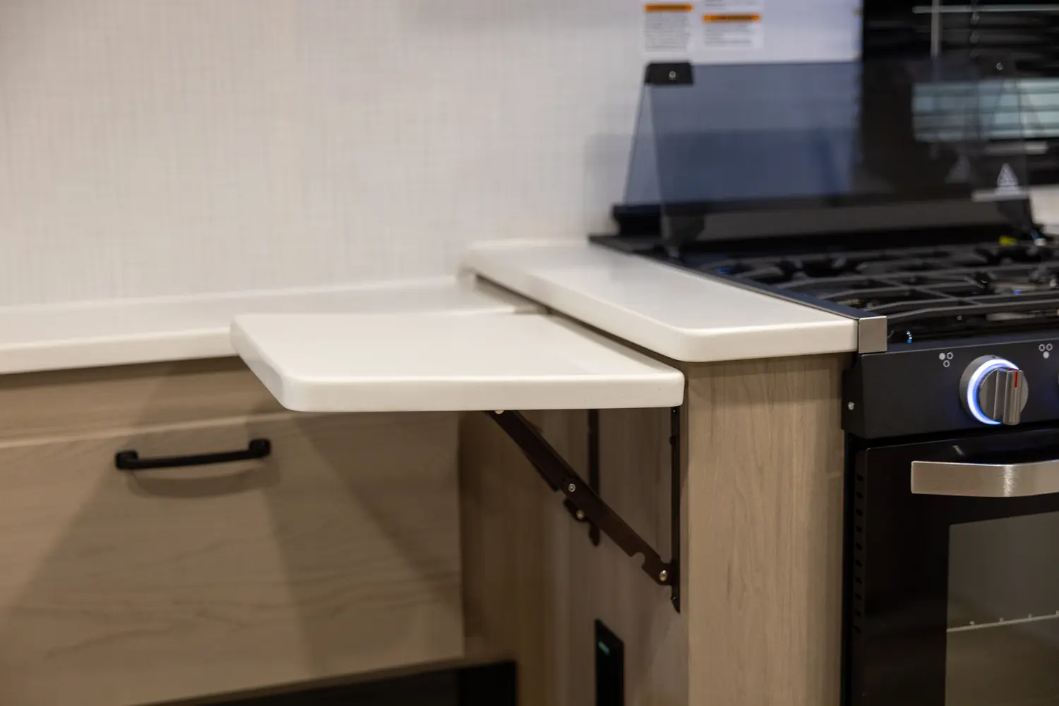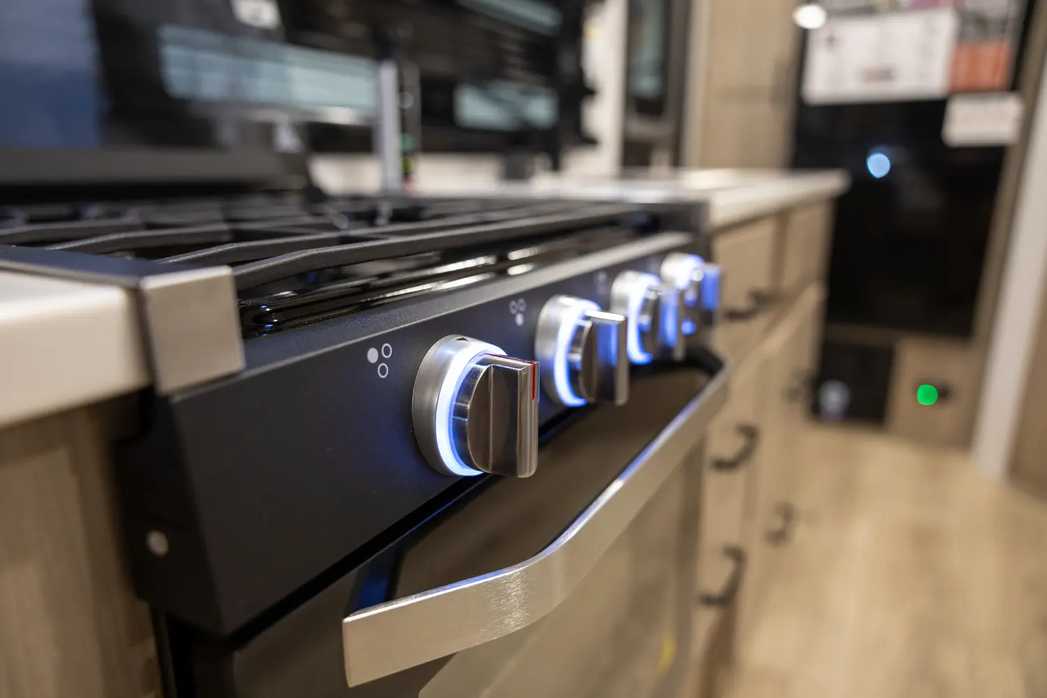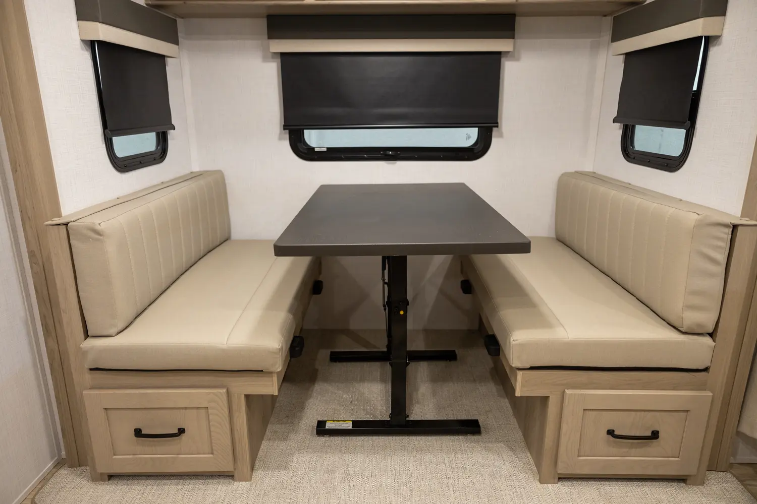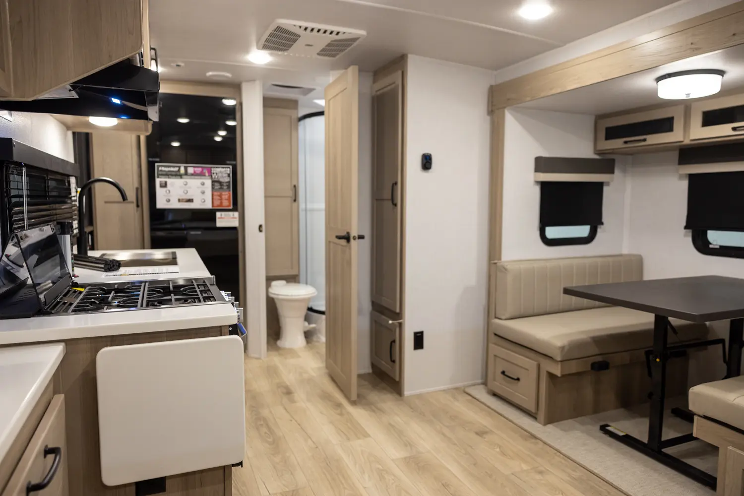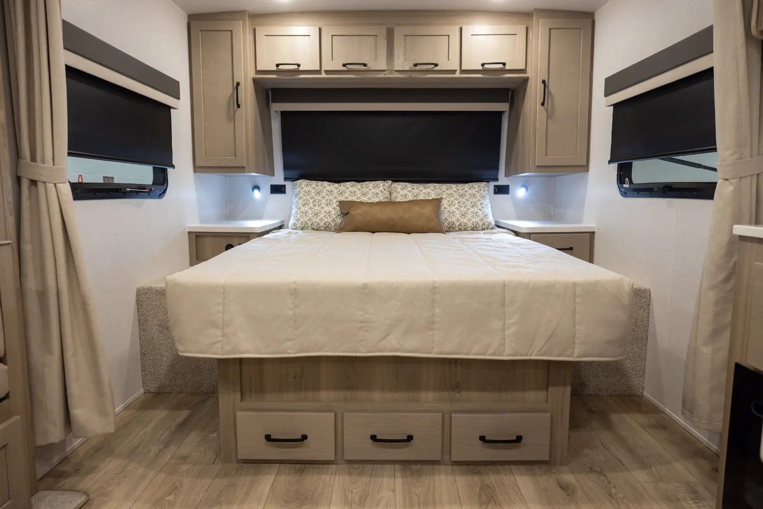 This revised floorplan features wide open living space and a drop frame for large front pass through storage. The baggage door on the front pass through is 30” by 24” which will accommodate all your camping accessories. The floor space in this unit caters to pet-friendly campers with room for kennels and large animal sleeping areas. If you and your pet want to cuddle up next to a nice warm fireplace with some family members on the theater seating, this is the unit for you.