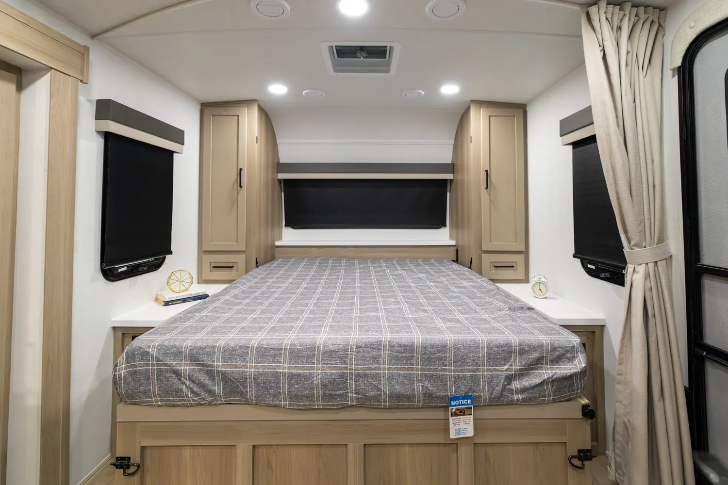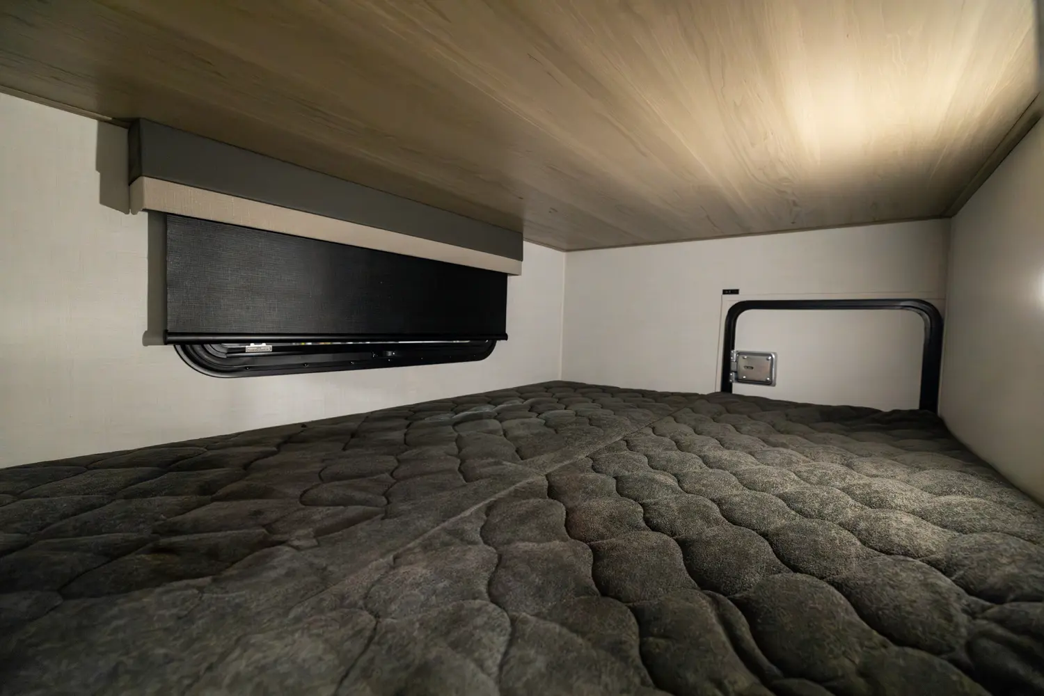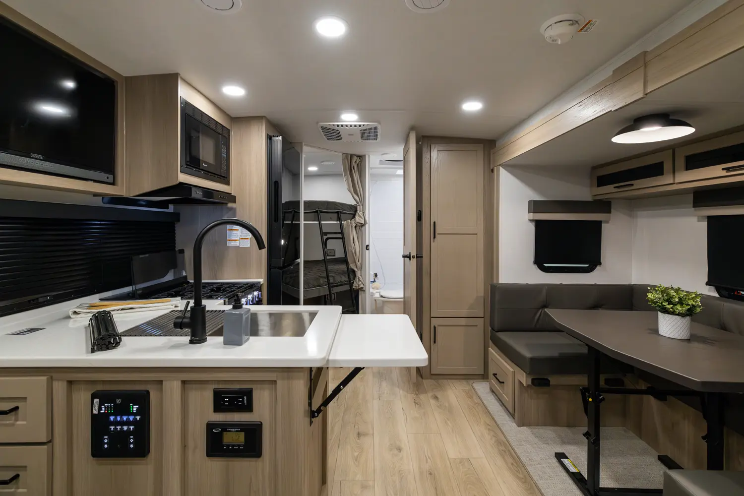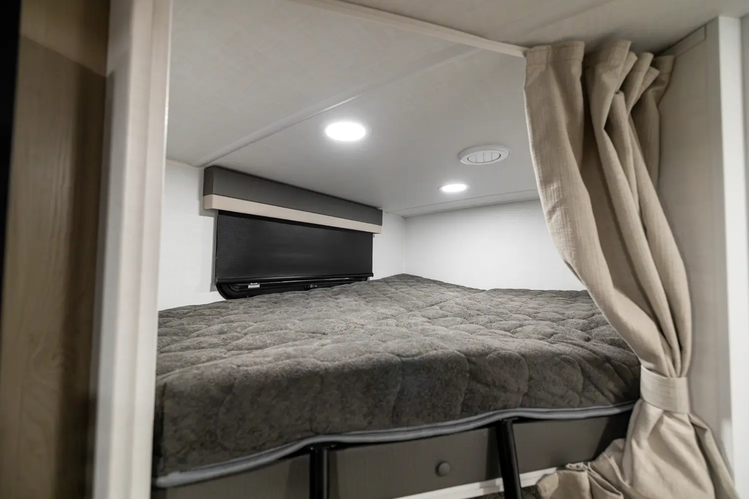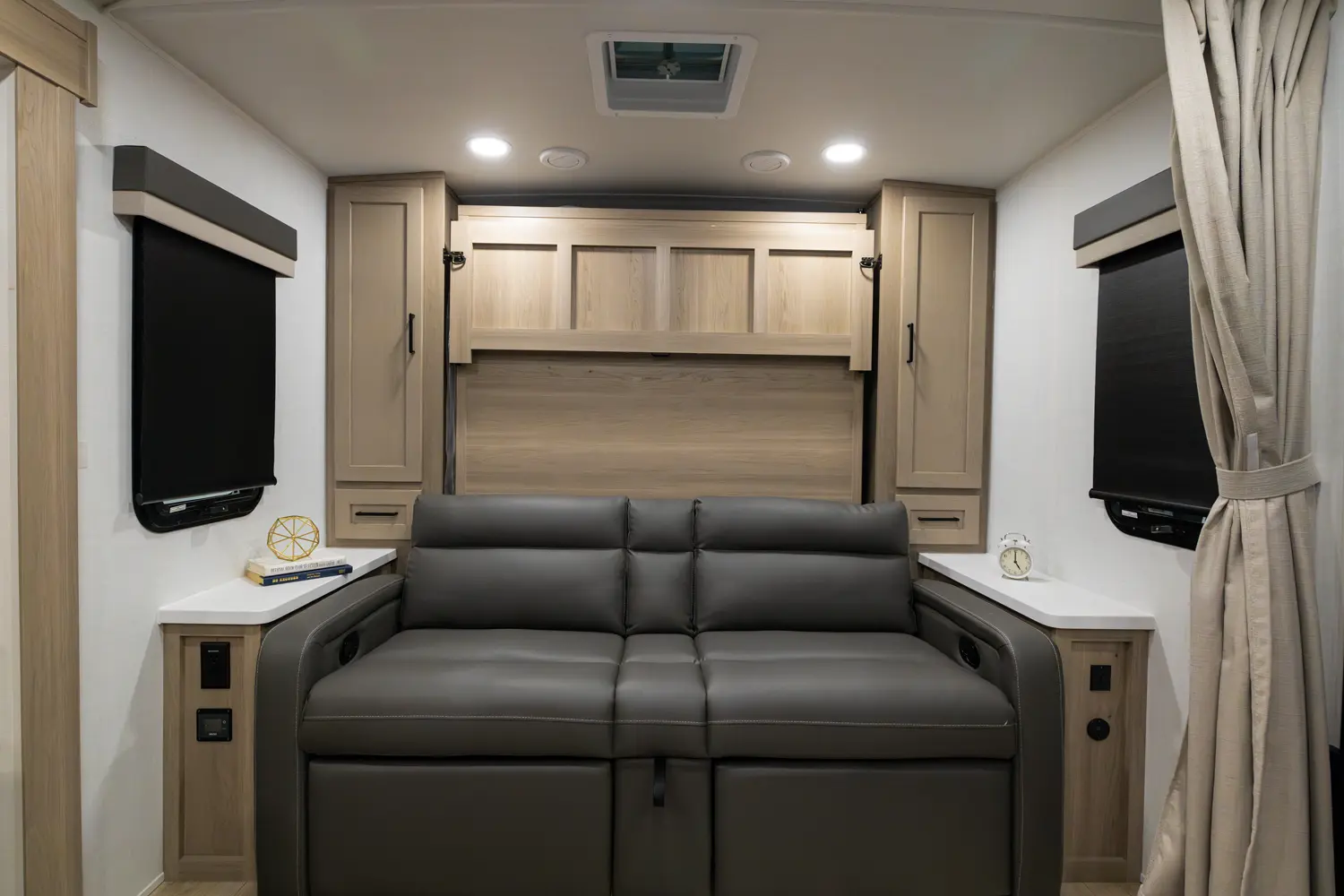 This is the perfect family trailer towing under 26' feet. The double 48" X 72" bunkhouse is awesome for sleeping the kids and even fits adults comfortably. The bottom bunk folds up for even more storage and toys will fit nicely underneath! The big 60" X 74" murphy bed folds up into a sofa for daily use. The giant 18' awning goes almost all the way across your unit while covering the outside kitchen.