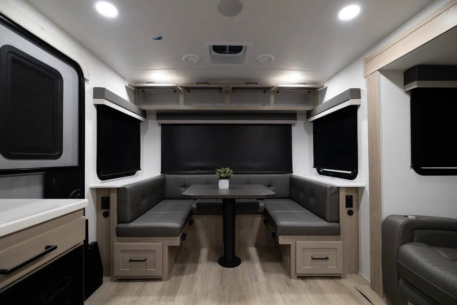 The Flagstaff 26SRD Super Lite features a front bedroom with a true queen bed and wardrobe slide. Two entry doors provide easy access to the bedroom, large pass-through bathroom, and kitchen even when the slides are in. The rear U-shaped dinette and 67" theater seat create a spacious, comfortable living area, making the 26SRD perfect for couples or small families.
