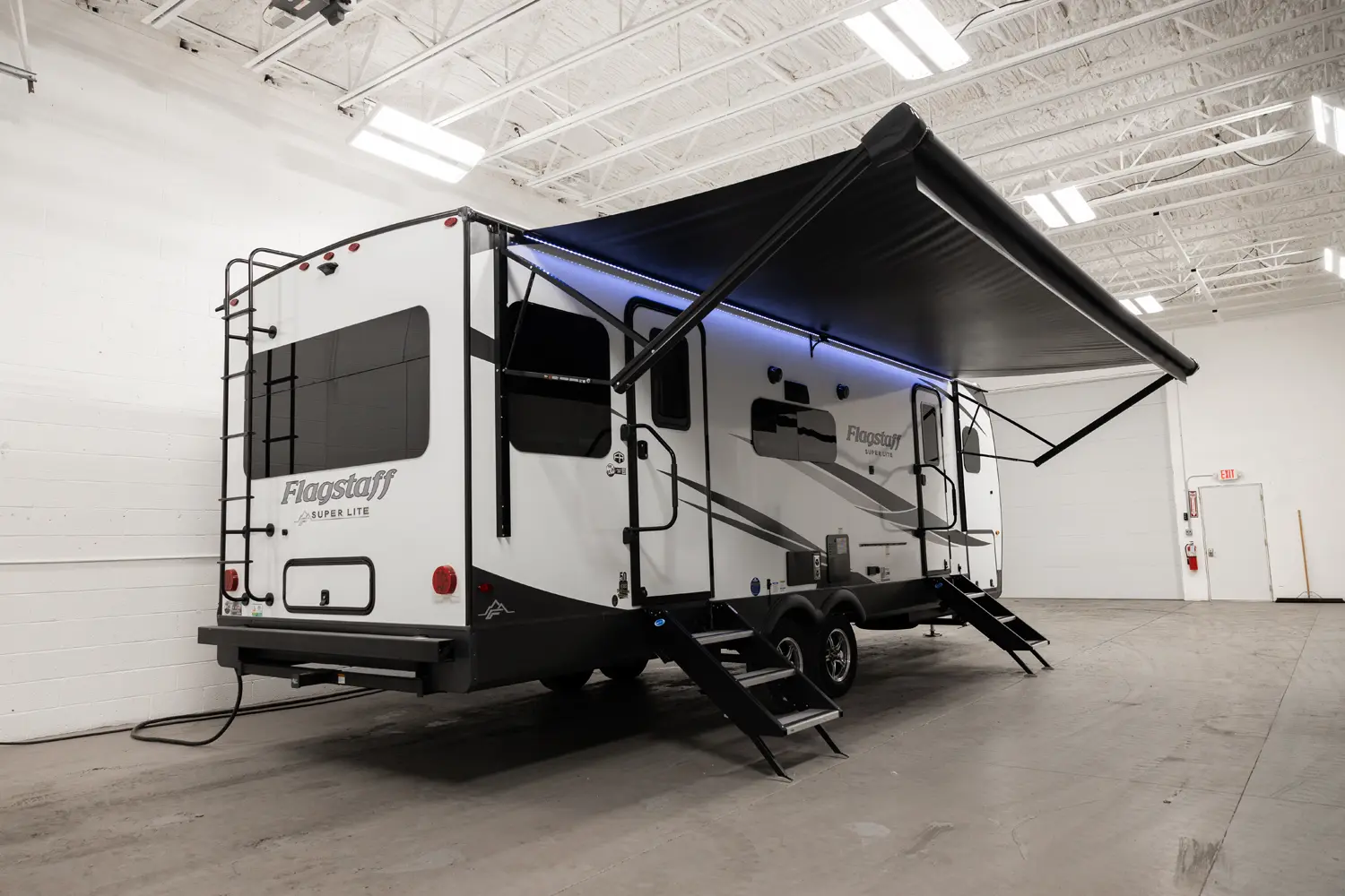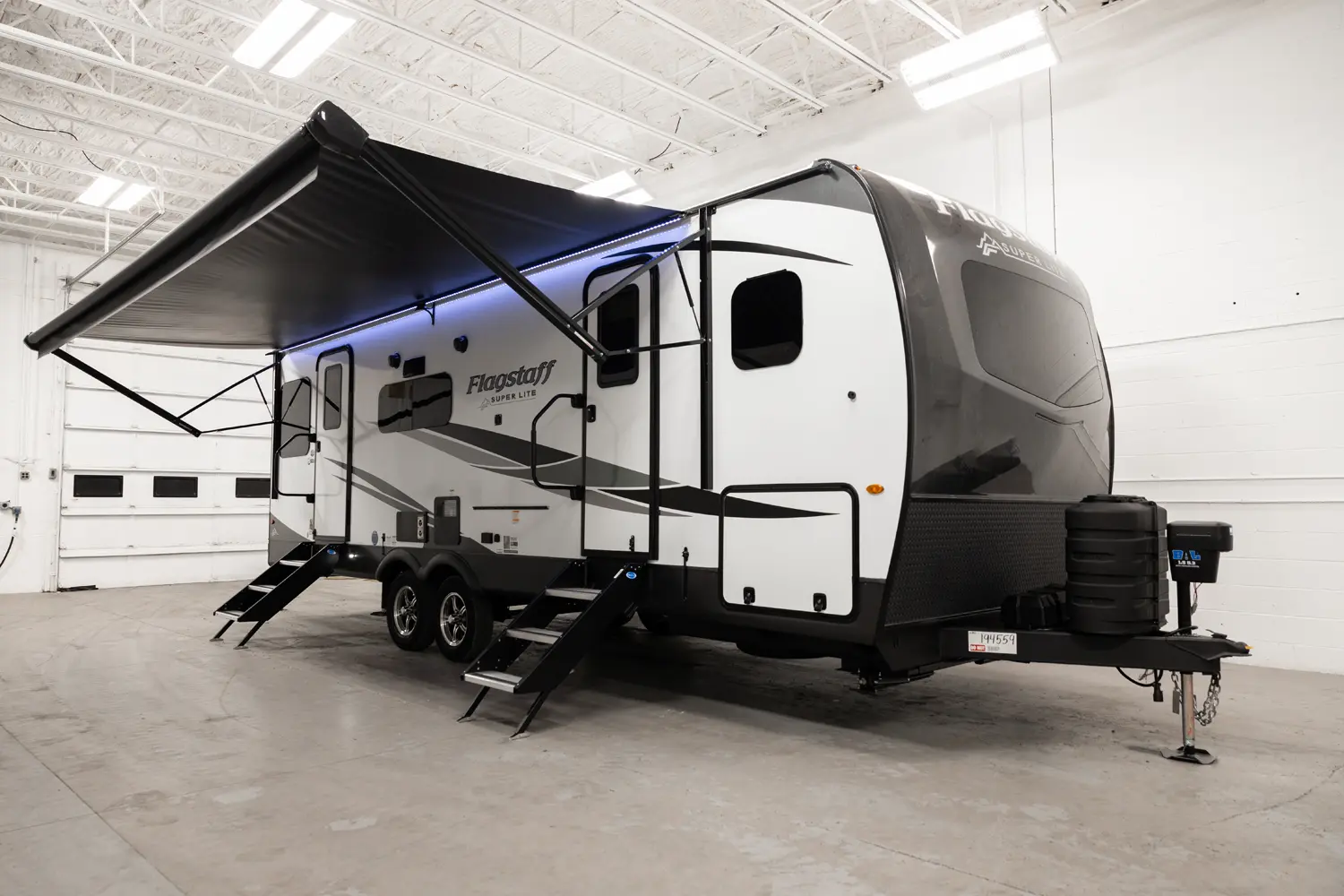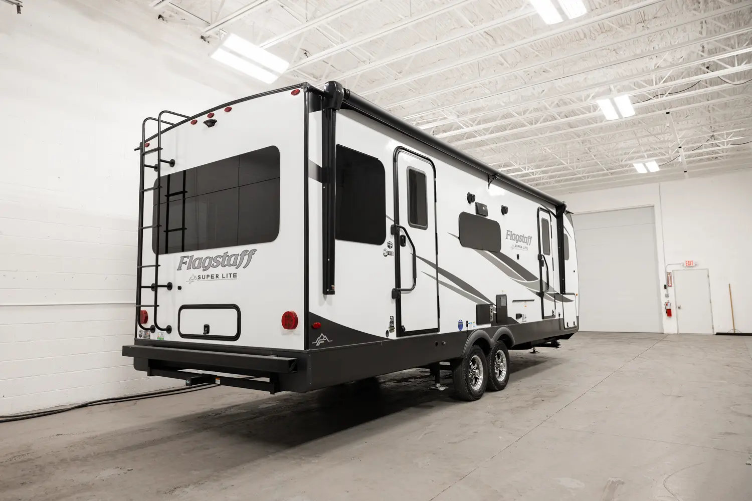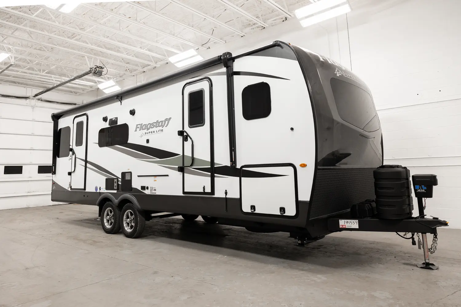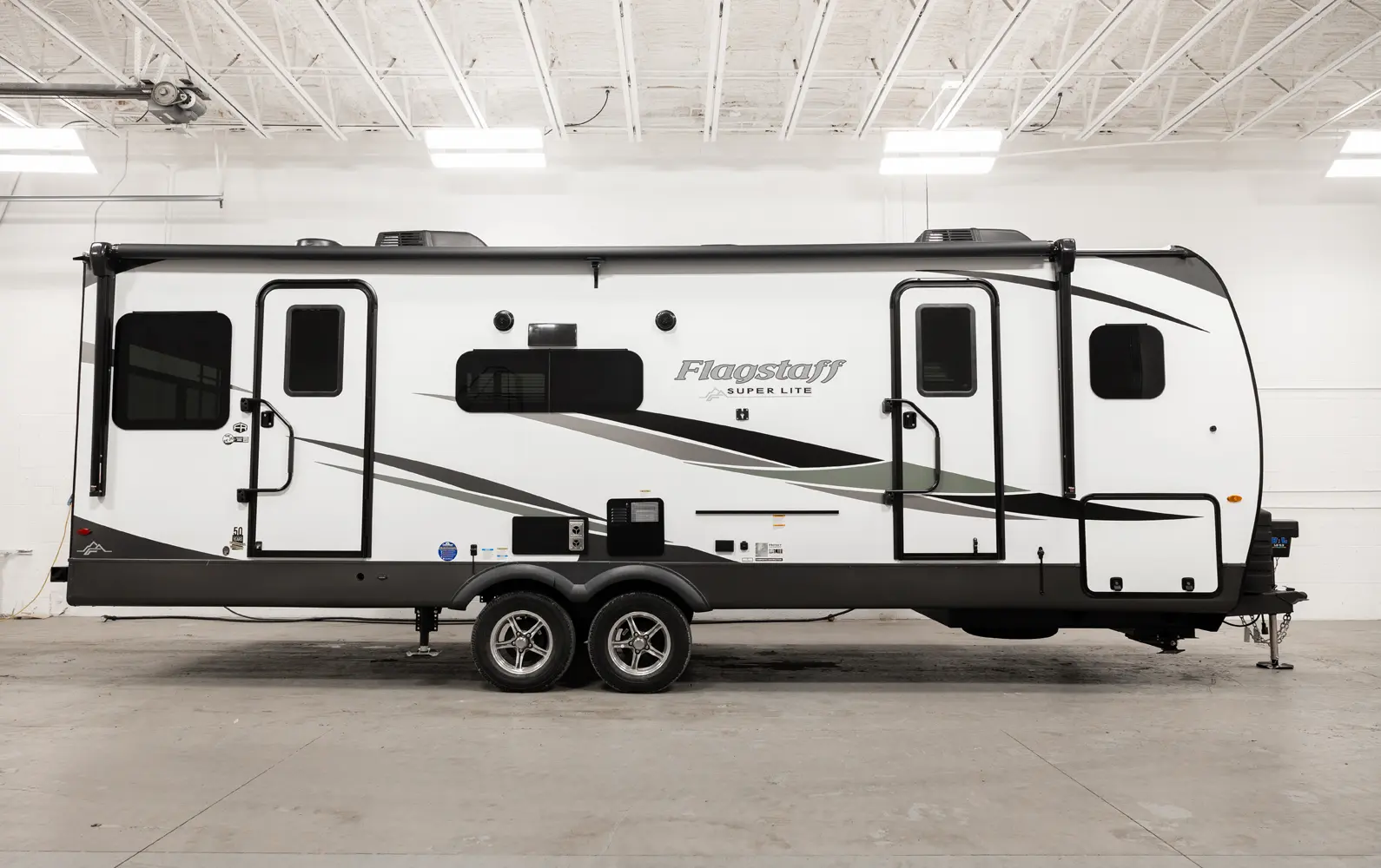 The Flagstaff Super Lite Travel Trailers 26SRD has one entry and two slide outs. Exterior features include: fiberglass exterior and 21' awning. Interiors features include: u-dinette, front bedroom and pass through bathroom.