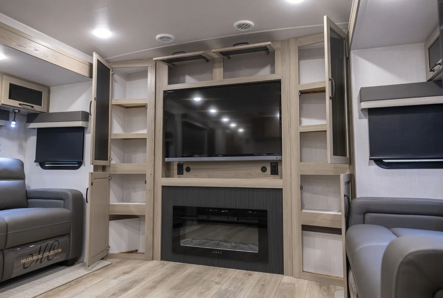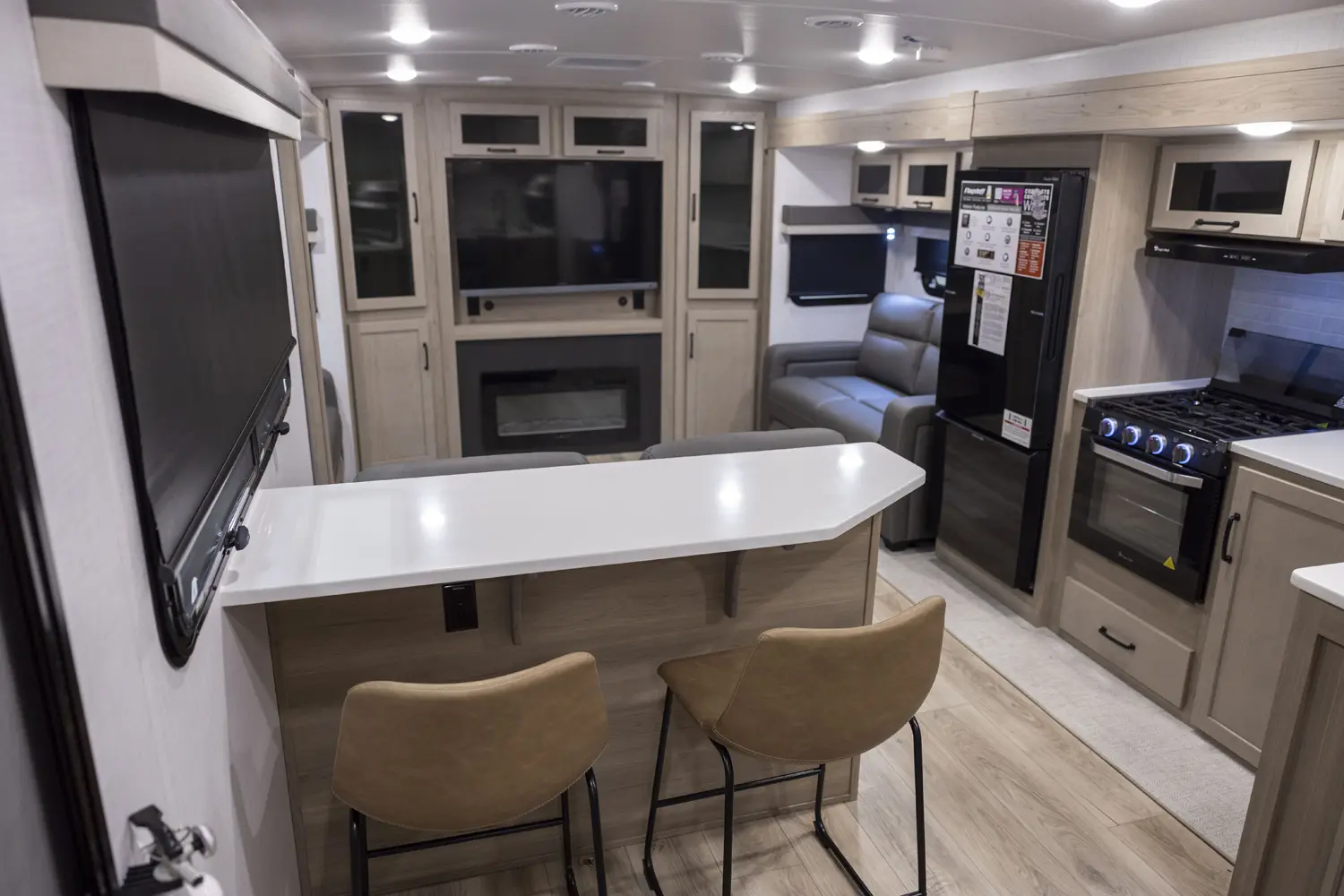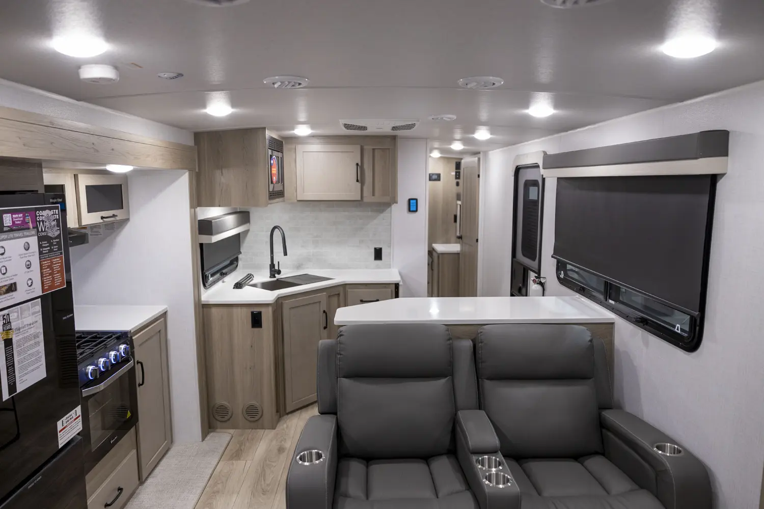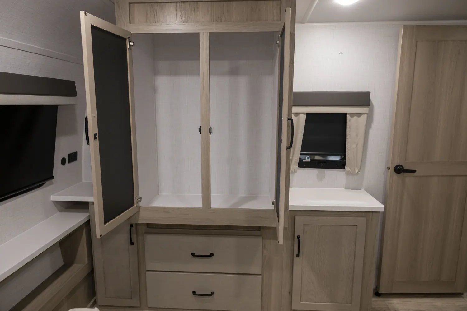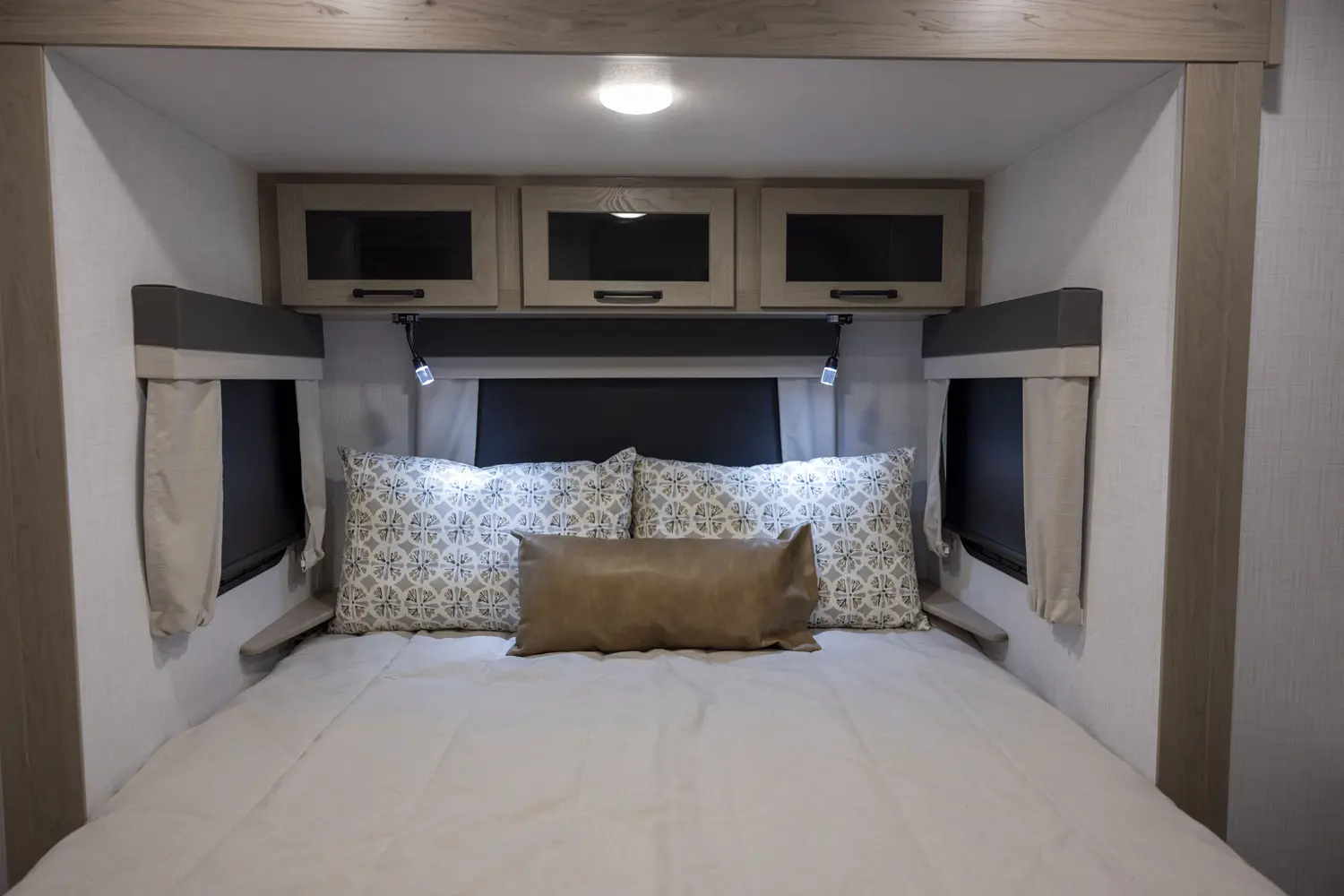 This rear entertainment layout will make you forget you are even in a camper. The front bedroom is very spacious and offers plenty of room to make the bed and get dressed for the adventures of the day.