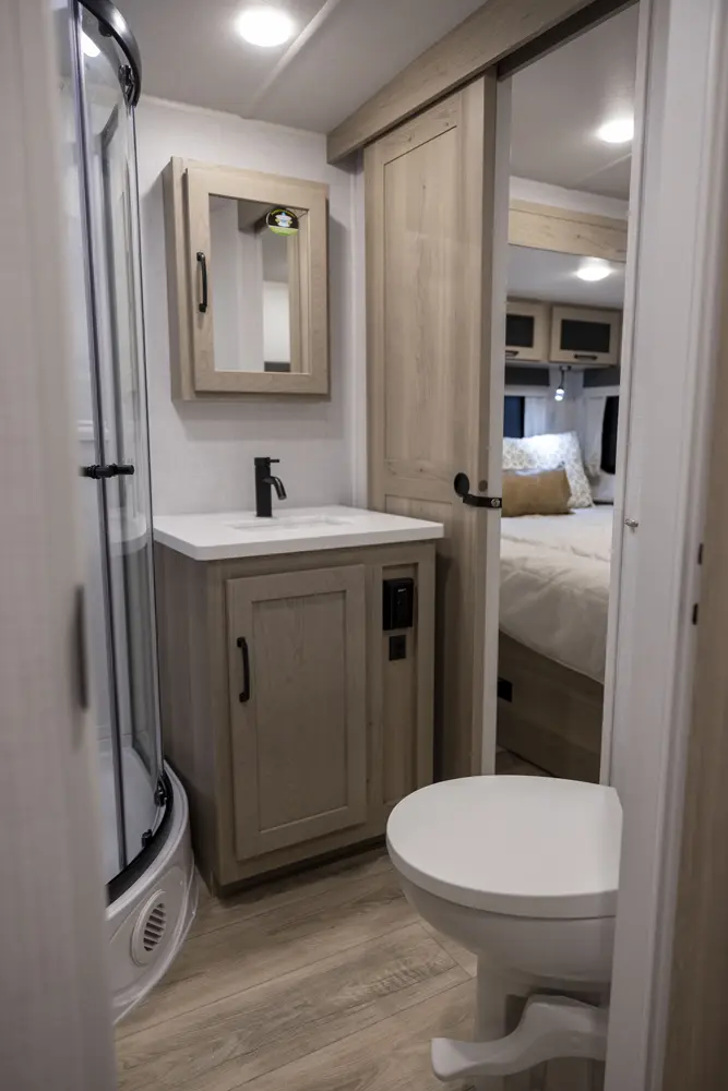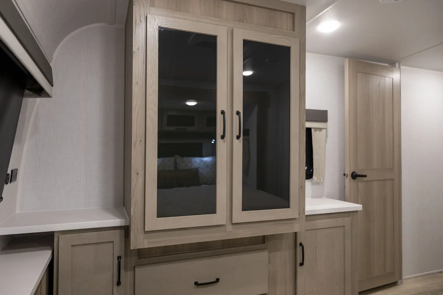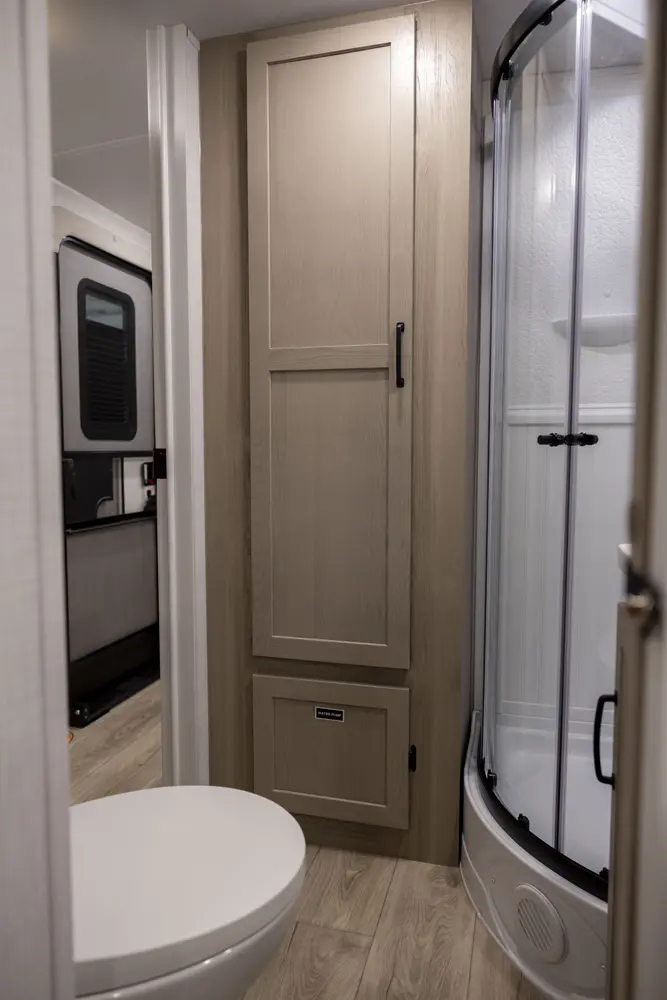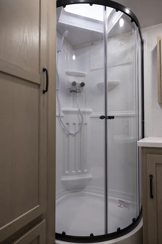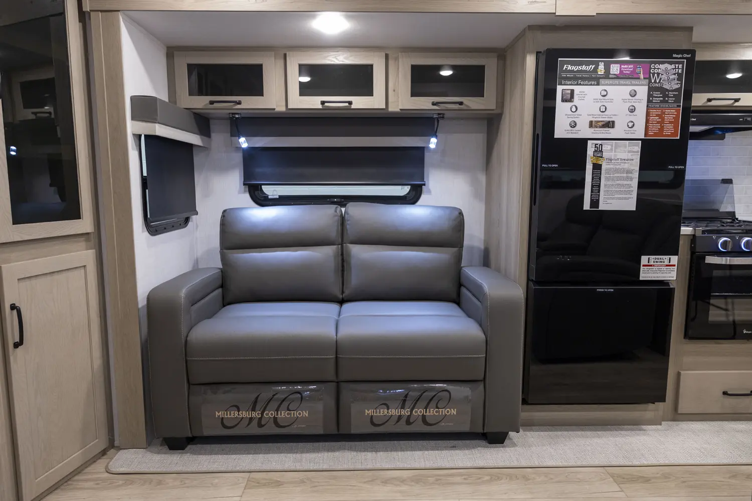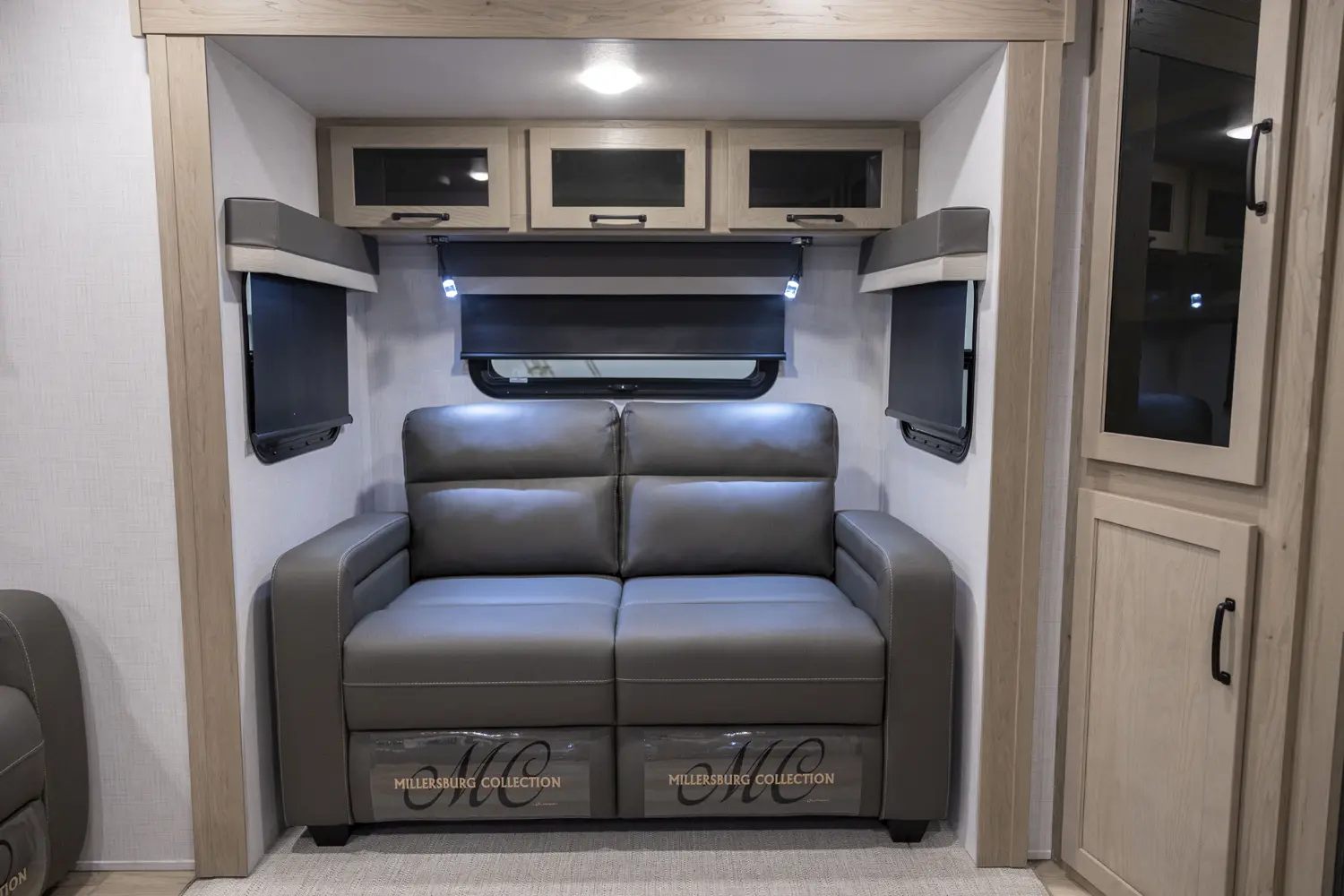 This rear entertainment layout will make you forget you are even in a camper. The front bedroom is very spacious and offers plenty of room to make the bed and get dressed for the adventures of the day.