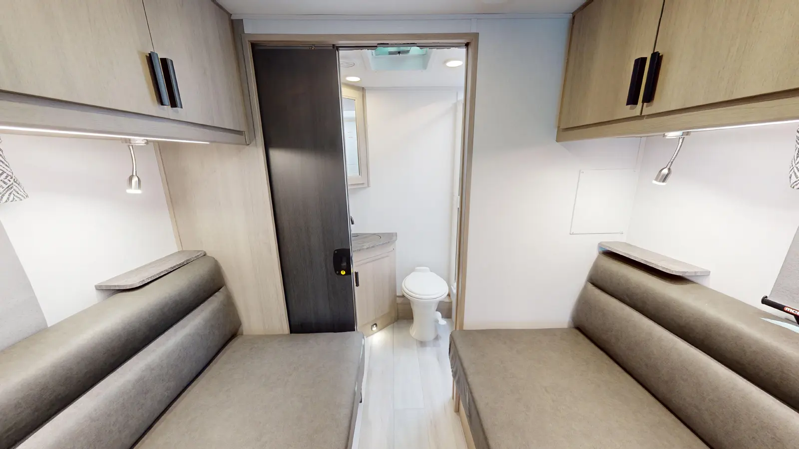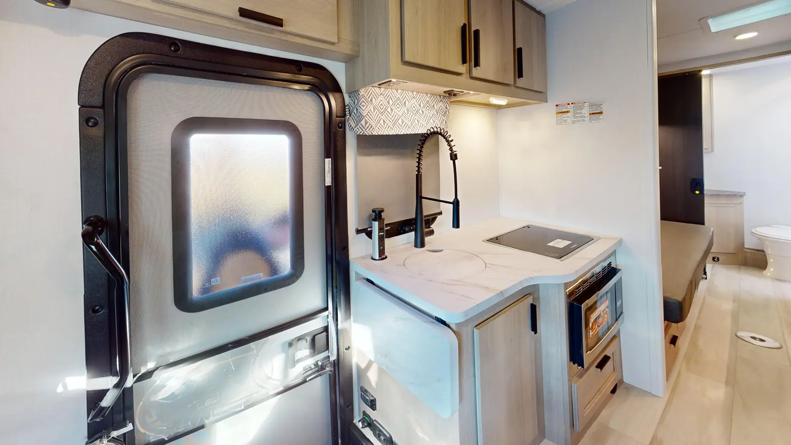The TS2371 has 1 slide out on the off-door side. Exterior features include a 14' awning and it is built on the 3.5L Eco-Boost V6 Gas Transit chassis (2WD & AWD available). Interior layout from front to back includes a cab over entertainment center, off-door side slide out holding a 12V refrigerator, overhead cabinet and love seat with table; door side kitchen with induction stovetop with convection microwave, overhead cabinet, sink and flip-up countertop extension; bedroom with opposing side 33 x 78 twin beds with overhead cabinets and a 12V TV; rear bathroom with wardrobe, medicine cabinet, sink, toilet and 24 x 36 shower.