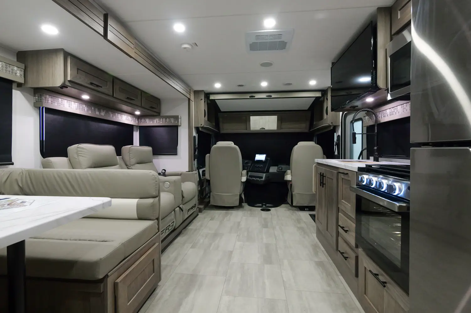 The FR3 30DS motorhome offers everything you need for comfortable RV travel. Enjoy meals at the wrap-around dinette or relax on the hide-a-bed sofa. The kitchen features a 15 cu. ft. refrigerator, pantry, and microwave. The rear bedroom includes a king bed, TV, wardrobe, and washer/dryer prep. The split bathroom offers added convenience.