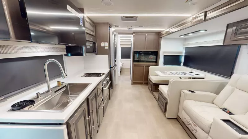 Our Georgetown 31X7 by Forest River is perfect for travelers looking for a compact and easy to drive motorhome coming in at 33ft 11in. The bedroom makes no sacrifices with a king size bed slide, washer/dryer prep and lots of wardrobe space. You also still get a full bathroom with the shower split making it convenient for your partner to shower while you get ready by the sink. There's also plenty of seating up front for guests and the dinette converts into a bed for occasional guests!