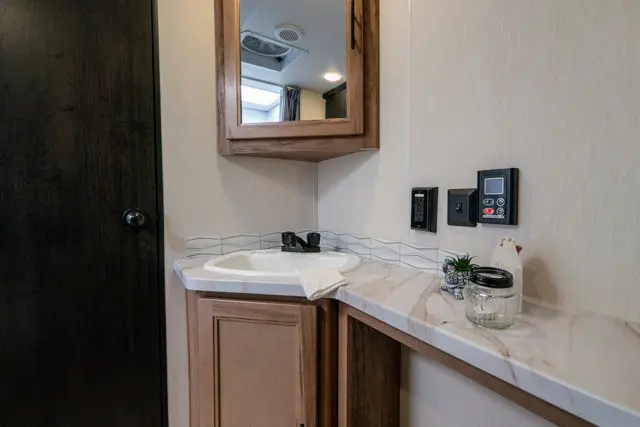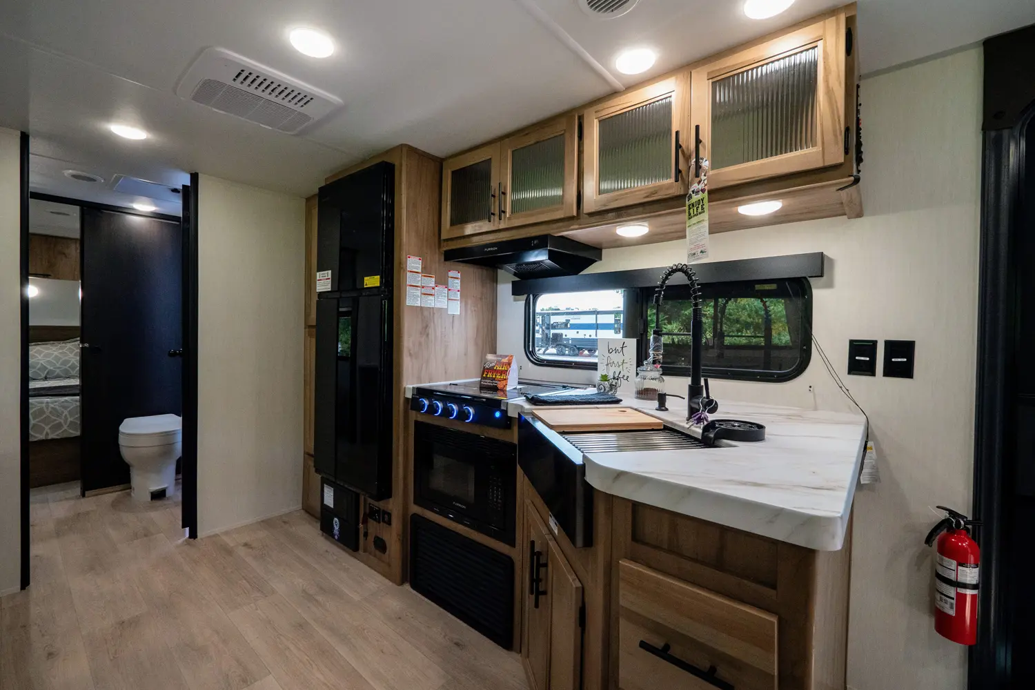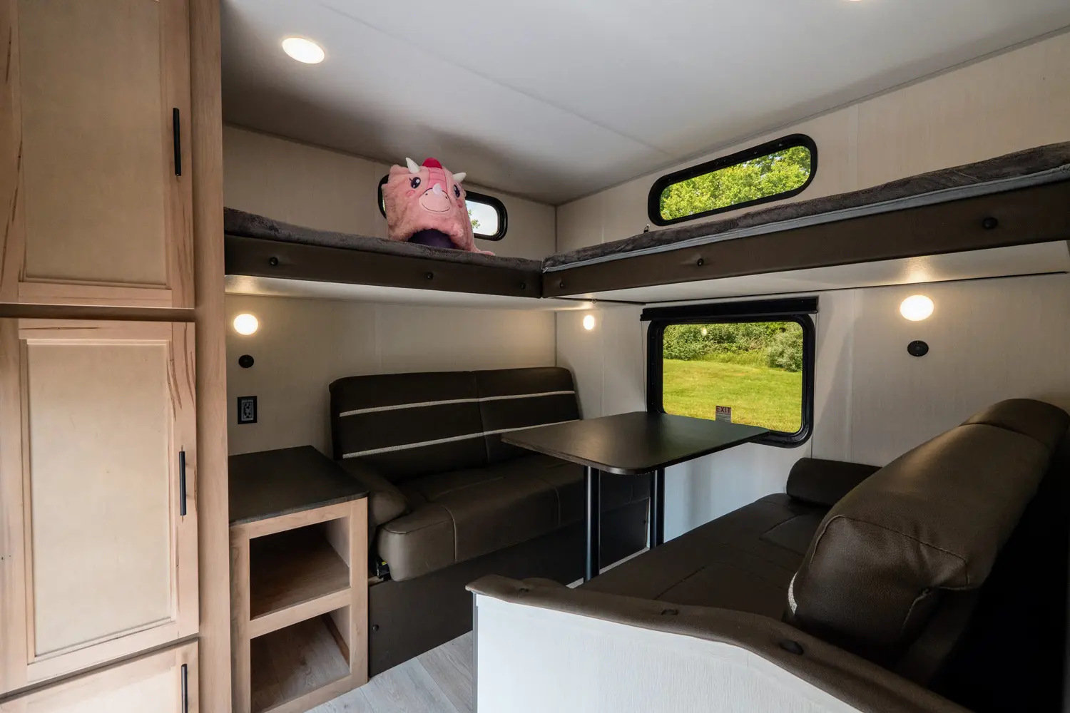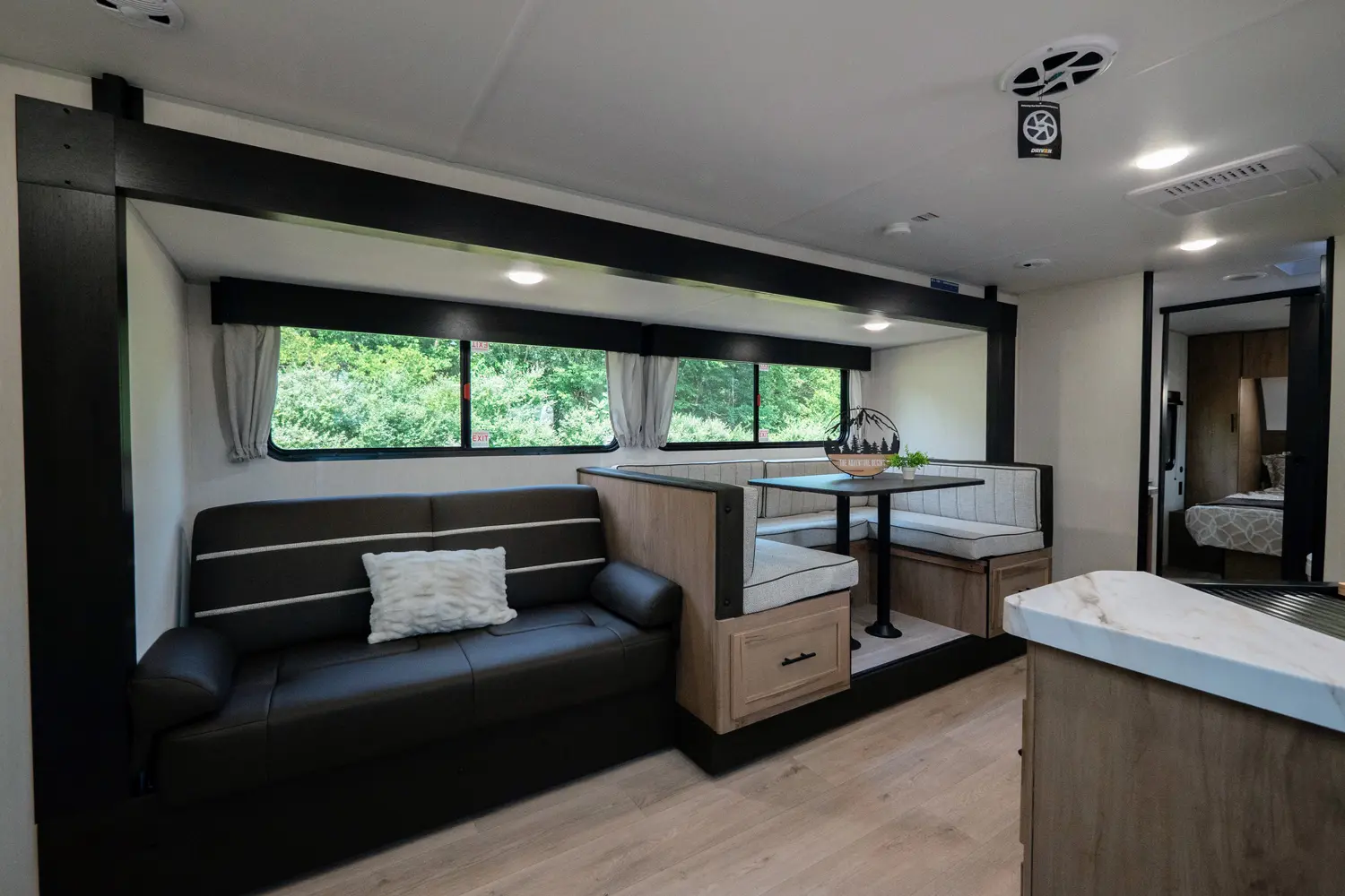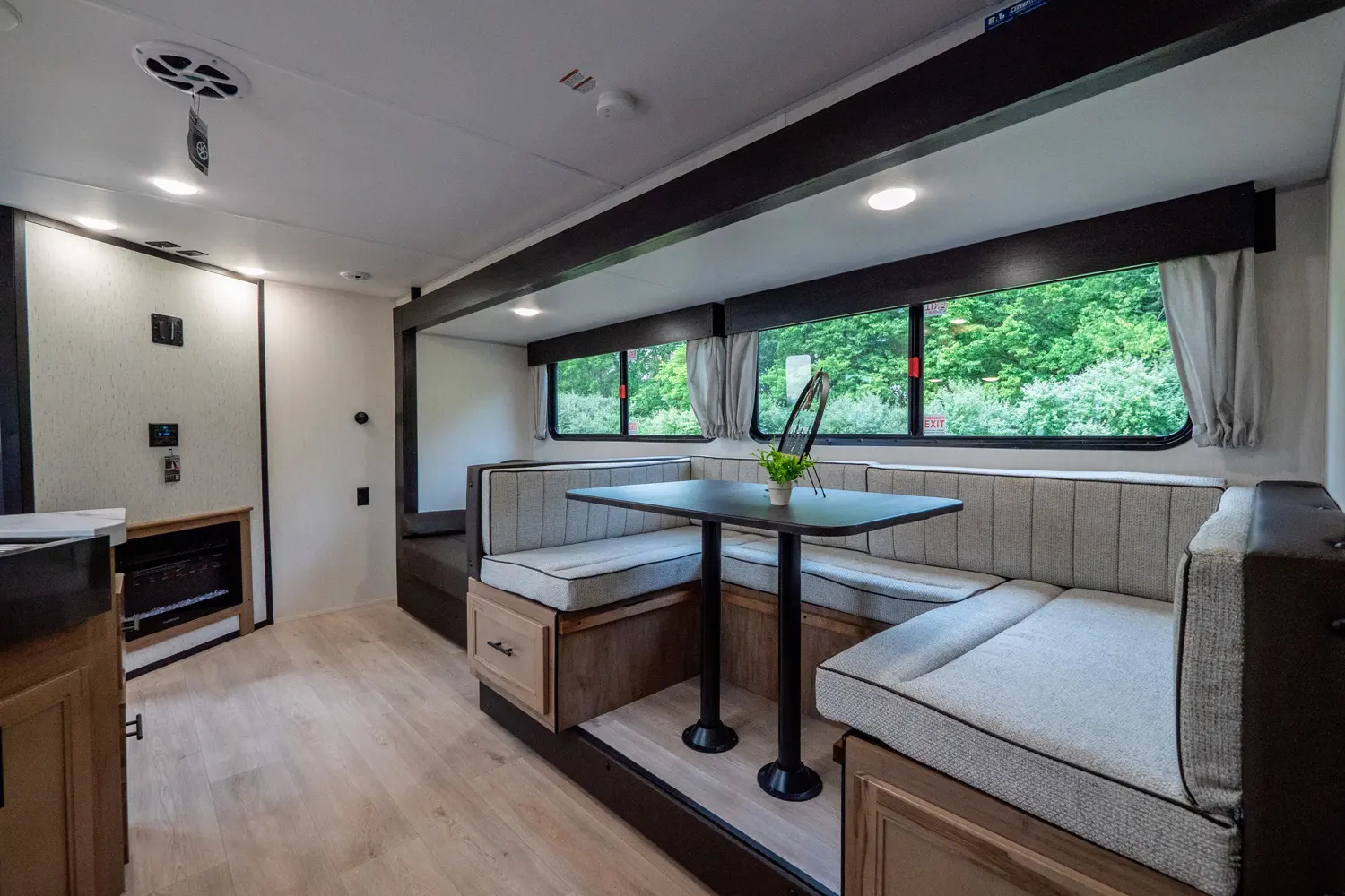The Cherokee Grey Wolf 29NM by Forest River offers a unique floorplan with a rear bunkhouse that features a collapsable dinette, providing flexibility and space-saving functionality. The spacious living room, highlighted by a cozy fireplace and large windows, creates a welcoming atmosphere. The well-equipped kitchen, with its U-shaped dinette, full pantry, and ample prep space, is perfect for cooking and entertaining. Experience the comfort and versatility of the Cherokee Grey Wolf 29NM.