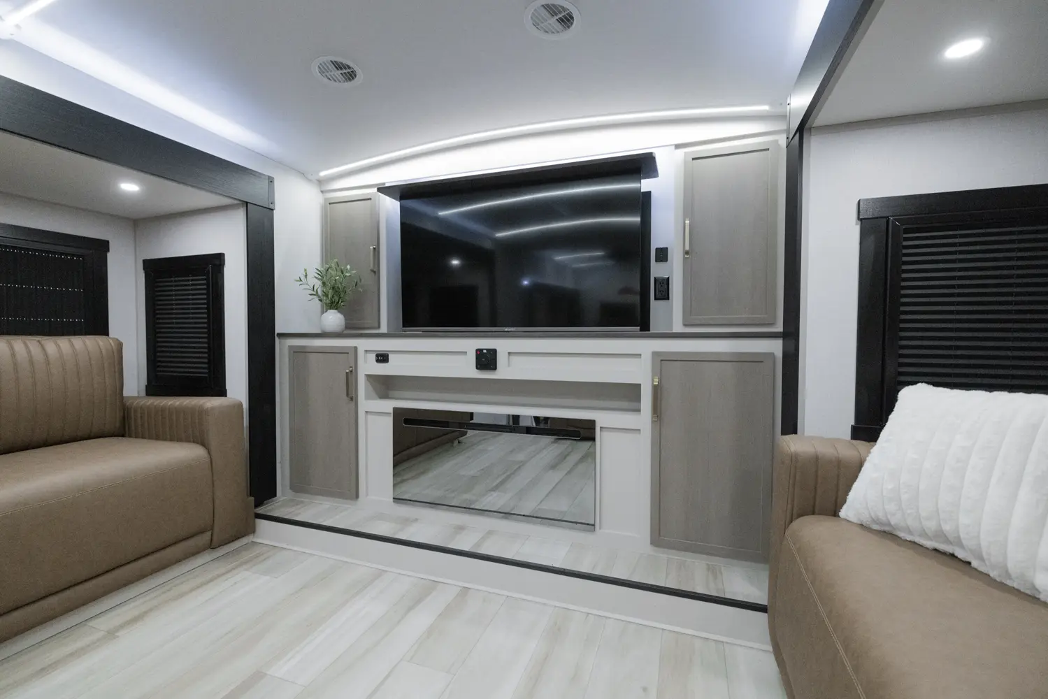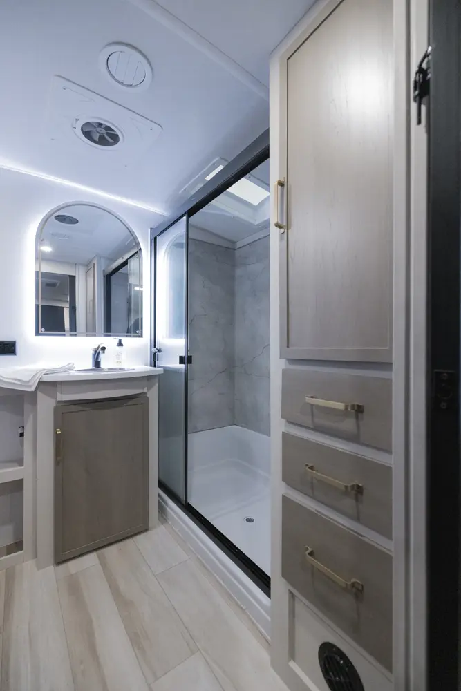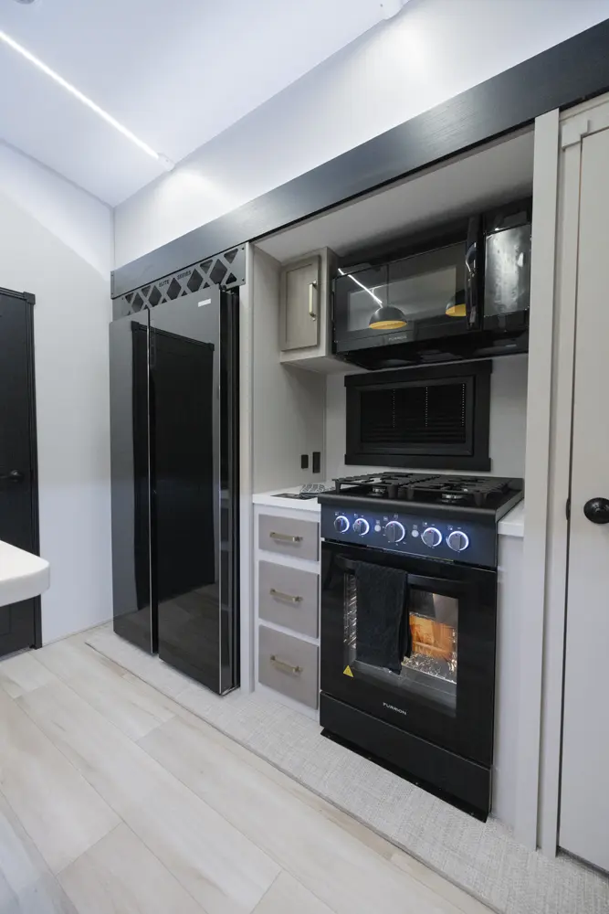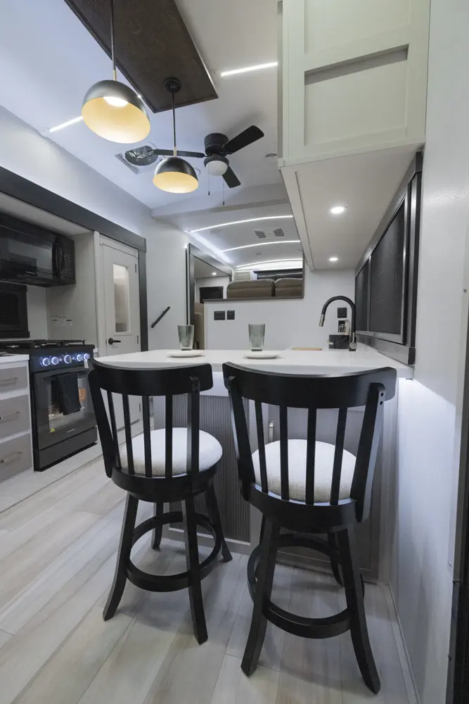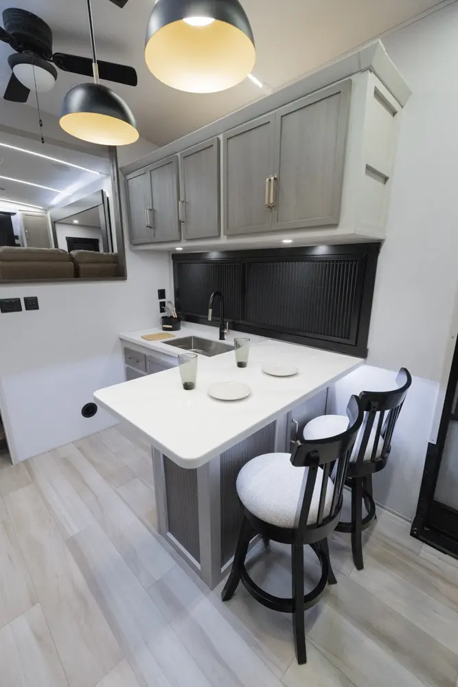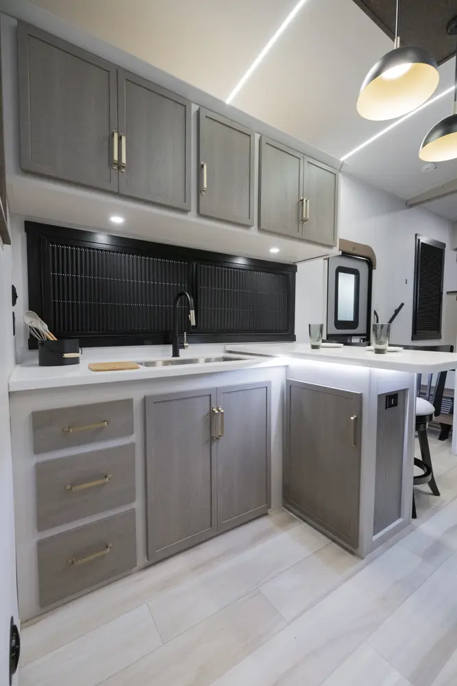 The 36FL takes the term "Elite" to a whole new level. This floorplan takes all of the great advantages of a front living fifth wheel and adds in TONS storage. It also sports the LARGEST outside kitchen of any front living model. This show-stopper of a floorplan also offers a bath & 1/2.