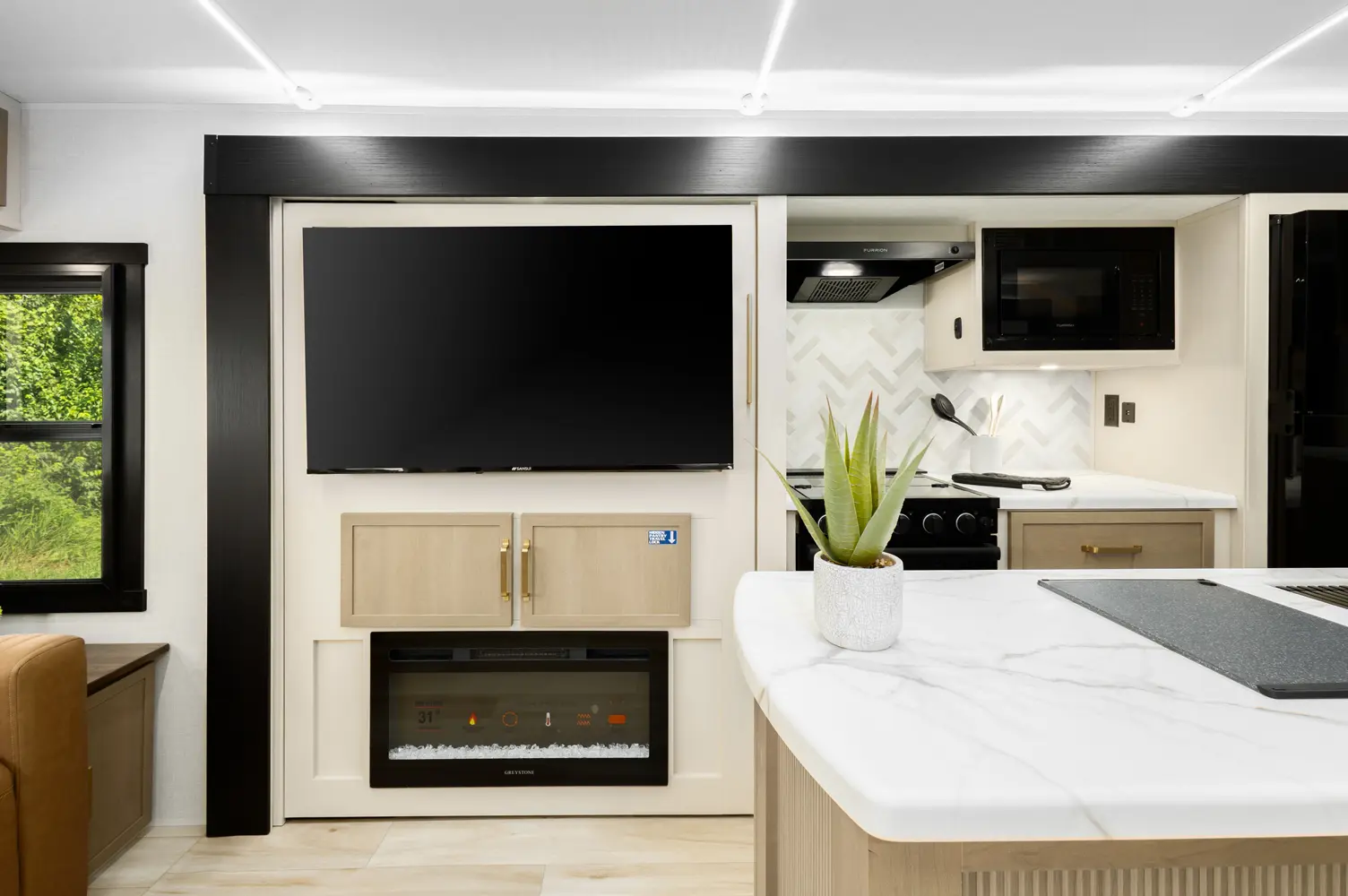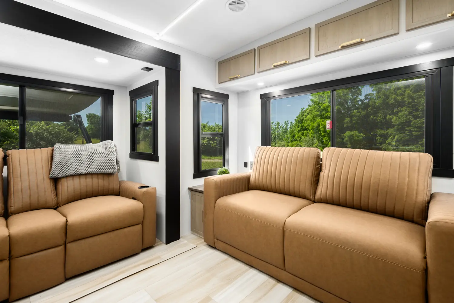 Touting 3 slide-outs, the 308RL is the most spacious Hemisphere Travel Trailer for coupes. Enjoy a breath-taking view of your campsite in the living room or relax in the wide-open bedroom. Past the bedroom you'll find a WALK-IN wardrobe, and washer/dryer prep area spacious enough for separate washer & dryer. (This is the only model without a windshield, because we didn't think your laundry would care to see outside).