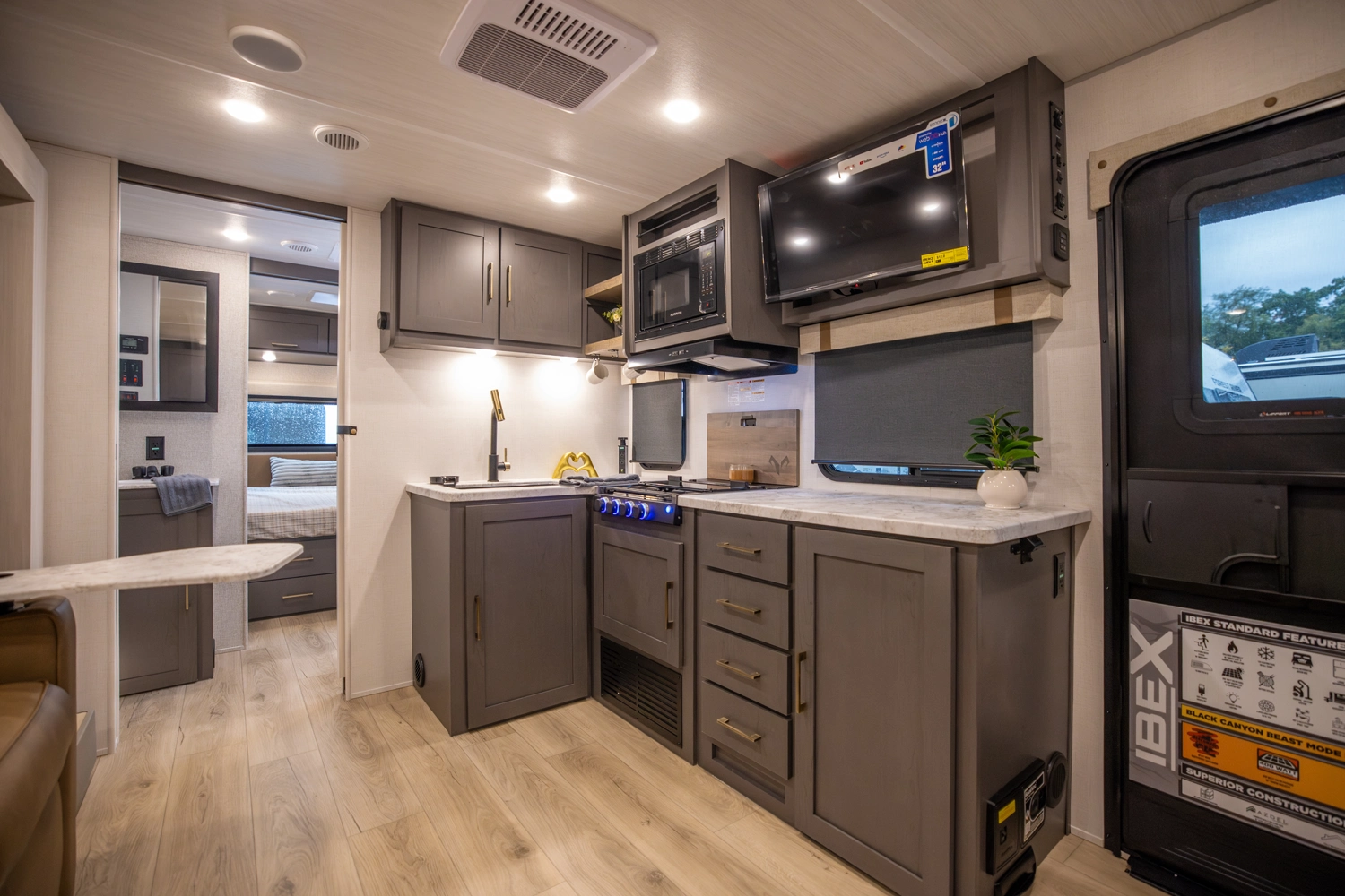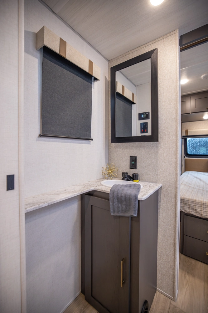 The 25RLSS front master bedroom features a queen-sized bed with dual wardrobes, providing ample storage space. The walk-through bath offers convenient access from both the living area and the bedroom. The rear living space boasts a tri-fold sofa slide-out and a booth dinette, creating a comfortable area for relaxation and dining. The well-equipped kitchen includes a microwave air fryer, refrigerator and large pantry. Exterior features like 12V heated pads and a 19' awning complete this coach.