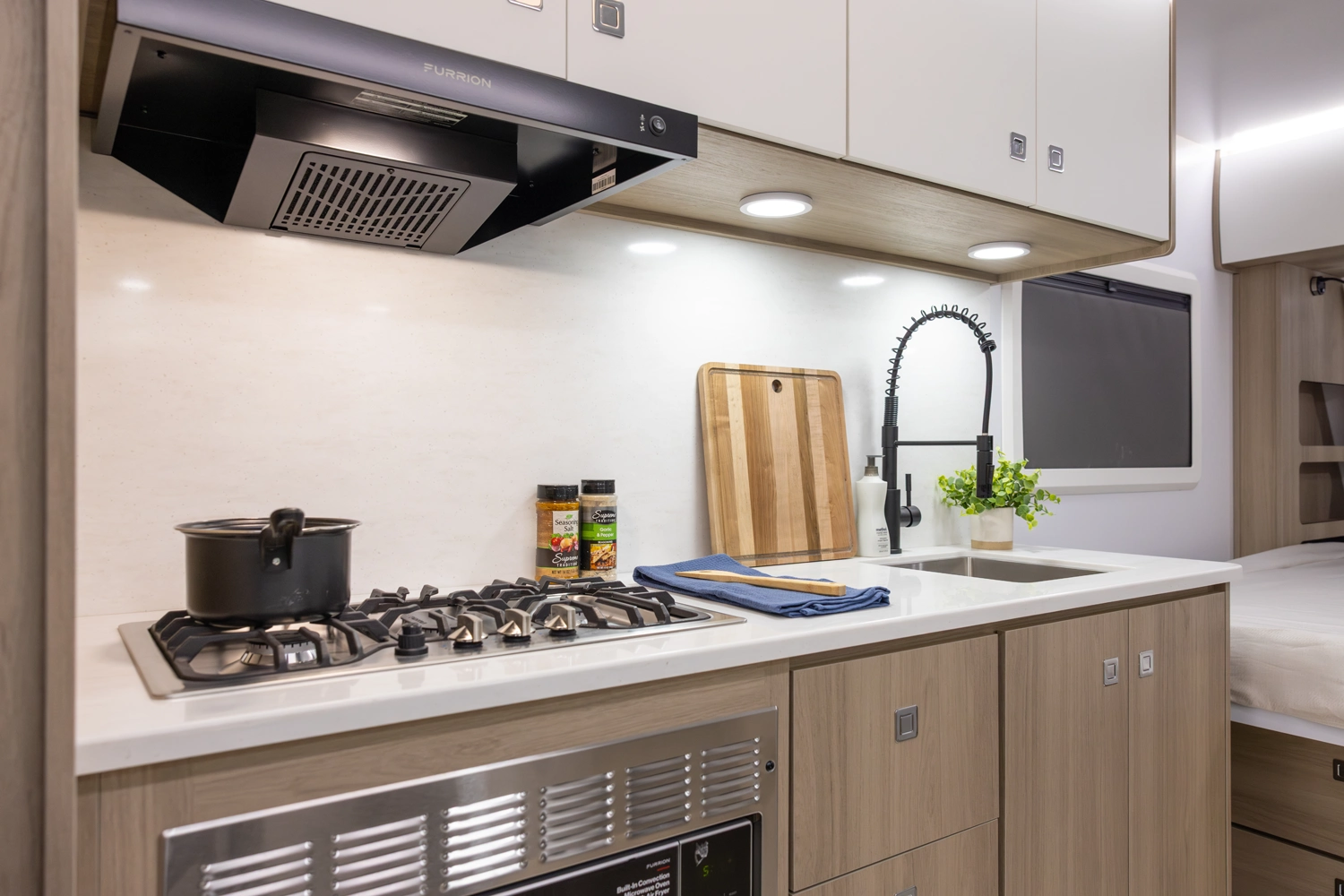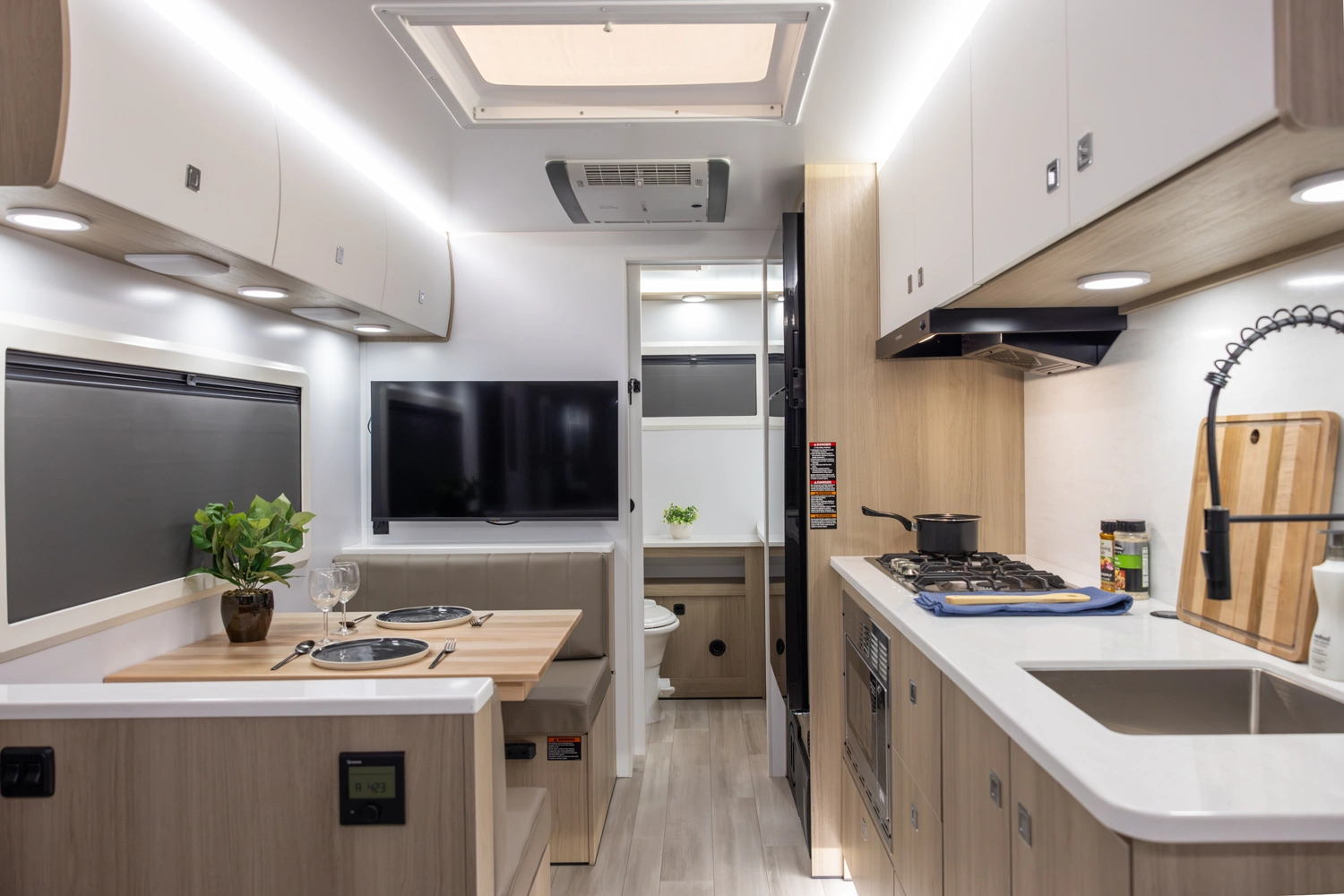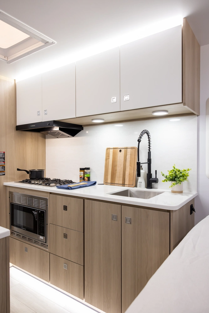 This floorplan provides all necessities without compromising space! It features a full-size queen bed, a 4-person dinette that converts to a bed, and ample bathroom counter space, ensuring comfort for everyone. The oversized passthrough storage compartment offers room for everything you need. Cooking is easy with a 3-burner cooktop, convection microwave oven, a 10.7 cu ft refrigerator, 6 cabinets, and 4 drawers. The robust solar system allows all components to operate without being plugged in.