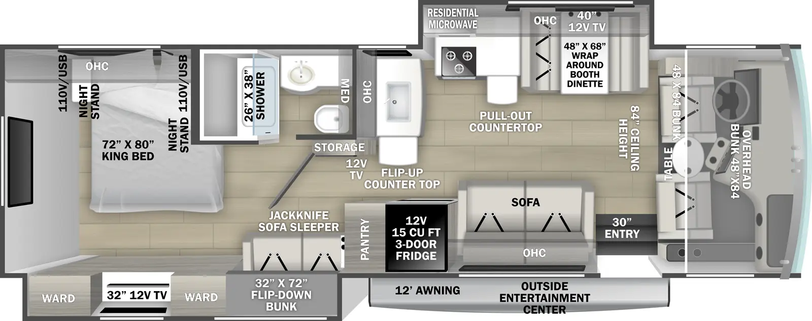 Looking for a family-friendly RV? The FR3 32DS bunkhouse motorhome by Forest River offers sleeping space for everyone! Featuring a king bed, flip-down bunk, jackknife sofa, and cabover bunk, this Class A RV is perfect for family camping trips. Enjoy an exterior TV under the power awning and a comfortable interior with a full bathroom. Built on a Ford chassis.