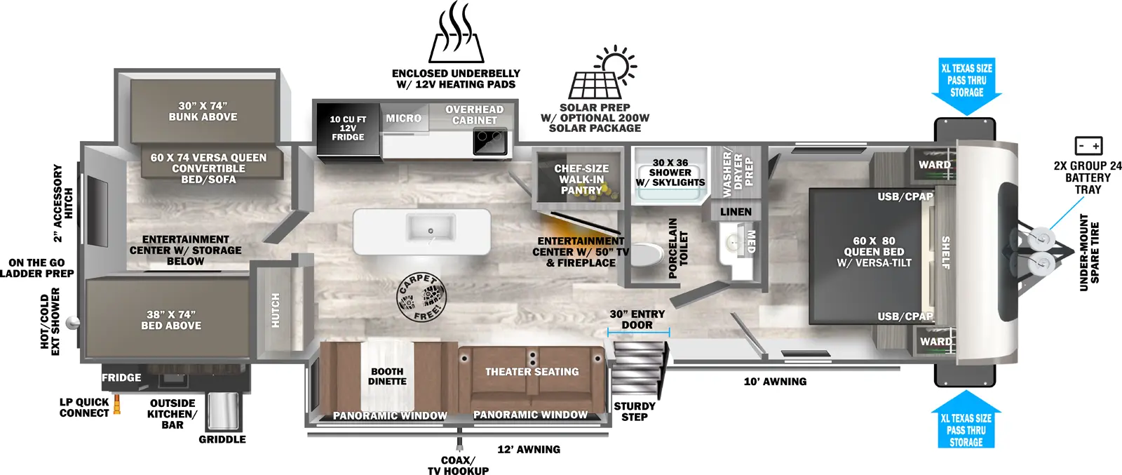 Camping with your family shouldn't require you to sacrifice your living space. With the 310BHI, you don't have to. This floorplan offers a MASSIVE outside kitchen, direct viewing of your campsite, a standard 50" TV, and a pantry most houses would dream of. If that wasn't enough, the 310BHI comes standard with stackable washer/dryer prep thoughtfully located in the bedroom closet/wardrobe.