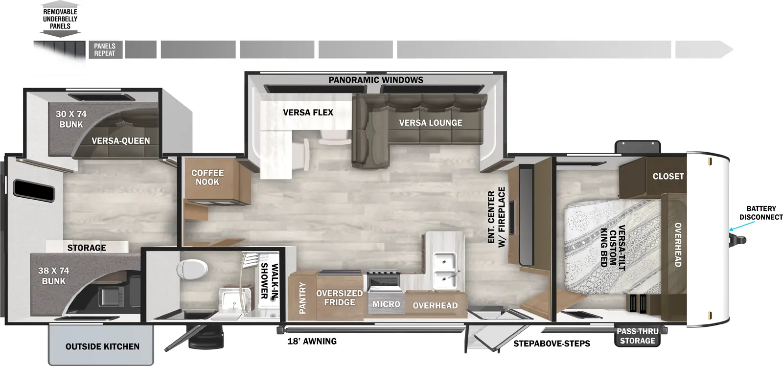 The 32BHDS is the ultimate bunkhouse, with two total slide outs and an outside kitchen. This well-equipped travel trailer features oversized panoramic windows, the ever-popular U-dinette, which you can customize with the adjacent Versa-Lounge. The kitchen includes a 11 CU. FT. refrigerator and stovetop with oven and LED accents, plus cabinets for all your cooking essentials!