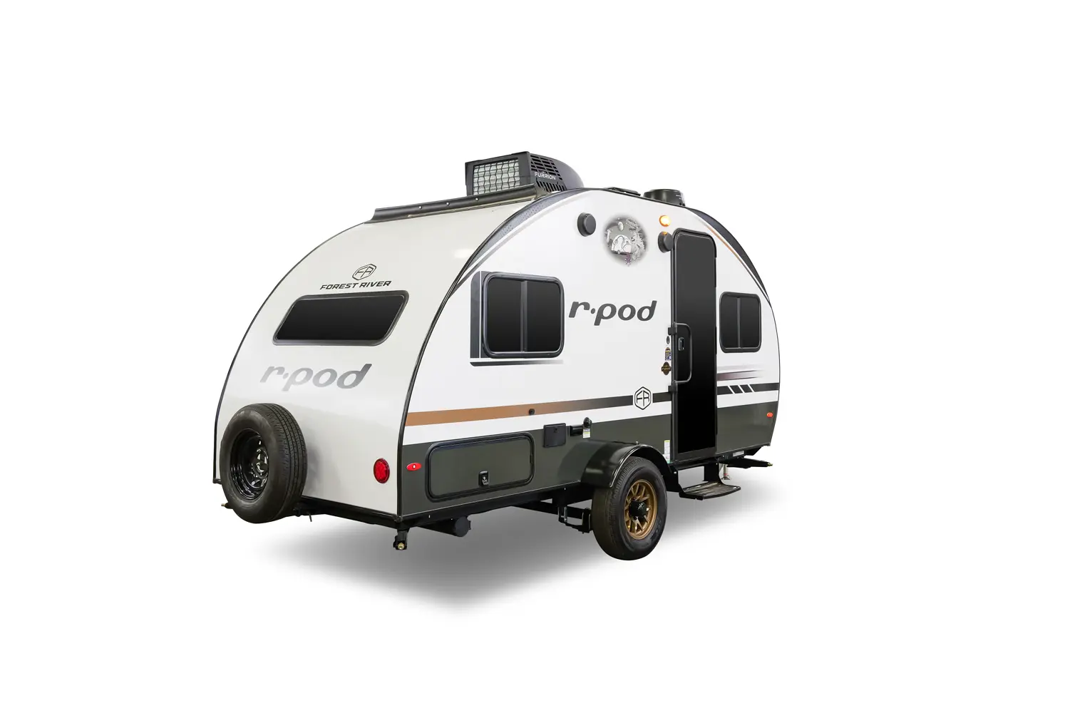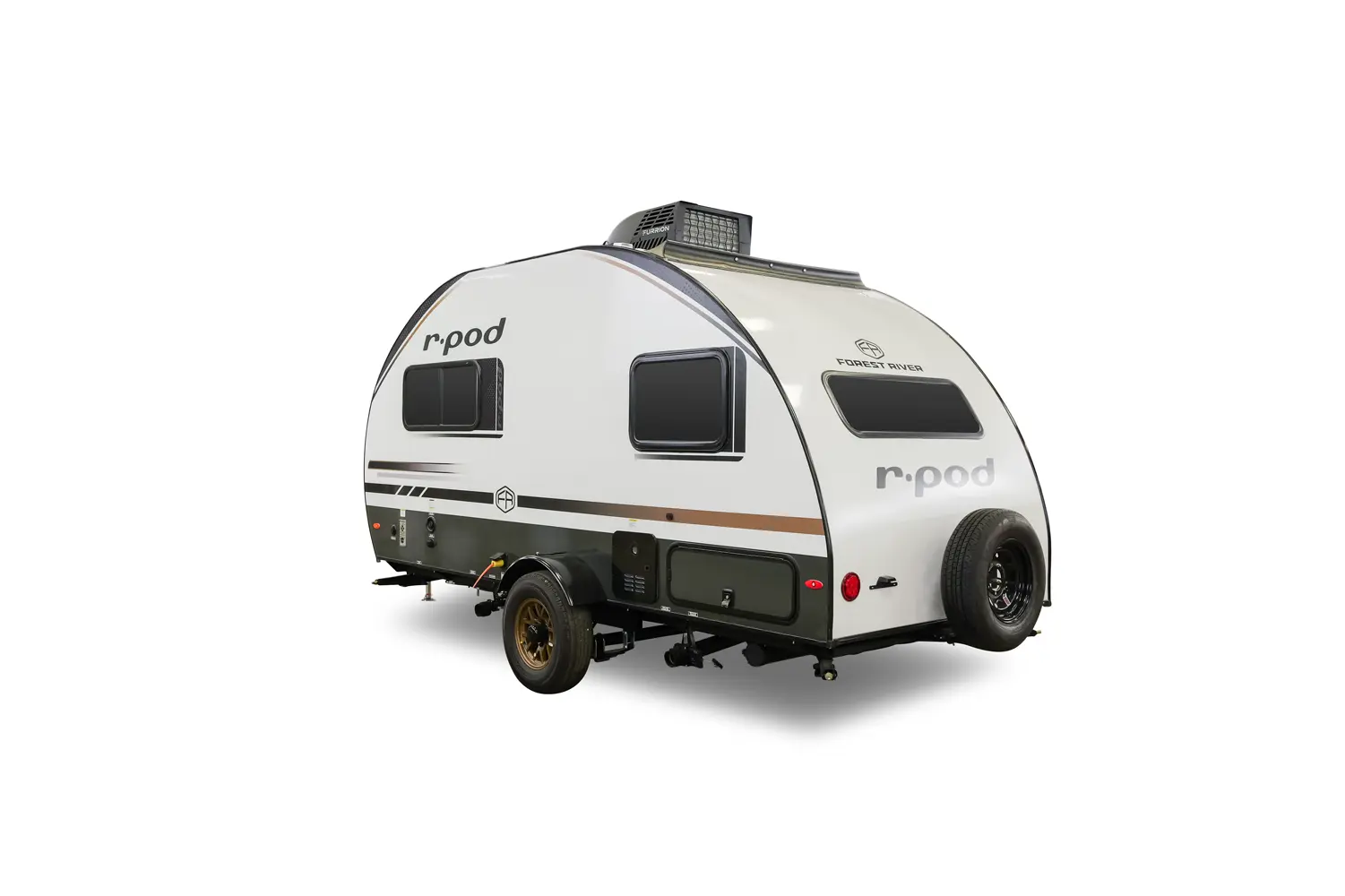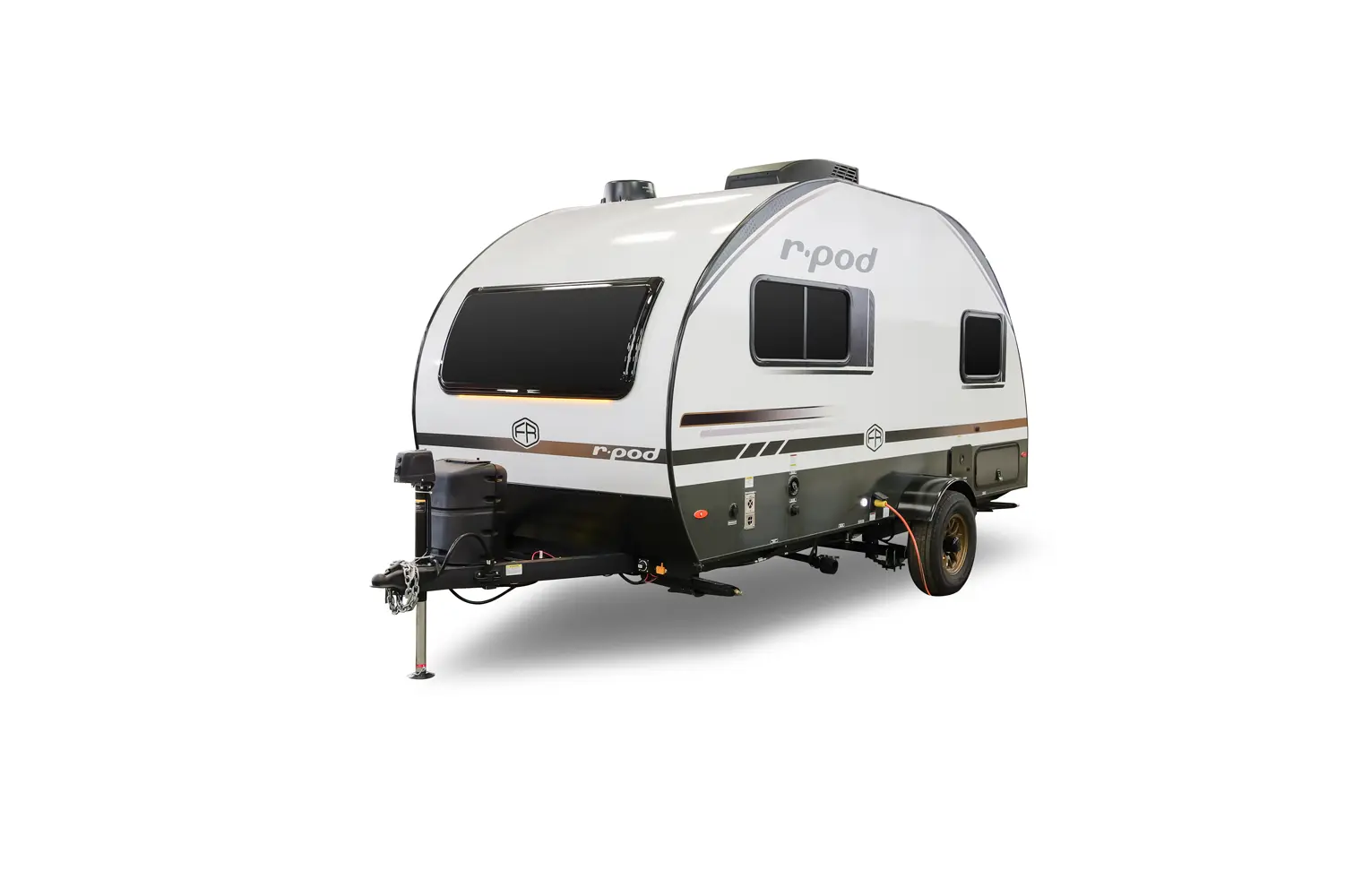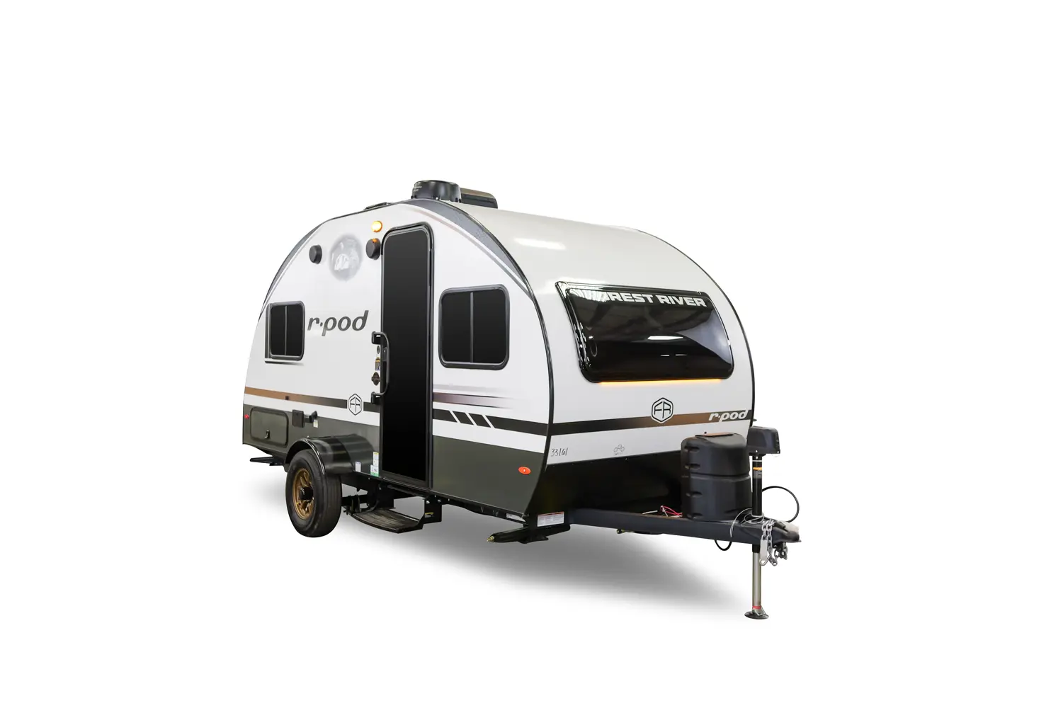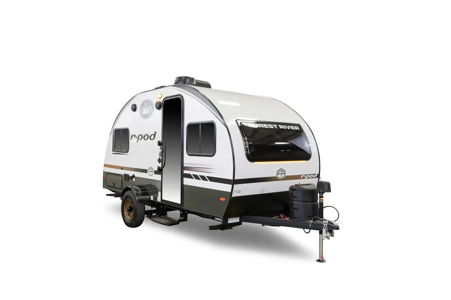The RP-171 has zero slideouts and one entry. Exterior features slam latch cargo doors, upgraded tires with TPMS, hot and cold spray port, rear accessory hitch, on demand tankless water heater, 15,000 BTU air conditioner, enclosed underbelly with forced heat, and large roof mounted solar panel 30 amp controller & inverter prep. Interior layout front to back: front dinette; off-door side kitchen counter with sink, convection microwave, cooktop, overhead cabinet, and refrigerator; door side entry, central vacuum, wet bathroom, and night light; rear queen bed with door side TV.