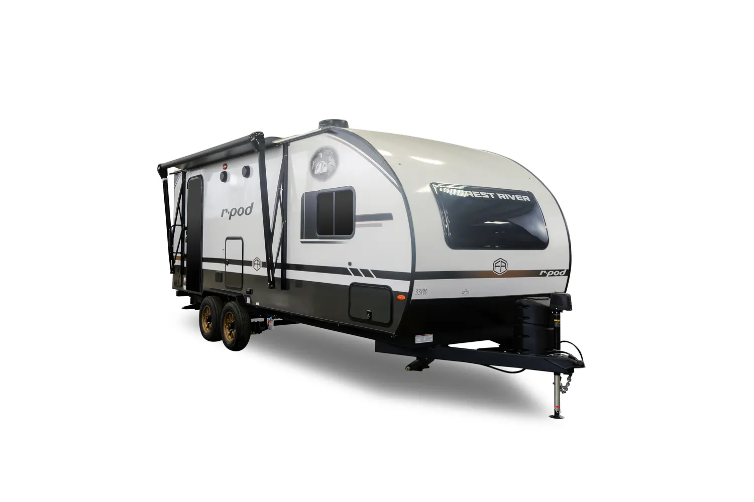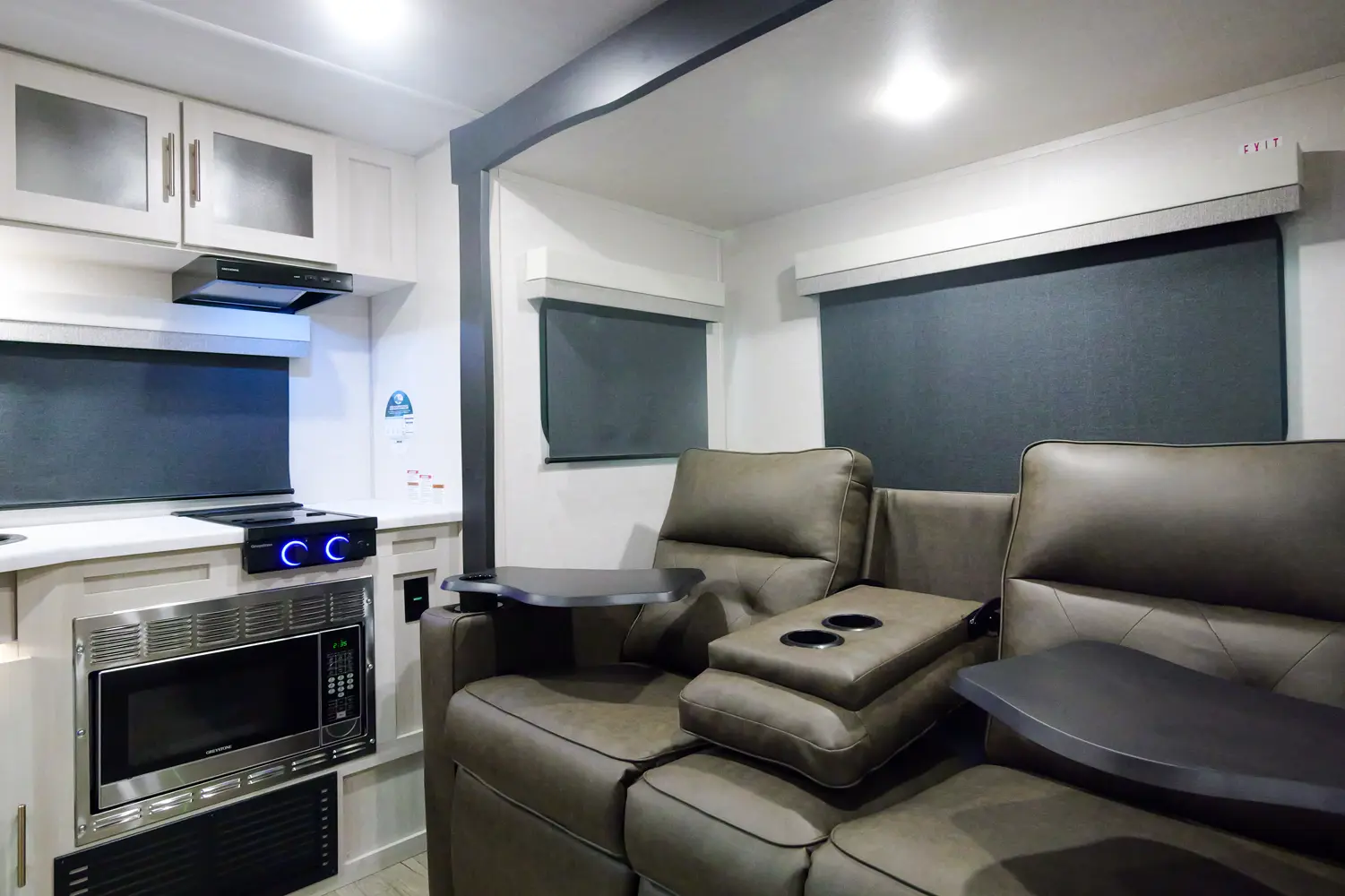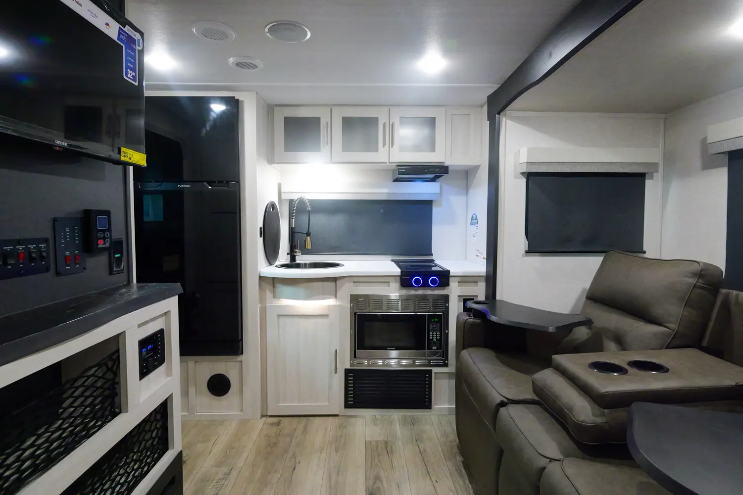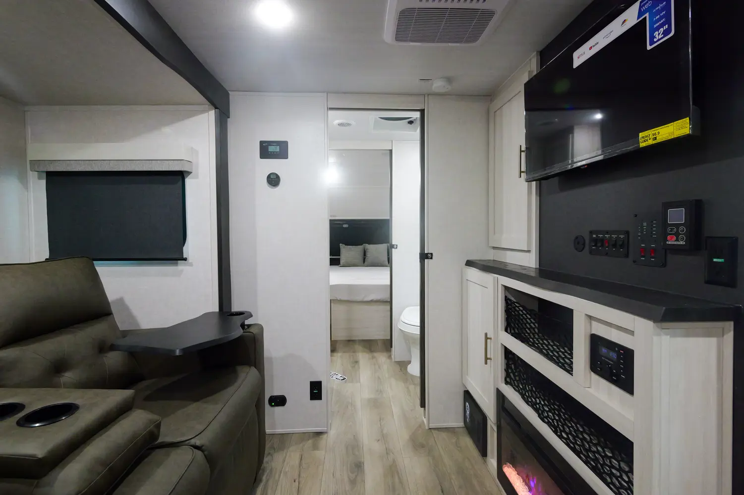 The RP-202 has one slideout and one entry. Exterior features 12 foot awning, upgraded tires with TPMS, outside kitchen, hot and cold spray port, on-the-go ladder prep, rear accessory hitch, on demand tankless water heater, 15,000 BTU air conditioner, enclosed underbelly with forced heat, and large roof mounted solar panel 30 amp controller & inverter prep. Interior layout front to back: foot-facing queen bed with wardrobe and end tables on each side, and entertainment center along inner wall; walk-through full bathroom with linen closet and night light; off-door side slideout with dinette and overhead cabinet (optional theater seat); door side fireplace with entertainment center, central vacuum, pantry, and entry; rear kitchen with refrigerator, sink, cooktop, convection microwave, and overhead cabinet.