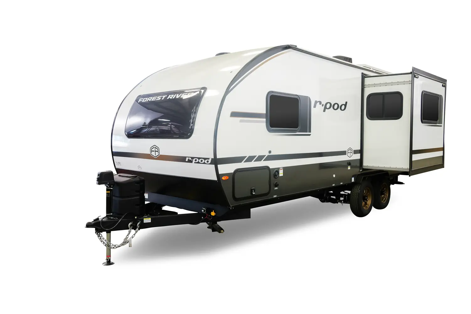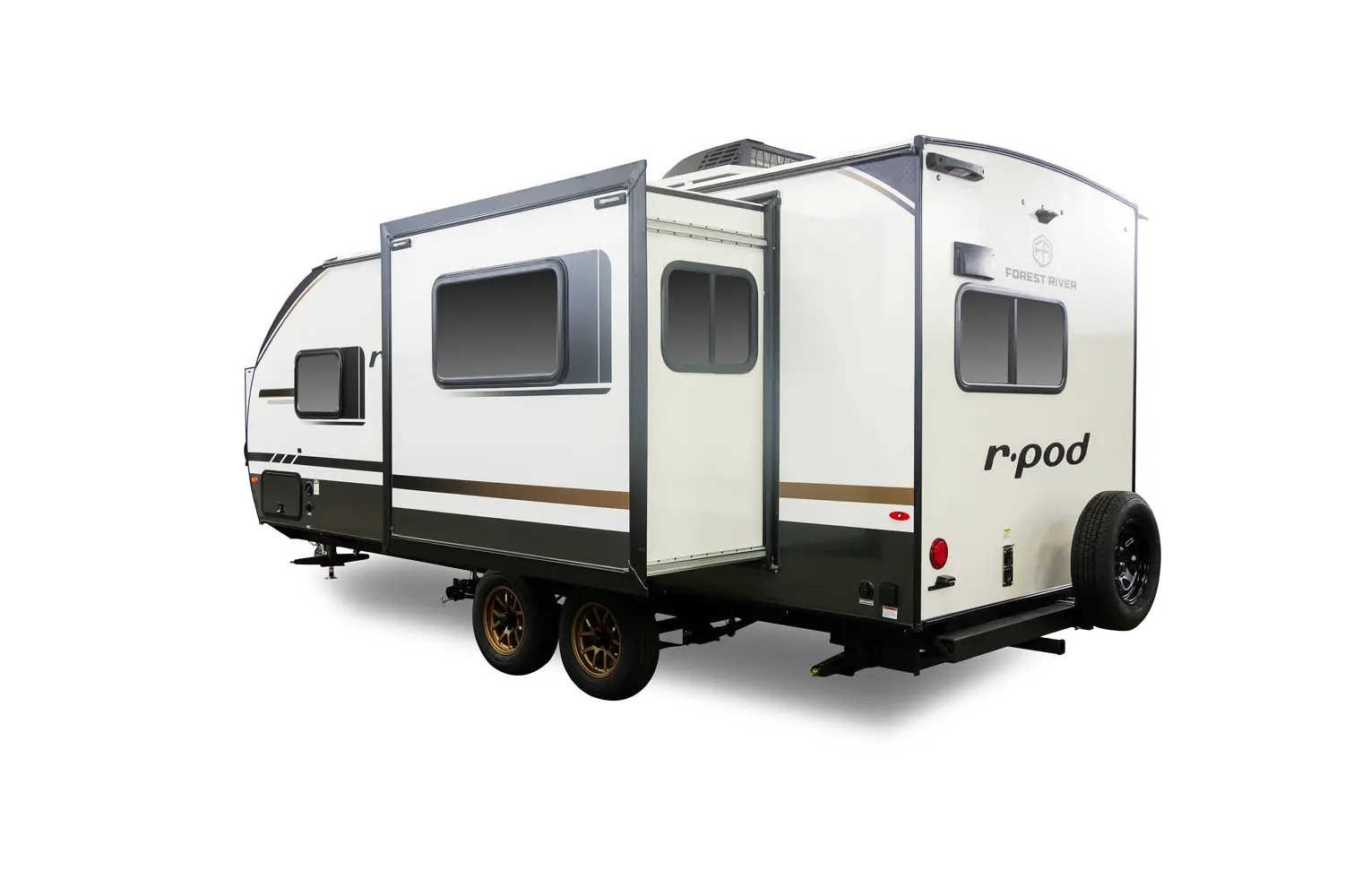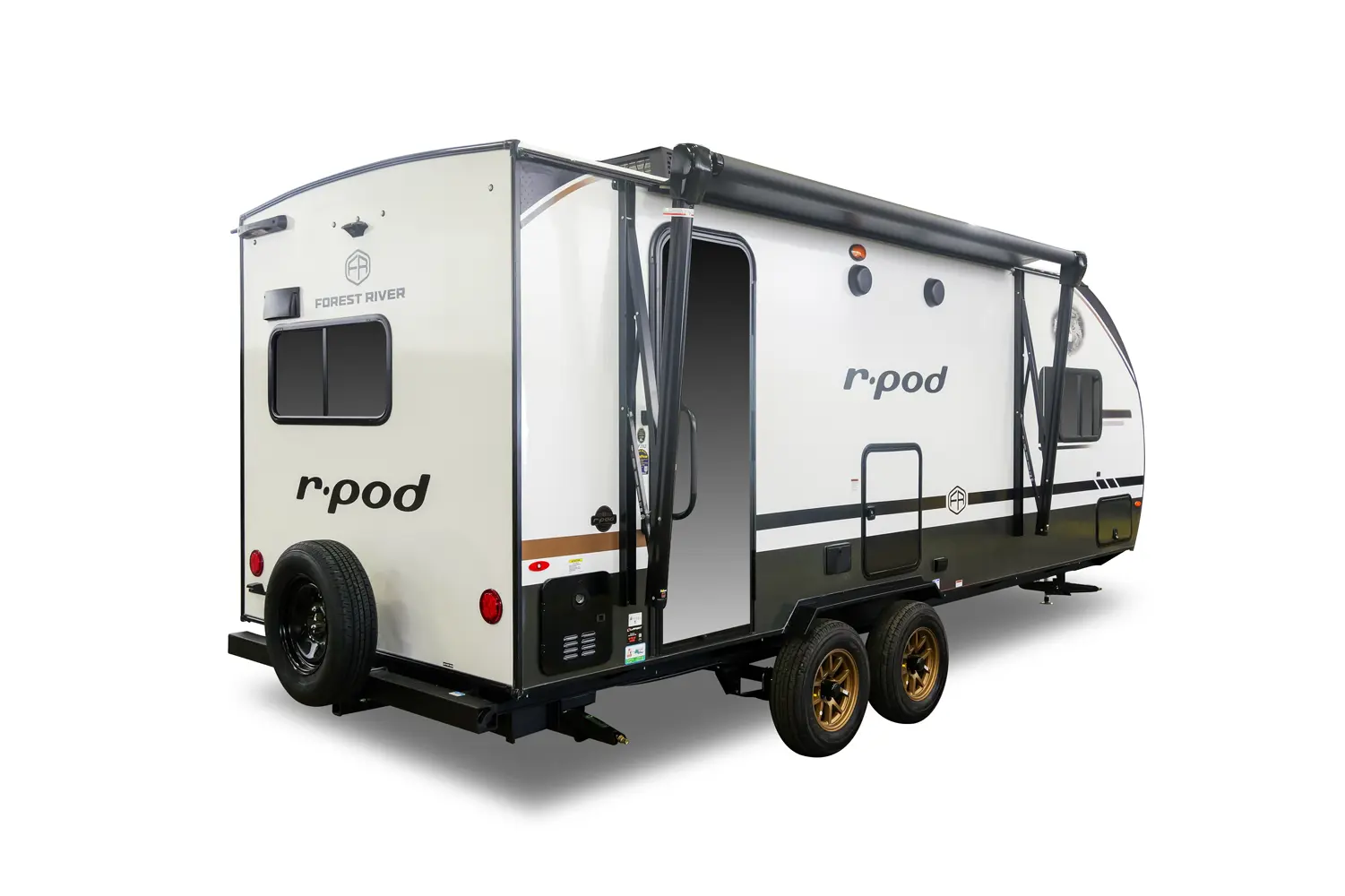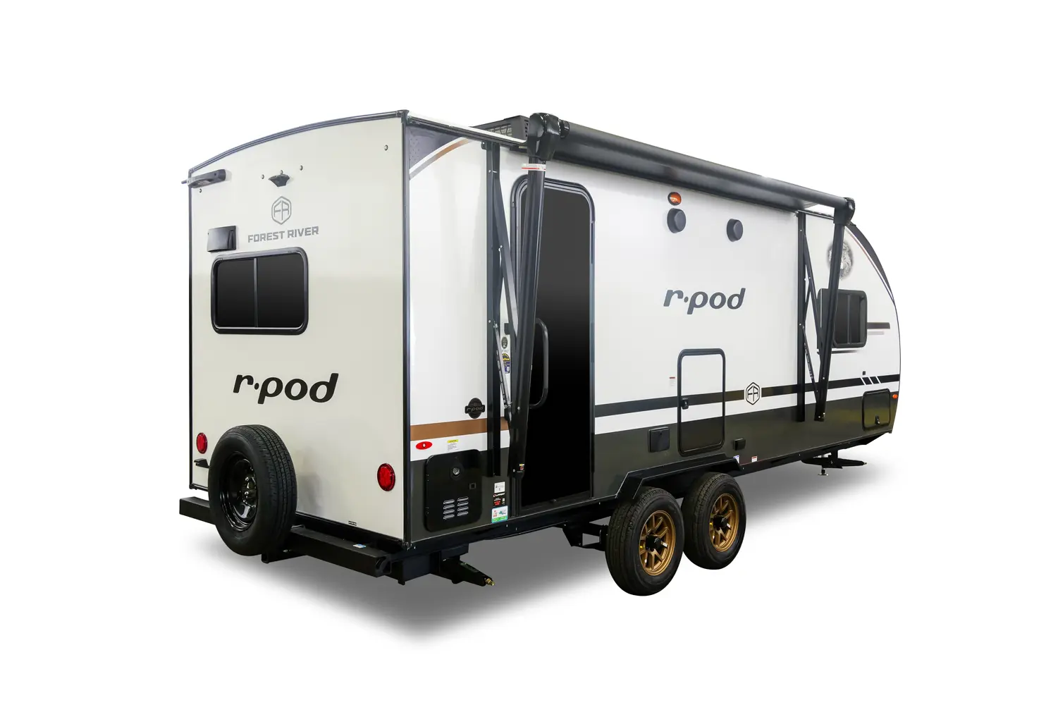The RP-202 has one slideout and one entry. Exterior features 12 foot awning, upgraded tires with TPMS, outside kitchen, hot and cold spray port, on-the-go ladder prep, rear accessory hitch, on demand tankless water heater, 15,000 BTU air conditioner, enclosed underbelly with forced heat, and large roof mounted solar panel 30 amp controller & inverter prep. Interior layout front to back: foot-facing queen bed with wardrobe and end tables on each side, and entertainment center along inner wall; walk-through full bathroom with linen closet and night light; off-door side slideout with dinette and overhead cabinet (optional theater seat); door side fireplace with entertainment center, central vacuum, pantry, and entry; rear kitchen with refrigerator, sink, cooktop, convection microwave, and overhead cabinet.