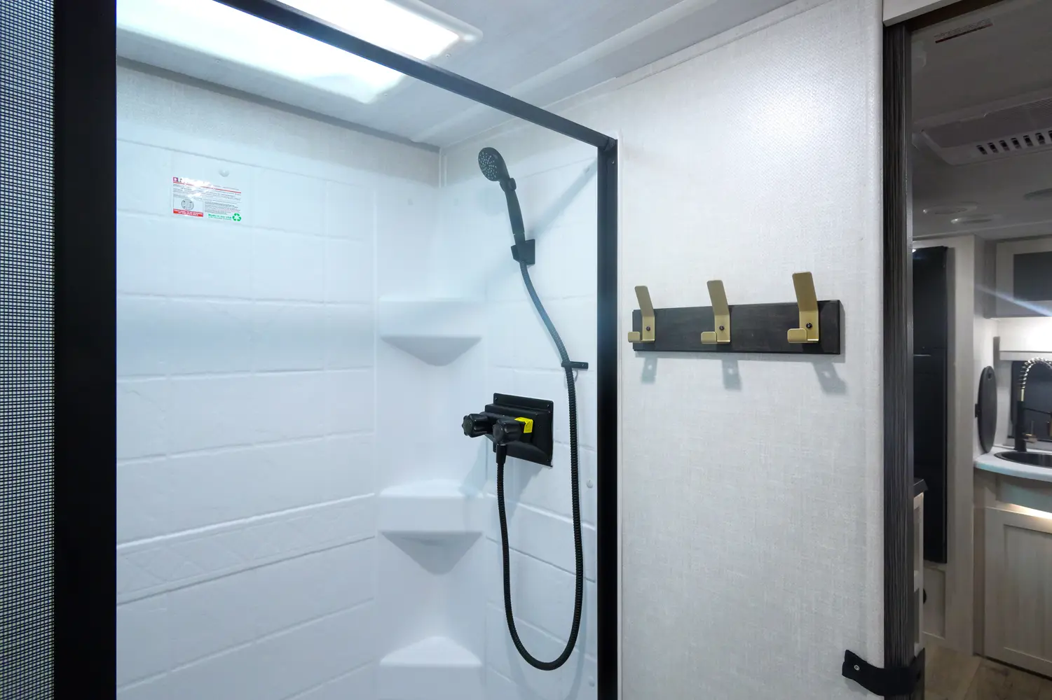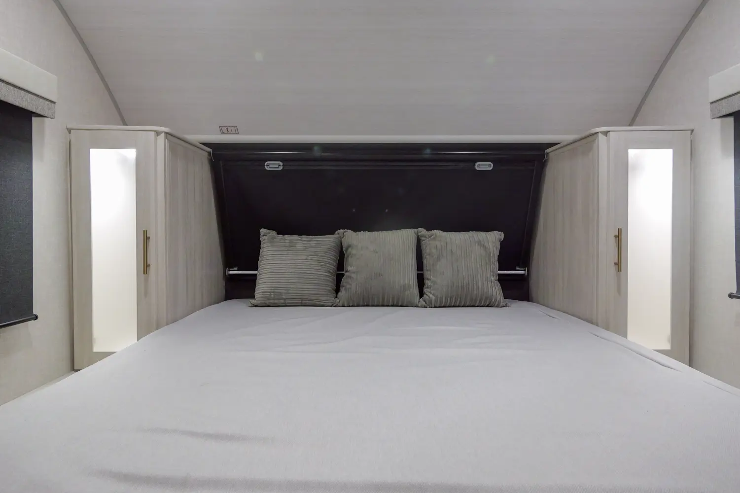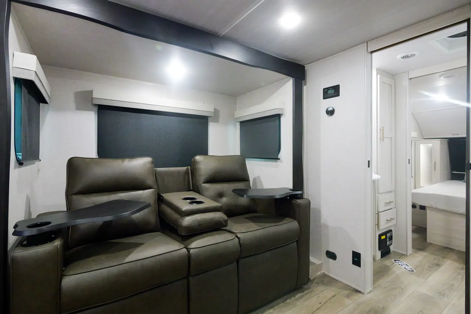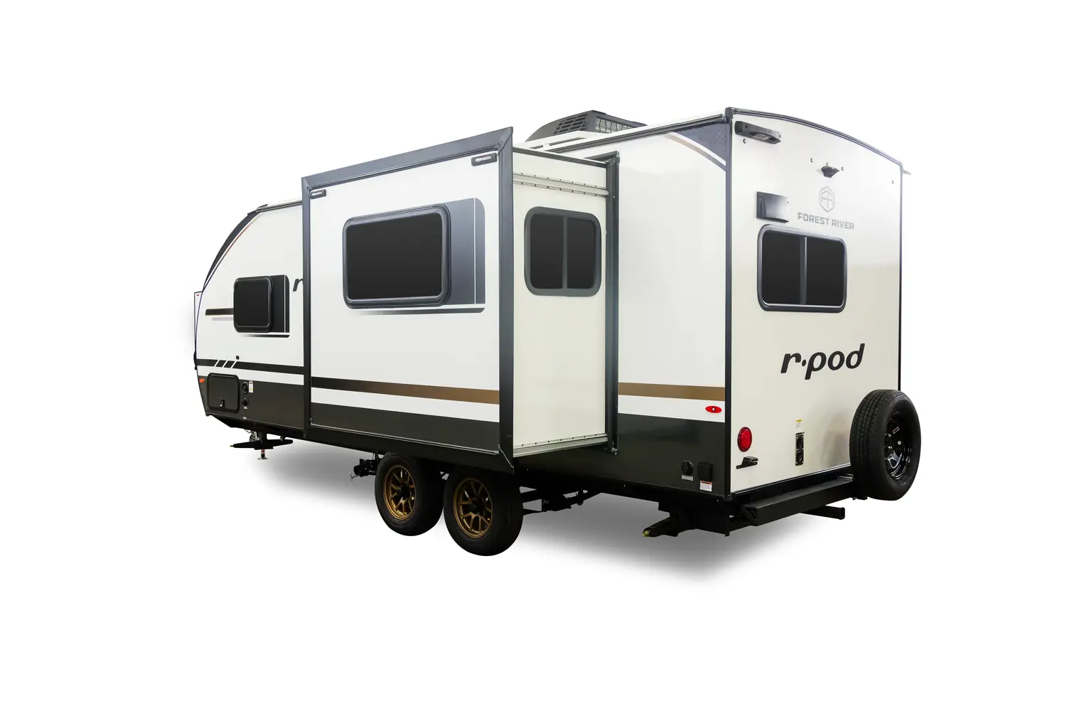 The RP-202 has one slideout and one entry. Exterior features 12 foot awning, upgraded tires with TPMS, outside kitchen, hot and cold spray port, on-the-go ladder prep, rear accessory hitch, on demand tankless water heater, 15,000 BTU air conditioner, enclosed underbelly with forced heat, and large roof mounted solar panel 30 amp controller & inverter prep. Interior layout front to back: foot-facing queen bed with wardrobe and end tables on each side, and entertainment center along inner wall; walk-through full bathroom with linen closet and night light; off-door side slideout with dinette and overhead cabinet (optional theater seat); door side fireplace with entertainment center, central vacuum, pantry, and entry; rear kitchen with refrigerator, sink, cooktop, convection microwave, and overhead cabinet.