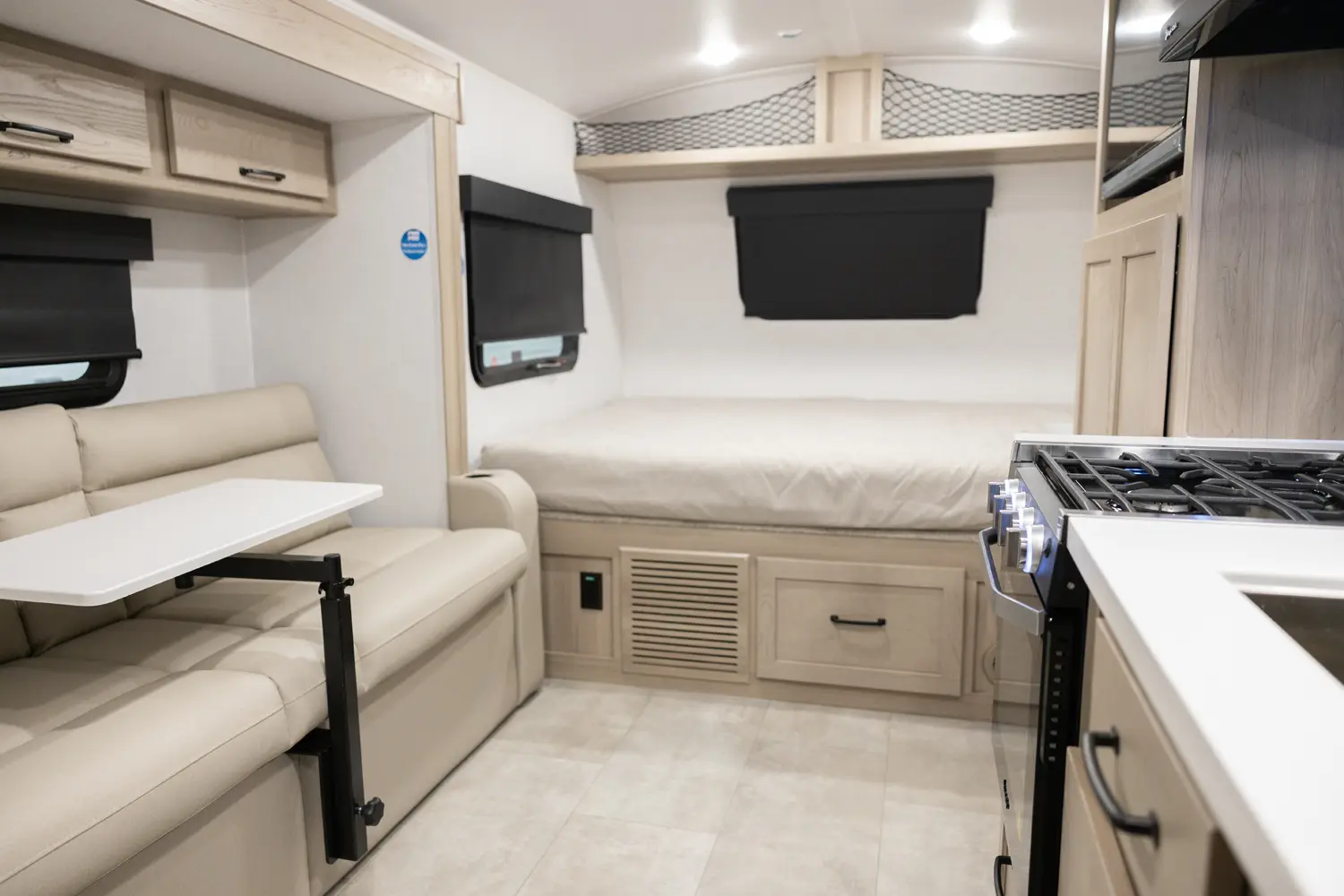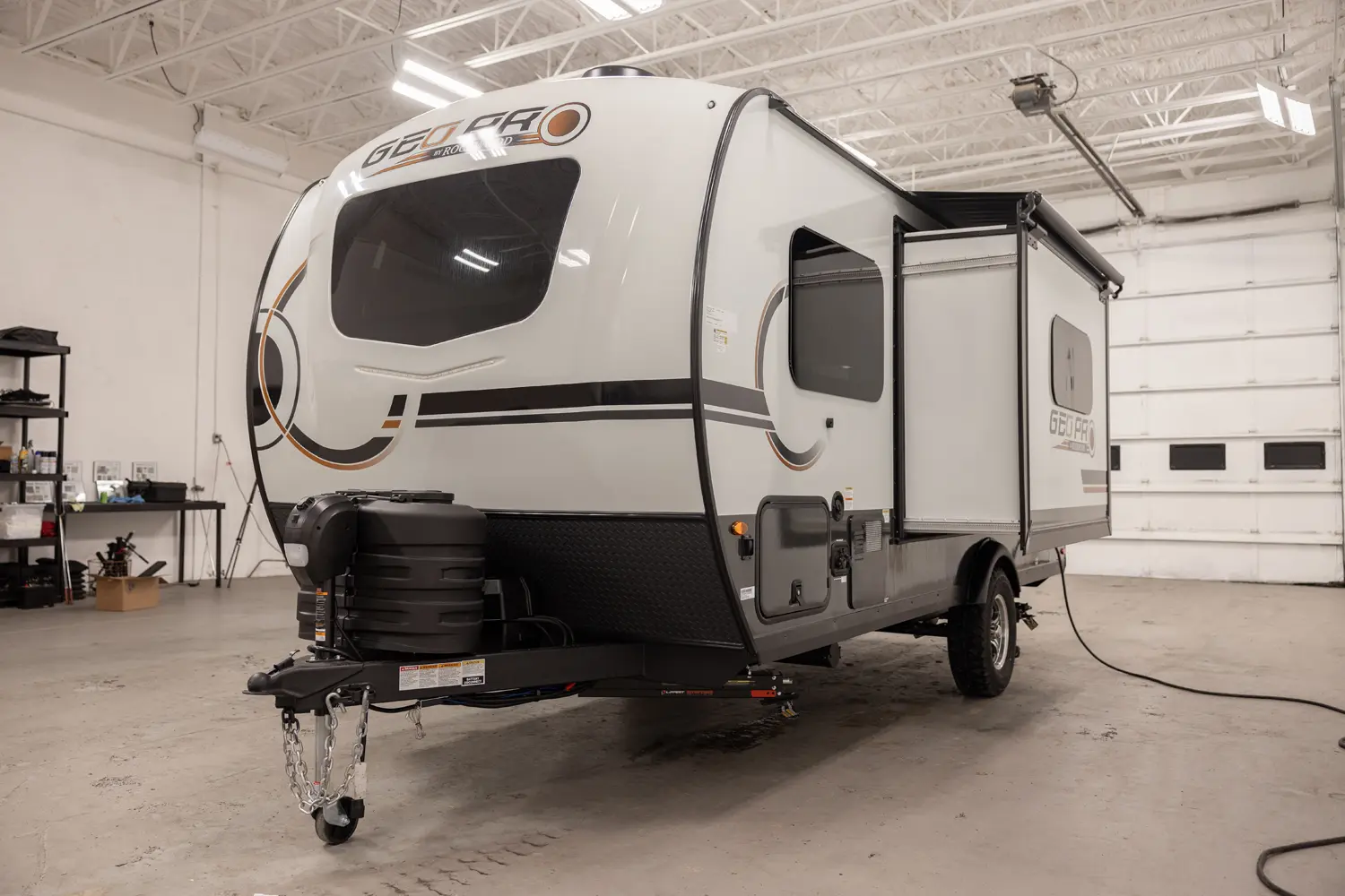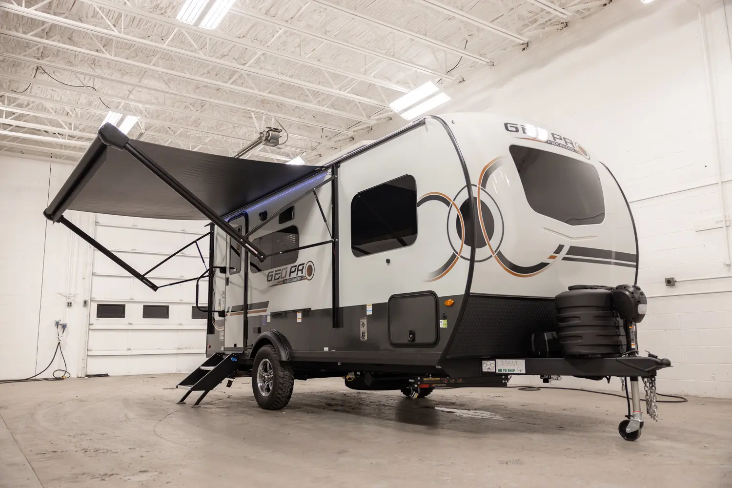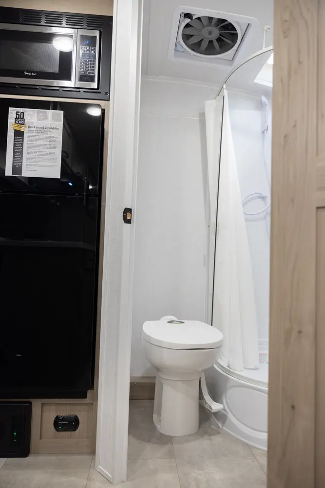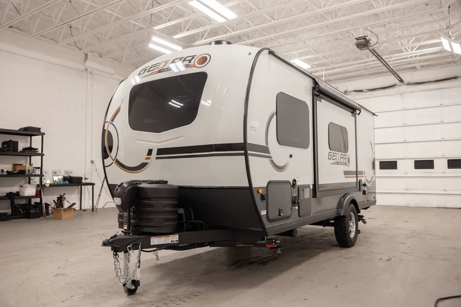 The Rockwood Geo Pro G19FBS is a rear entry couples coach with a small slide that offers so much great space. The large bathroom is one of the best features of this small couples coach. The 72” pull-out sofa also makes for a great bed for guests, children or pets. At 20’ and light weight, you will not be able to get more walk around footage than this great couples coach.