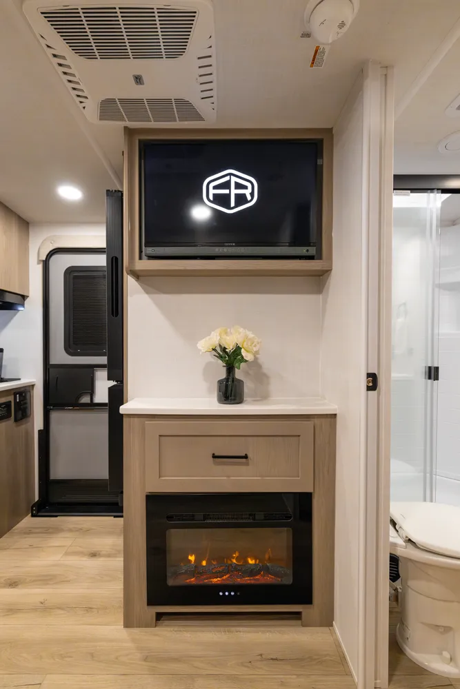 The 2506FK blends spacious comfort with smart design for a great value. The front kitchen offers abundant counter space and storage, perfect for meal prep and entertaining. The U-shaped dinette provides a roomy dining area that can convert to extra sleeping space. (optional Hide-a-Bed or Theater seating) The pass-through bathroom comes equipped with a large rectangular shower, and the rear bedroom gives you a private retreat on the road.