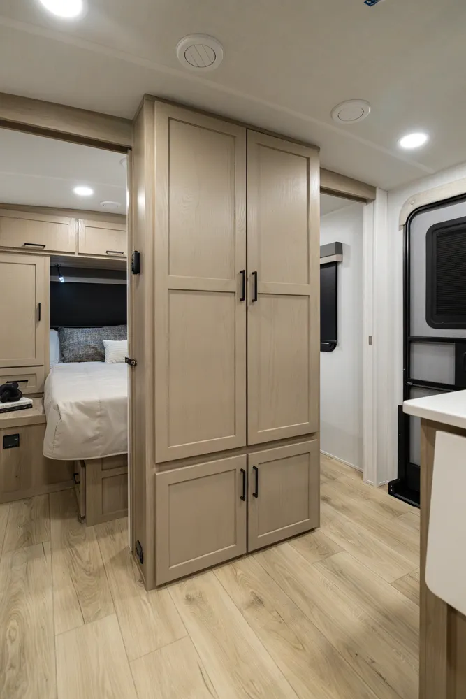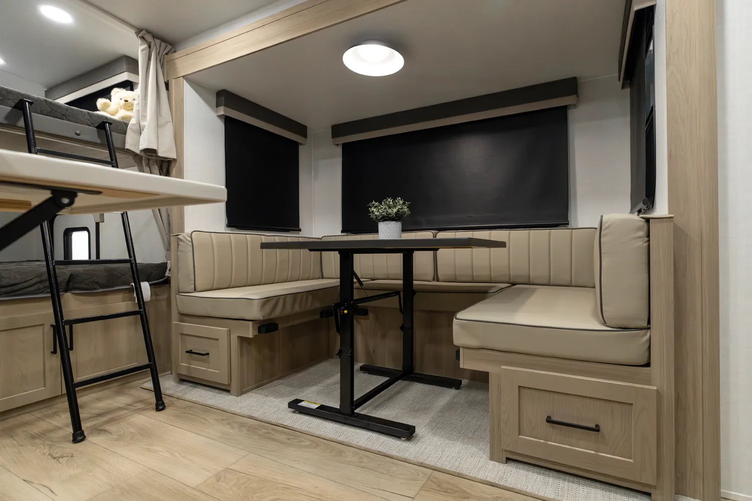 The 2520BH is a bunkhouse layout featuring a segregated front bedroom with a true queen bed and dual wardrobe closets for plenty of personal storage. In the main living area, you'll find a large U-shaped dinette, a spacious kitchen and two 36" x 71" bunks- perfect for kids or guests. This layout blends privacy, comfort, and roominess. An ideal setup for families and groups seeking versatile space on the road.