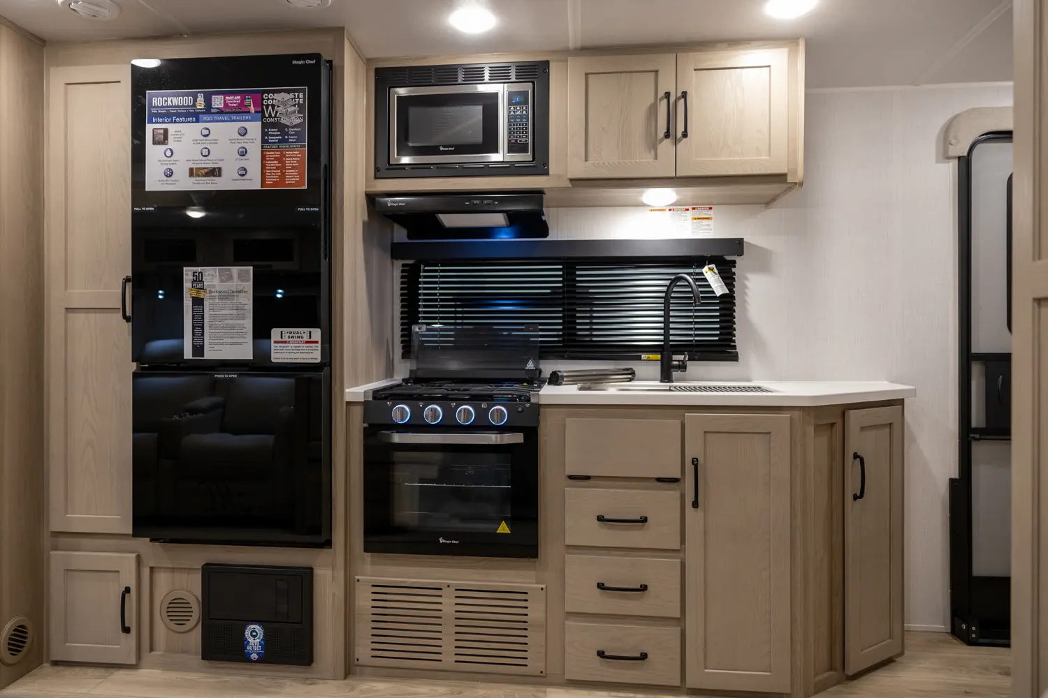 The Rockwood Roo 235S has one entry and one slide out. Exterior features include: fiberglass exterior, 18' awning and outside kitchen.